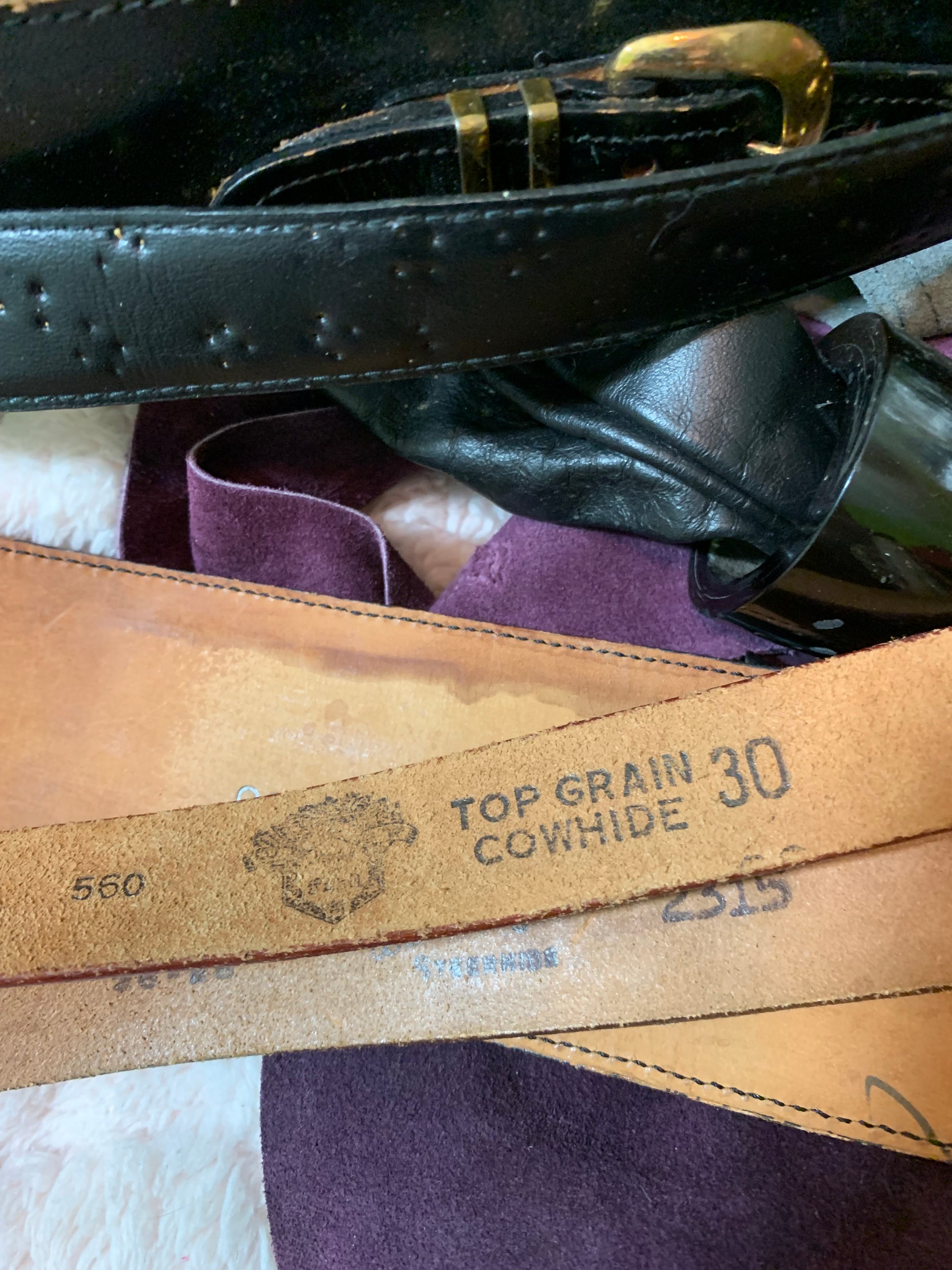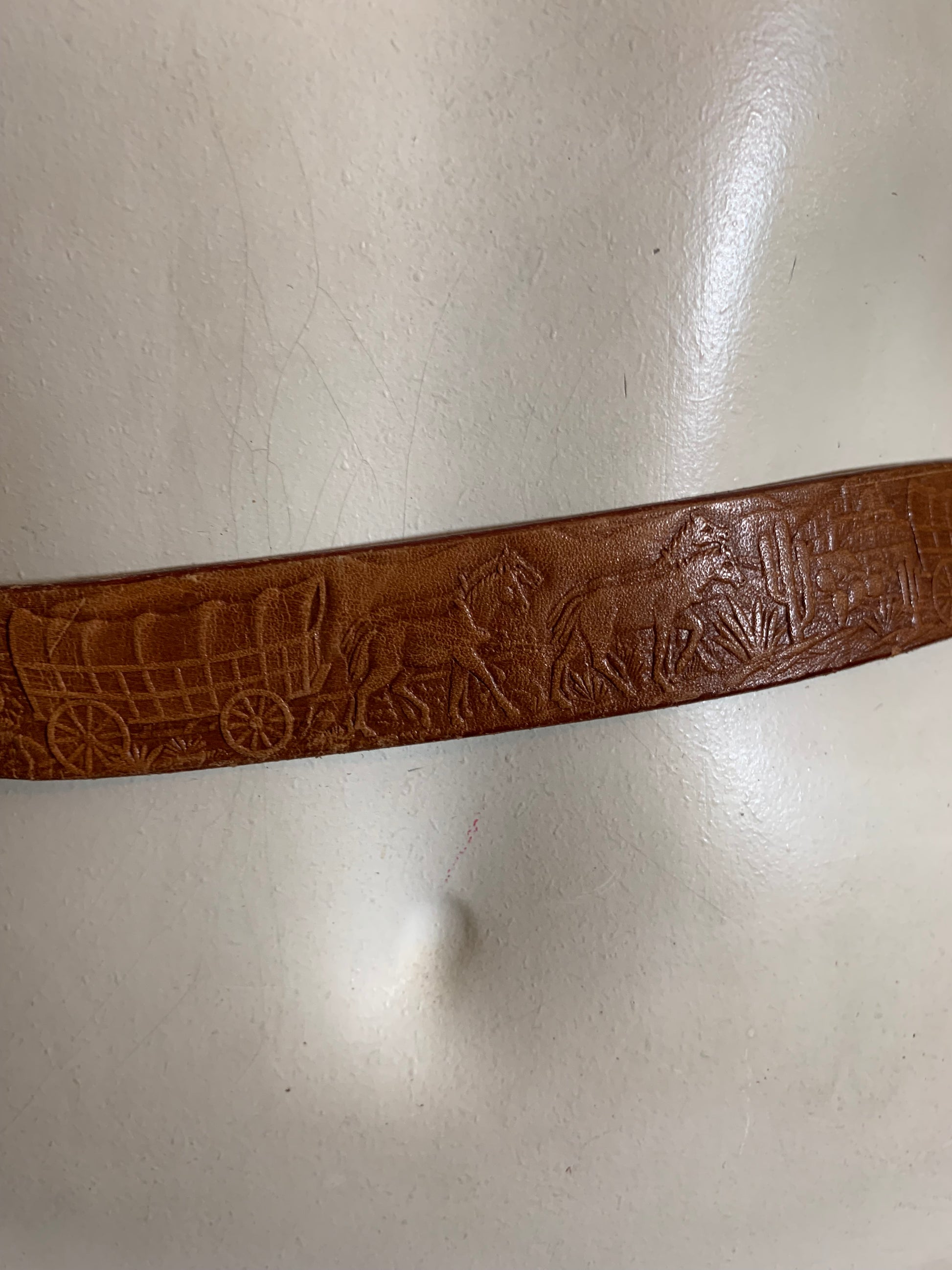 Terra cotta brown tooled Western leather belt from the 1940s or 50s. Super cool silver tone metal buckle and cowboy on horse with red rhinestone!