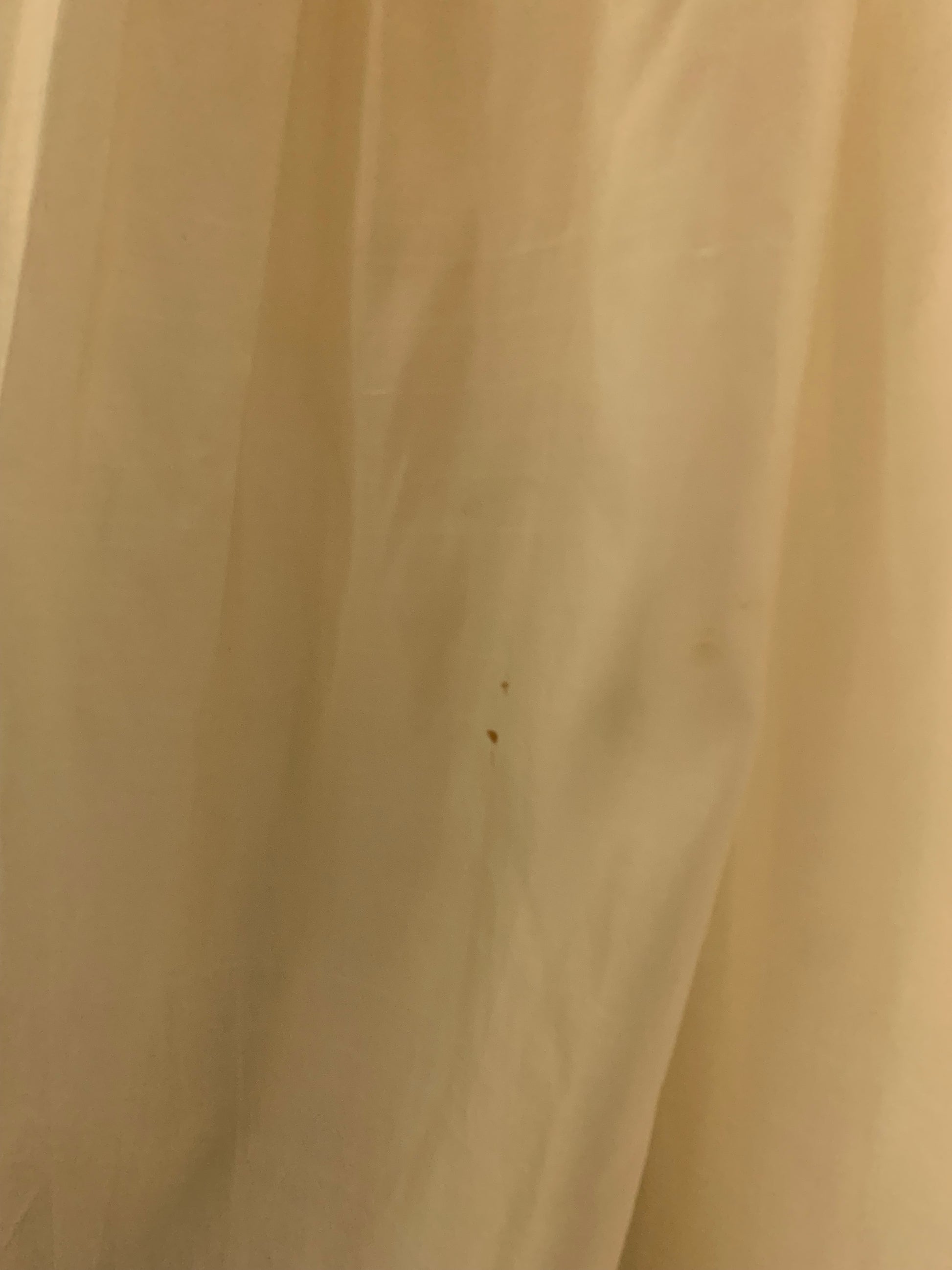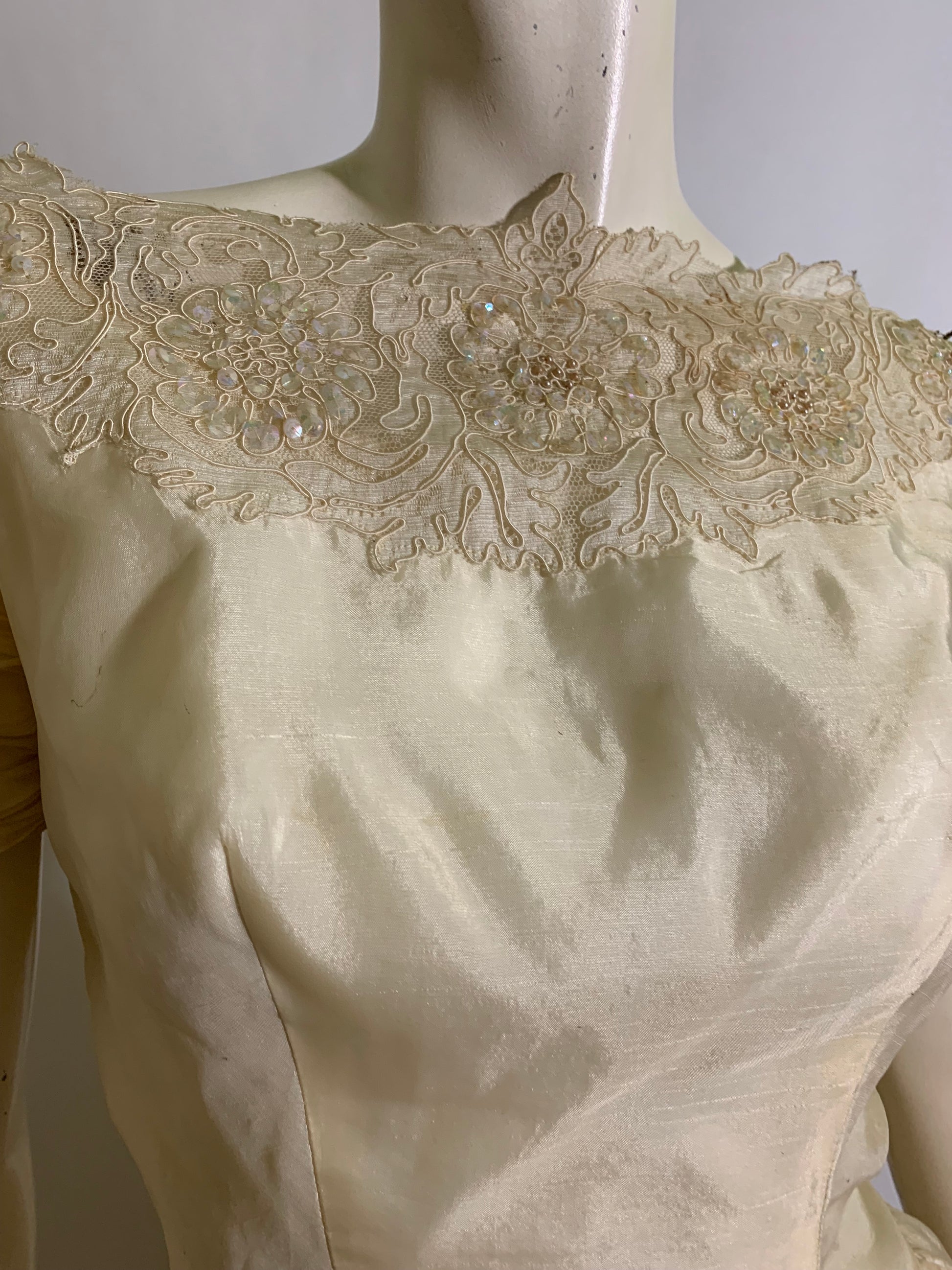 1950s ivory organza wedding dress with sequined detail on skirt and neckline- lovely shirred sleeves, bridal buttons up back and accents around back of waist. Absolutely huge full skirt. A few spots as shown. No label.