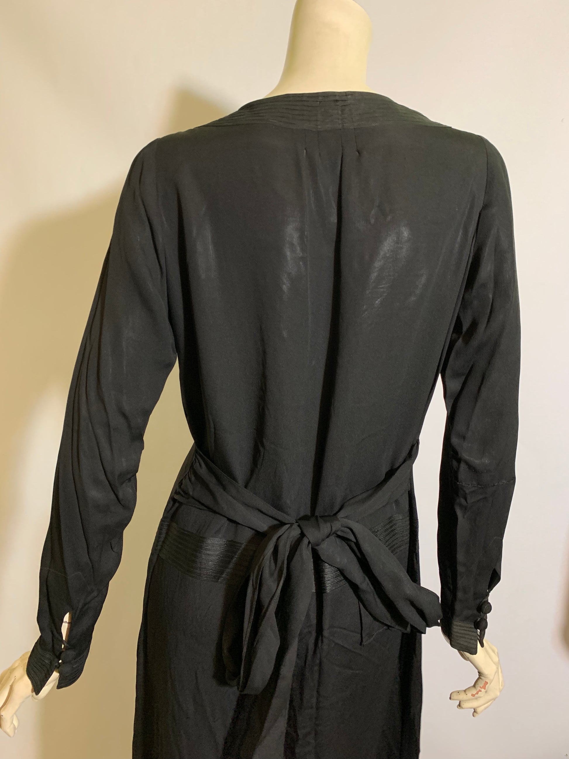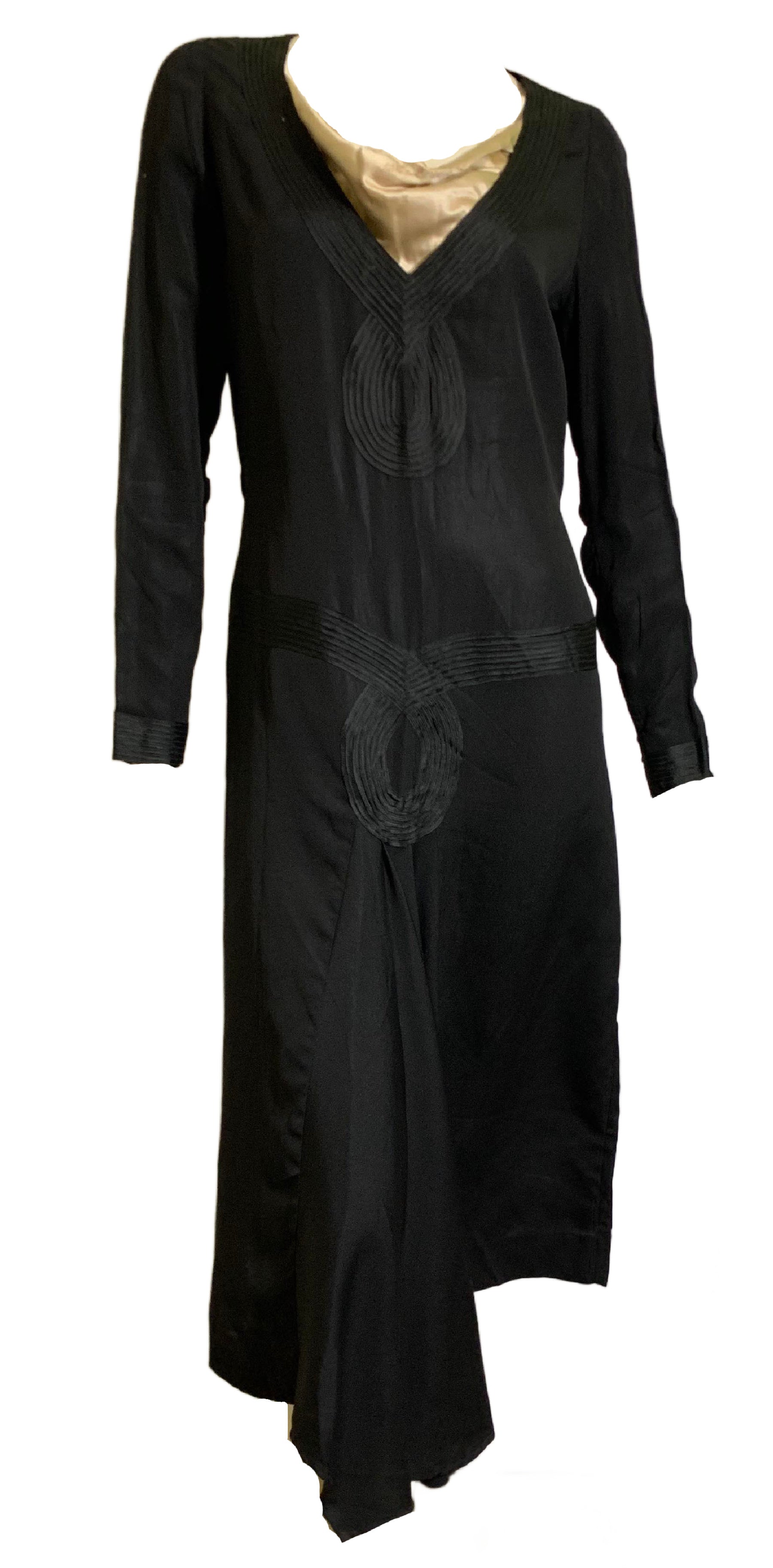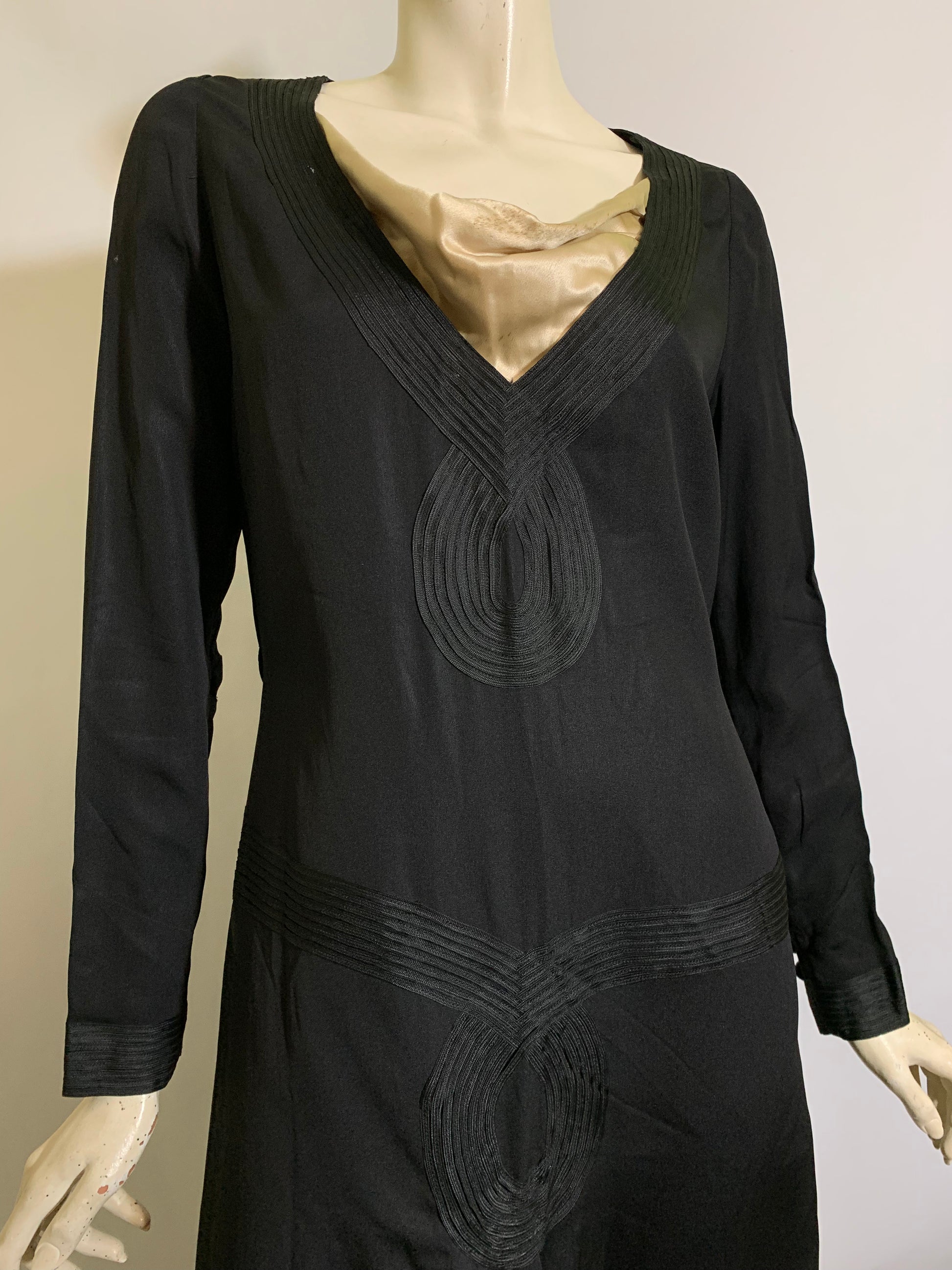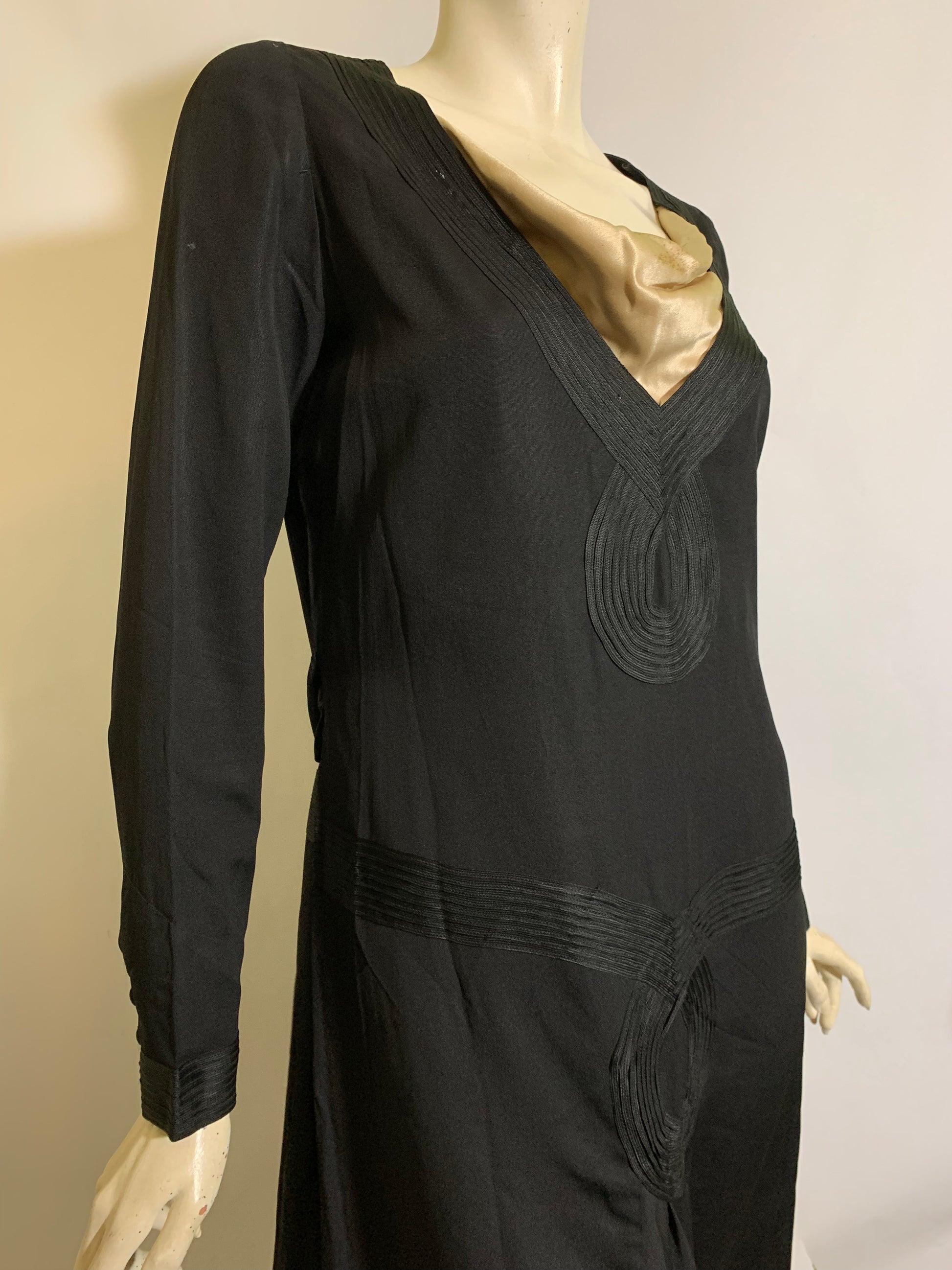 Black weighted silk 1920s dress with ivory neckline inset, soutache trim on bodice and waist- off center peaked pleat dropping to hem. Half sash ties in back, covered button/loop closure at wrists. Some spots on ivory silk neck inset. No label. Sturdy and wearable!