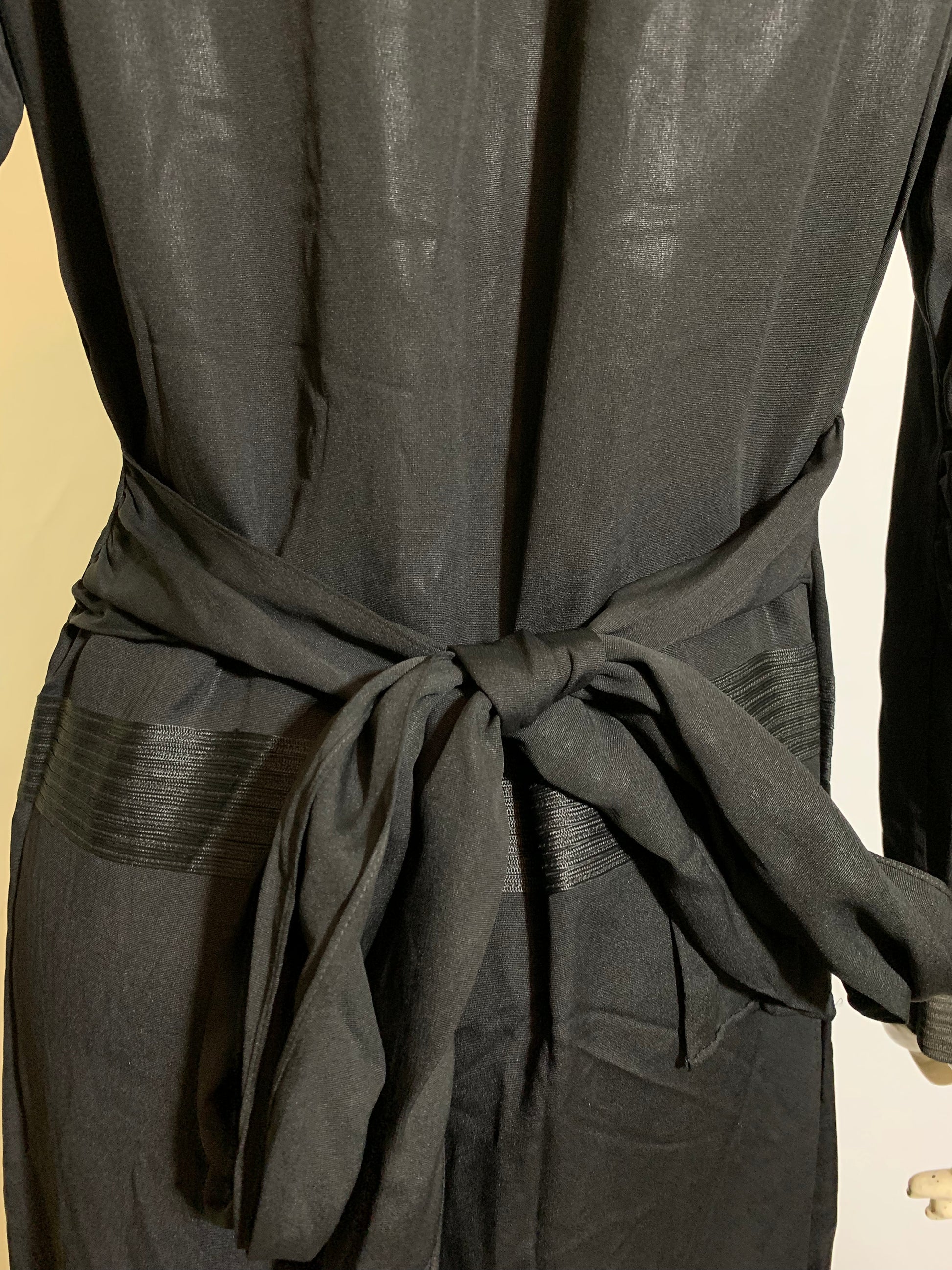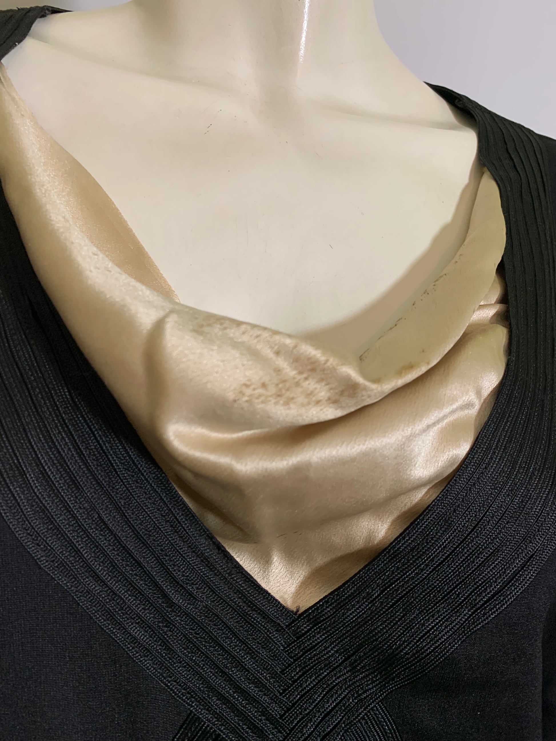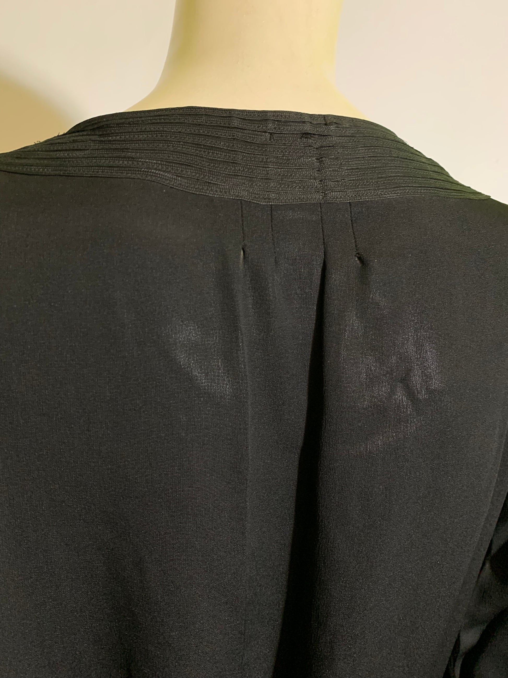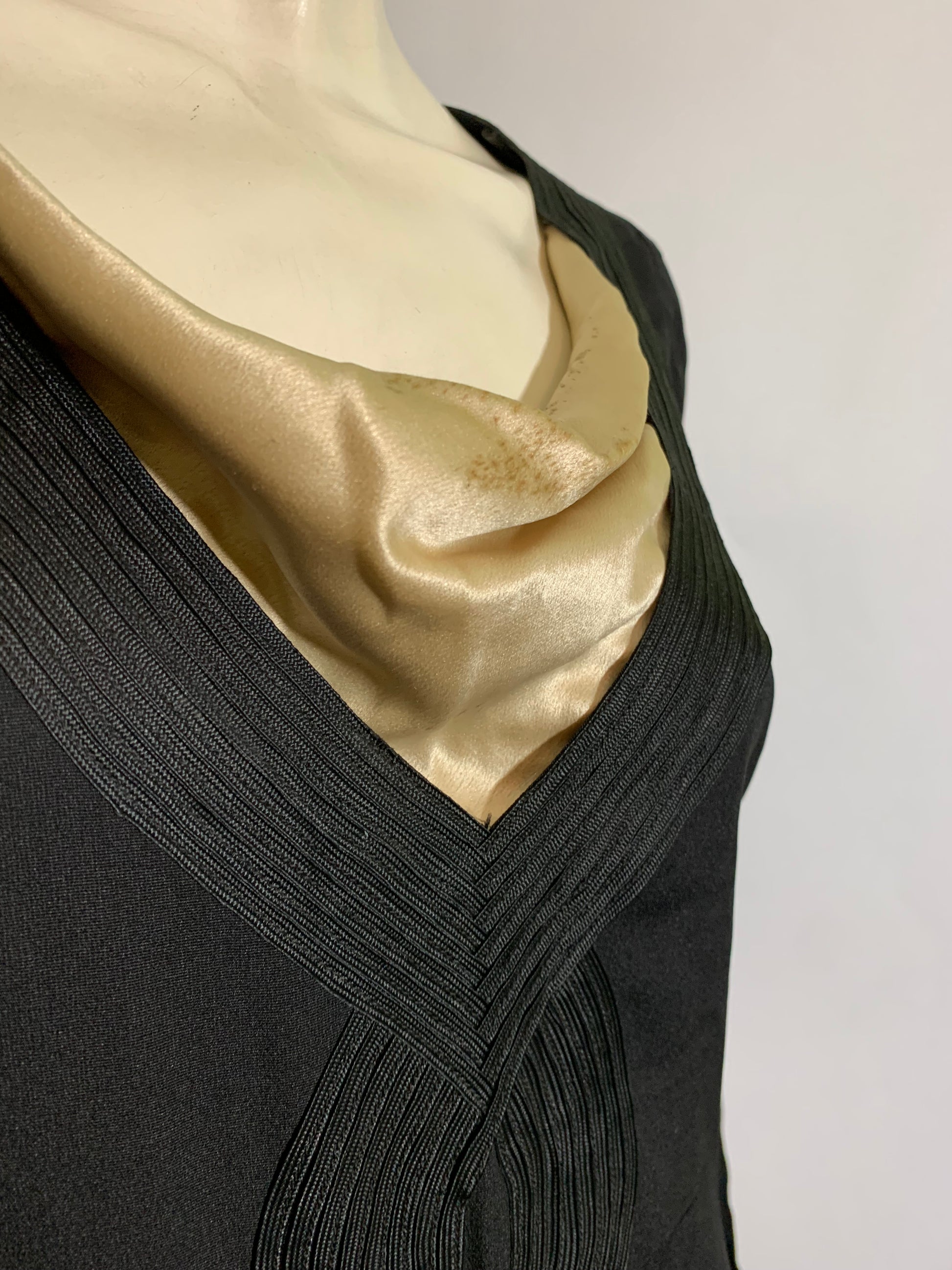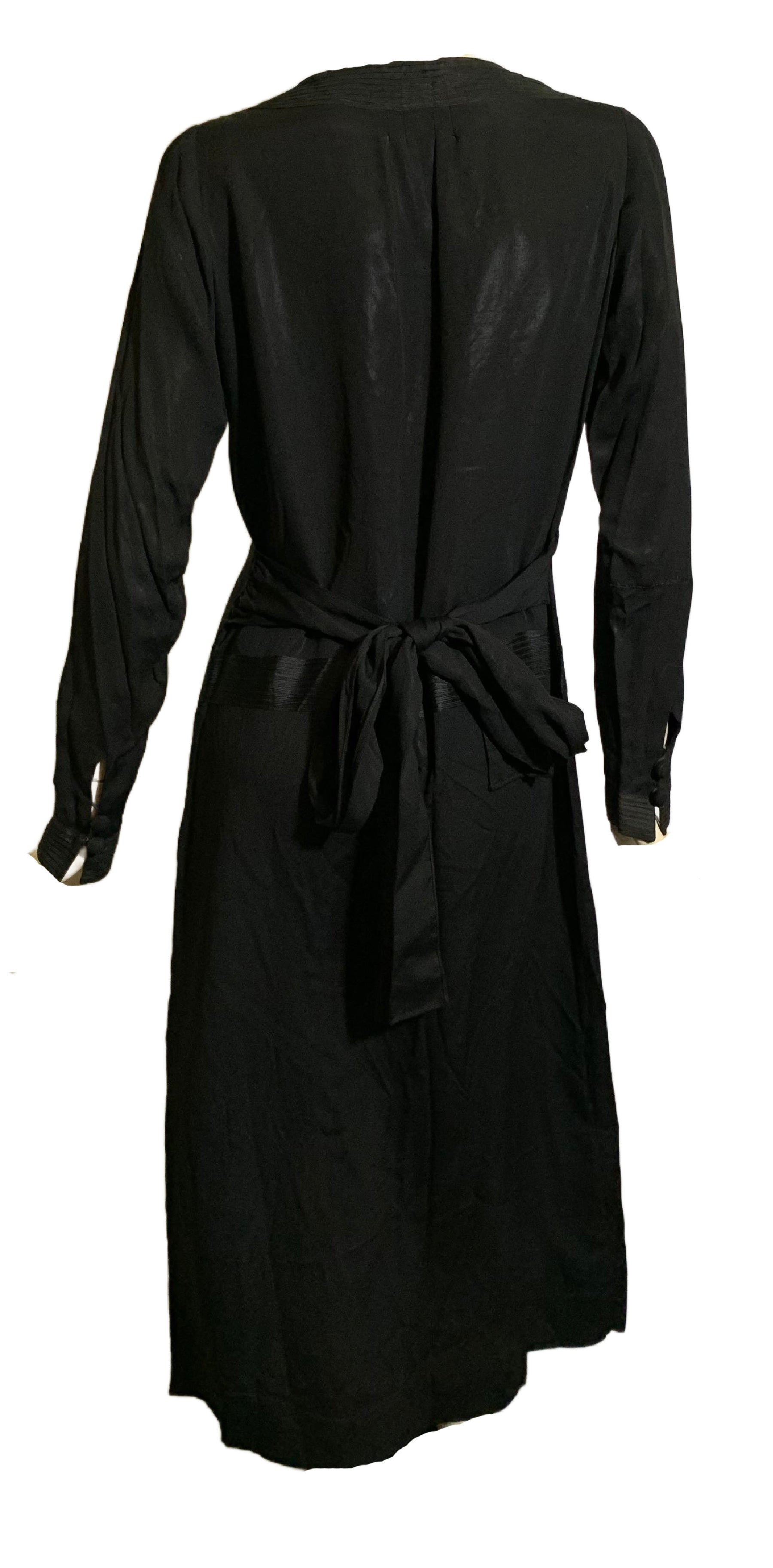 Black weighted silk 1920s dress with ivory neckline inset, soutache trim on bodice and waist- off center peaked pleat dropping to hem. Half sash ties in back, covered button/loop closure at wrists. Some spots on ivory silk neck inset. No label. Sturdy and wearable!