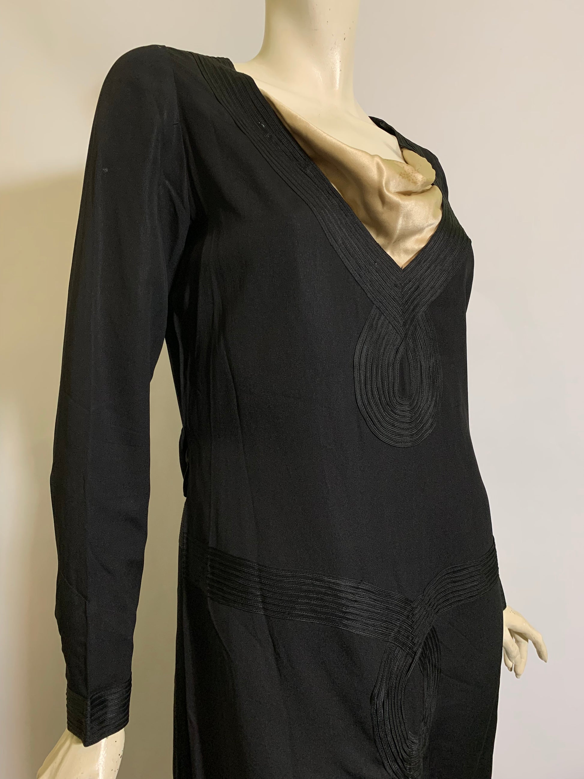 Jet Black Soutache Trimmed Dropped Waist Silk Dress circa 1920s