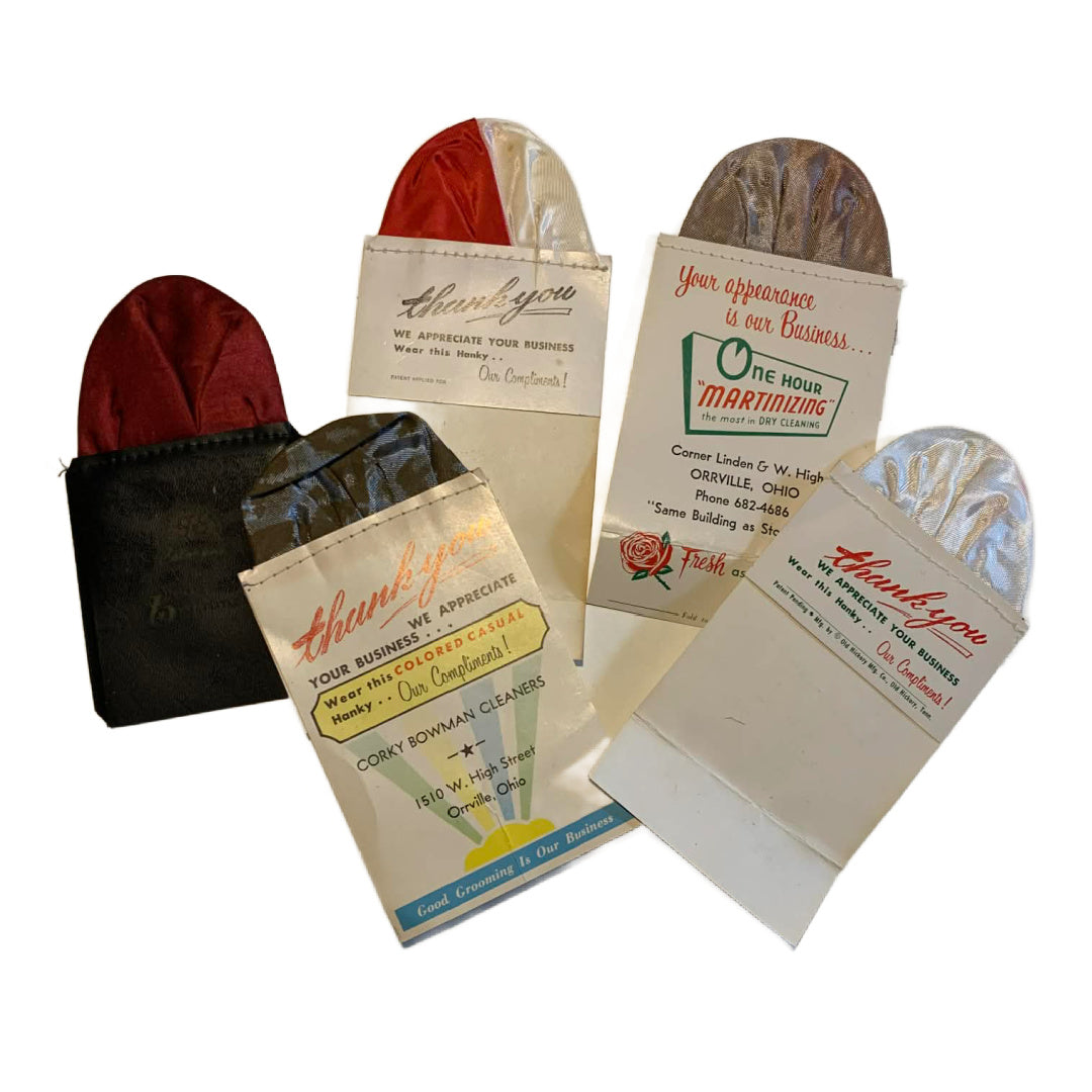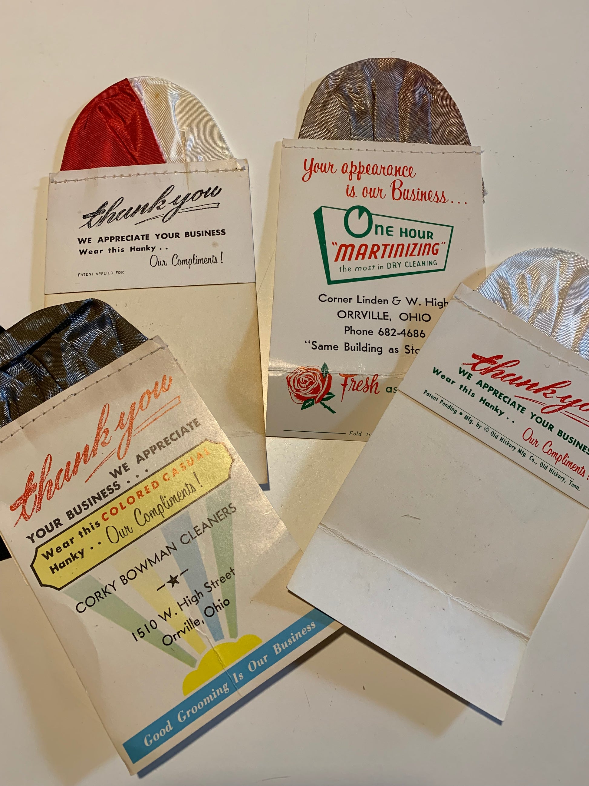 Charming 1960s pocket hankies in acetate, on dry cleaning adverts. 5 total. Can be removed to sew into suit pocket if desired.