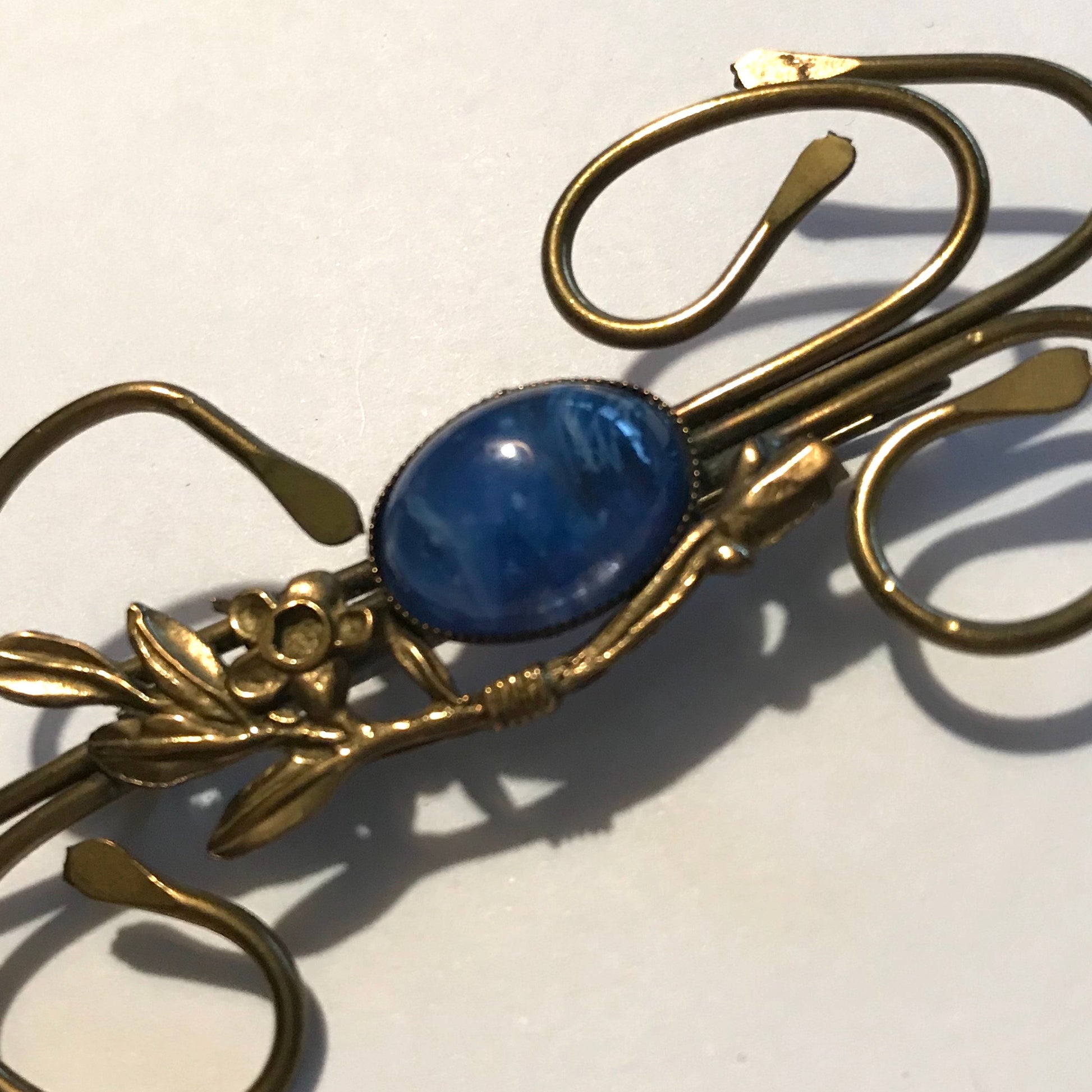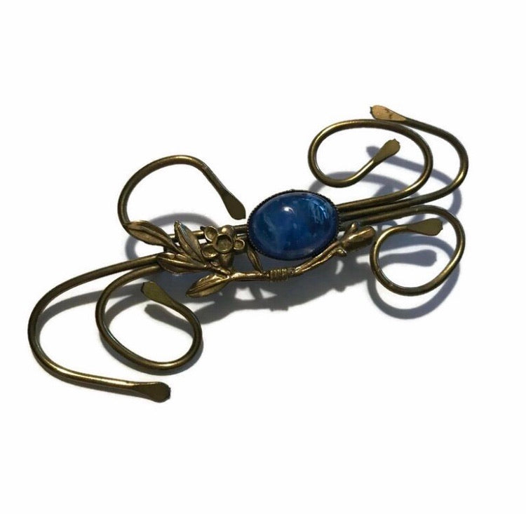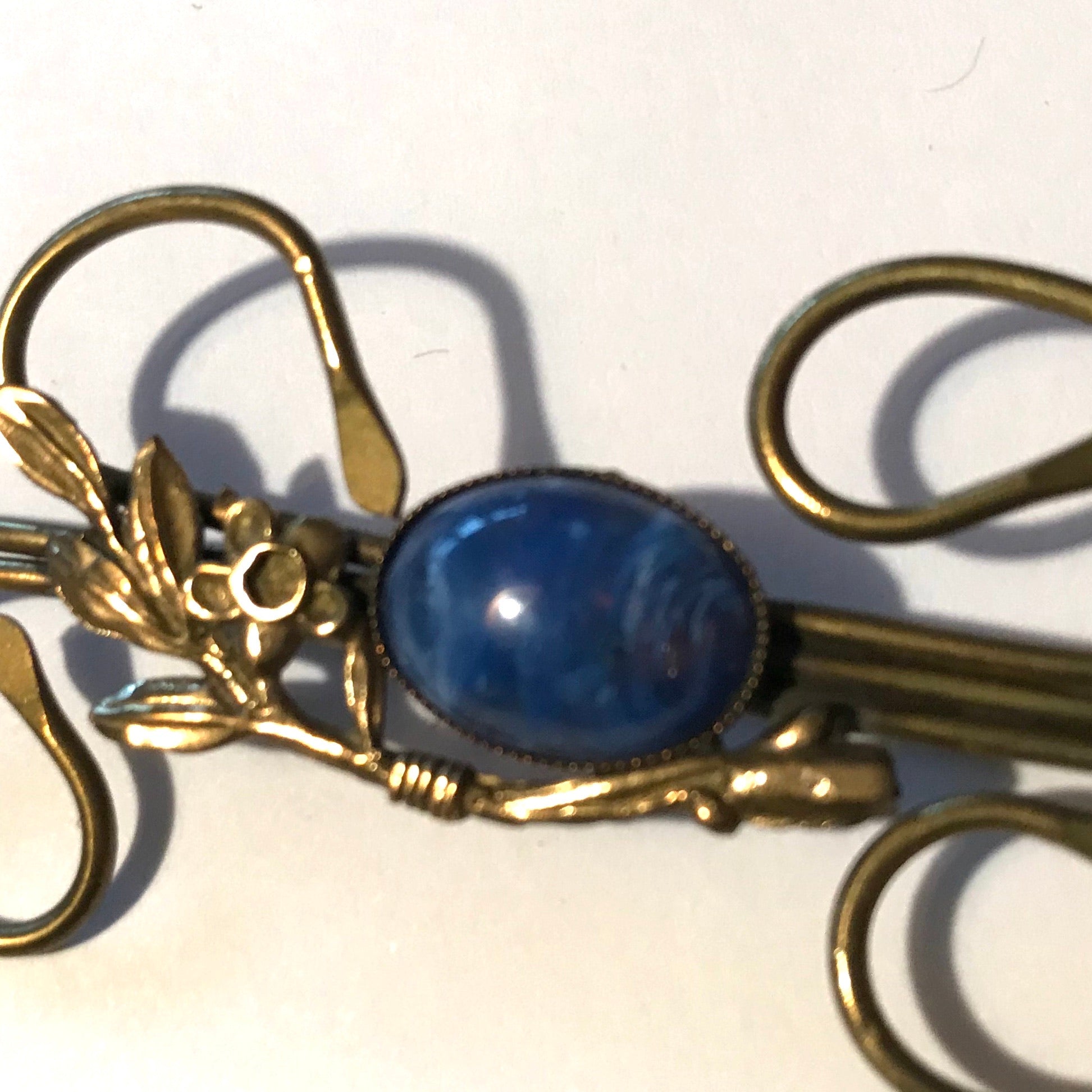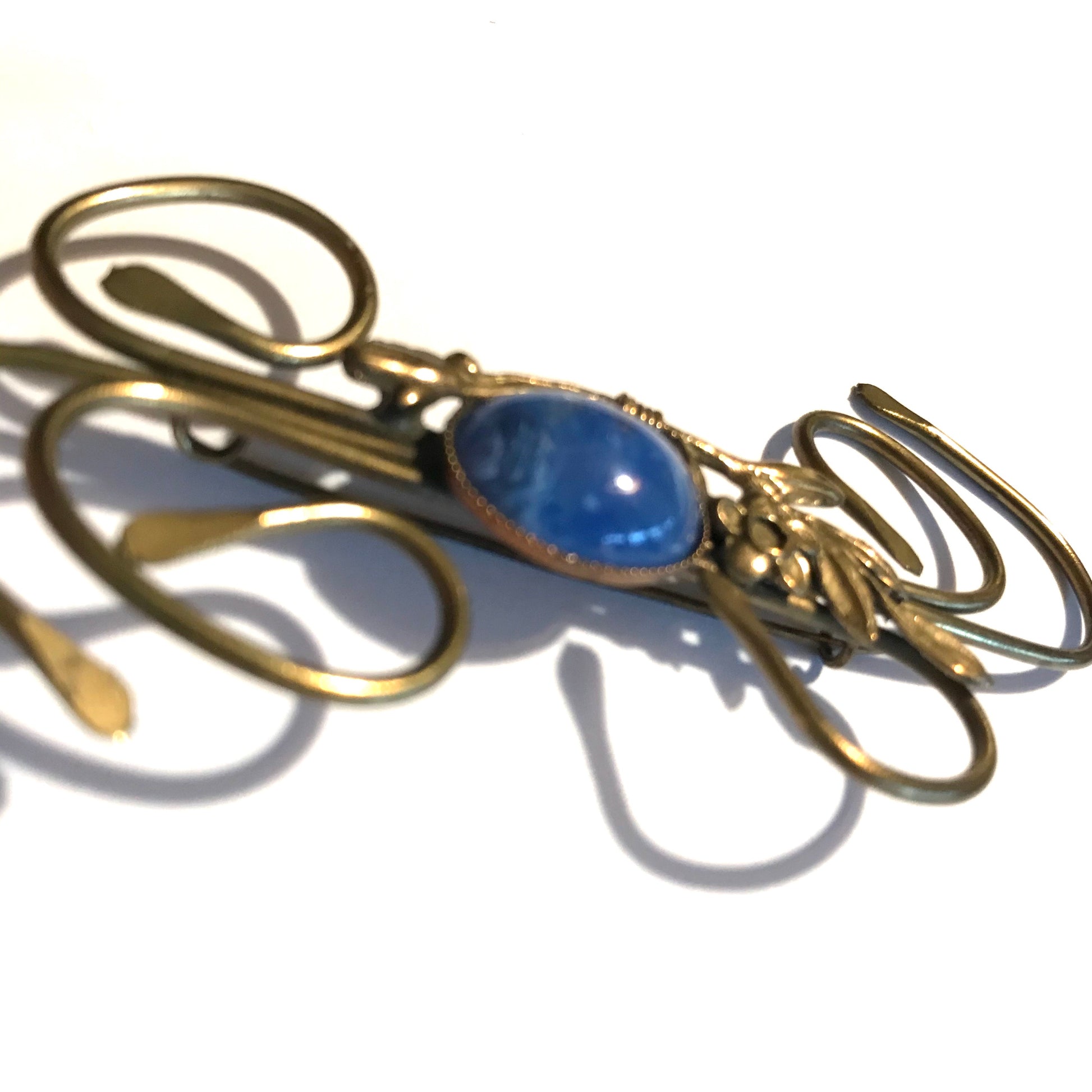 Art Nouveau floral design statement brooch from the early 1900s. Gold tone metal sprawling, vining stems set off tiny flower clusters framing a striated blue art glass cabochon. C-clasp. No markings, no flaws. 4” wide by 1 1/4”.
