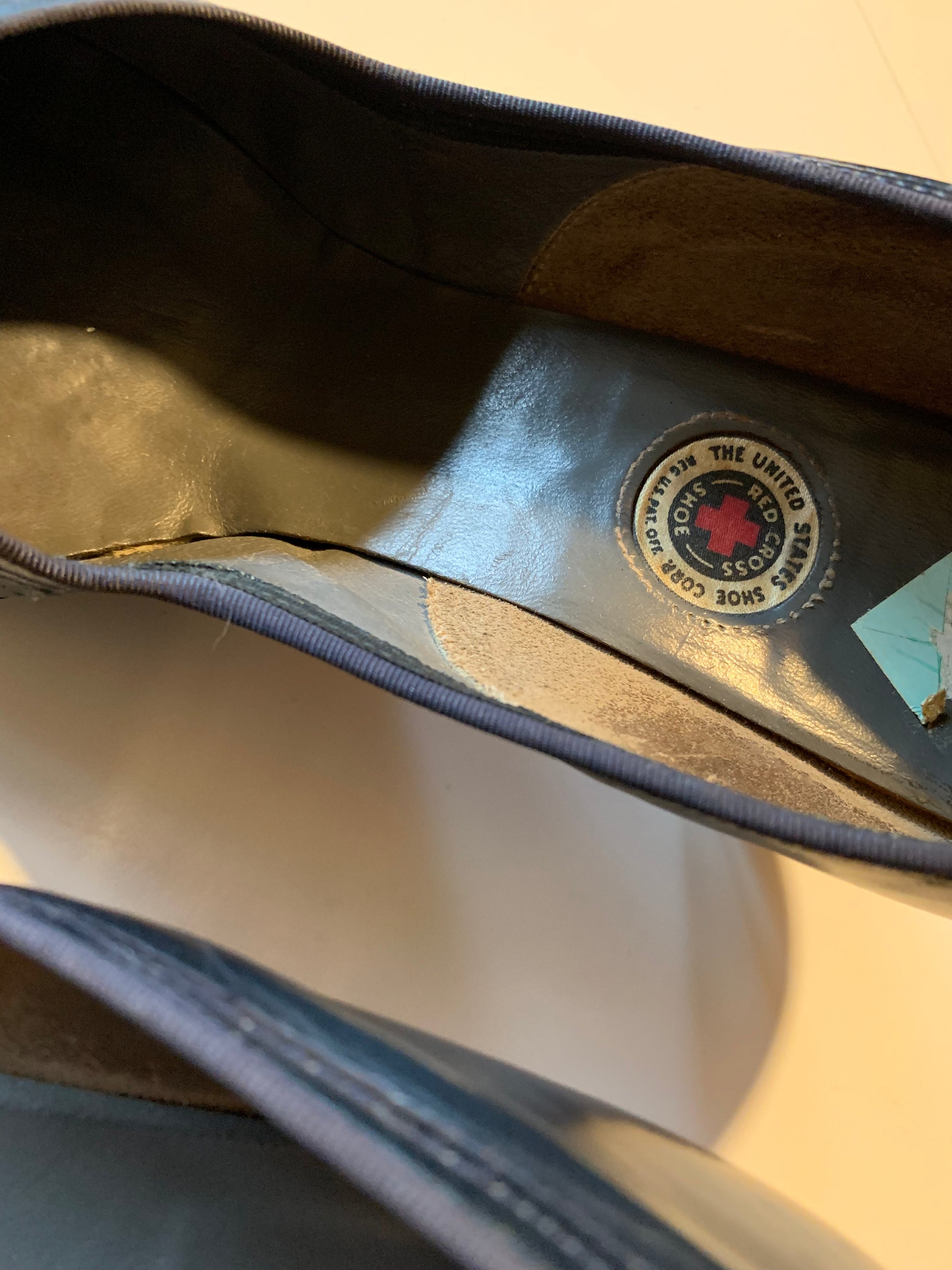 Lovely deep blue leather Red Cross high heel shoes with peep toe, studded "barrel" accent on vamp. Minor wear. US 8 avg best fit.