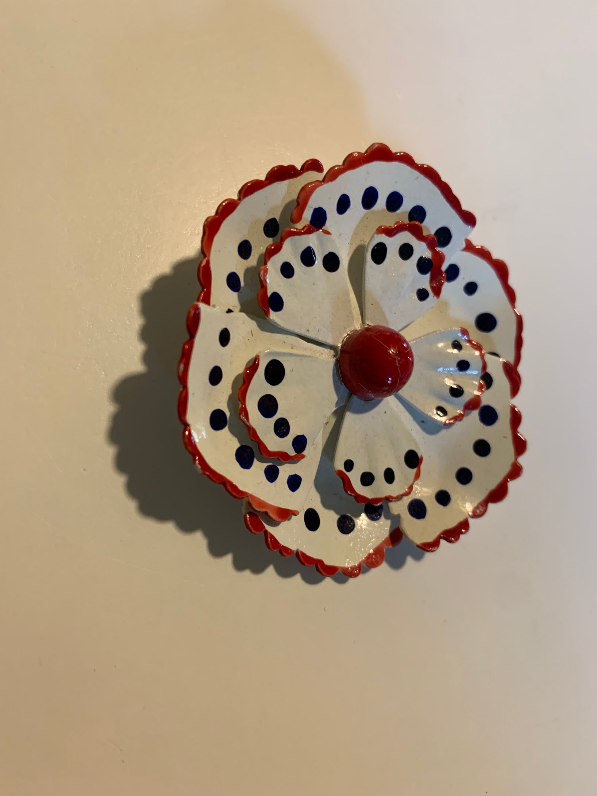 White enameled flower brooch with red and blue accents. 2 1/4". Made in Germany, no flaws.