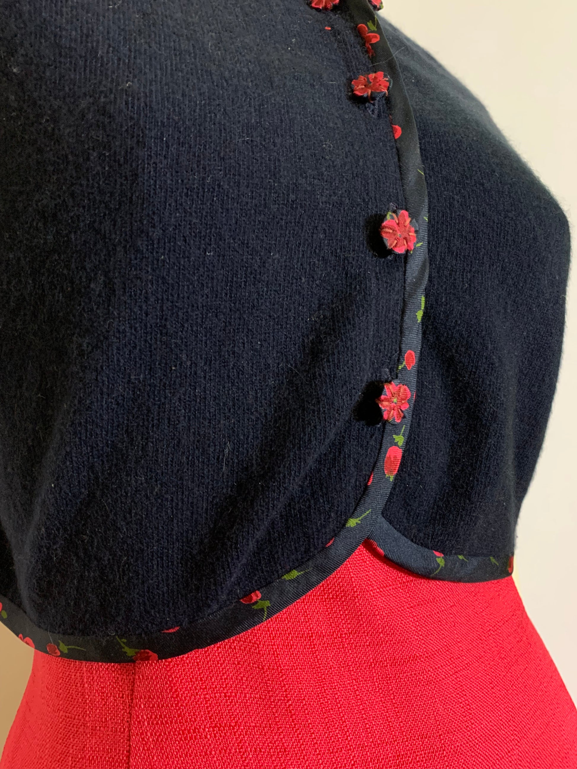 Delightful peony pink linen weave rayon dress with 2 tops- a boxy cut matching jacket with bow at neck, and a sweet deep blue cropped sweater with pink flower print fabric buttons and piping. Dress has acetate bodice, metal zipper at back of waist, hook and eye and back of bodice. By Adele Martin. No flaws.
