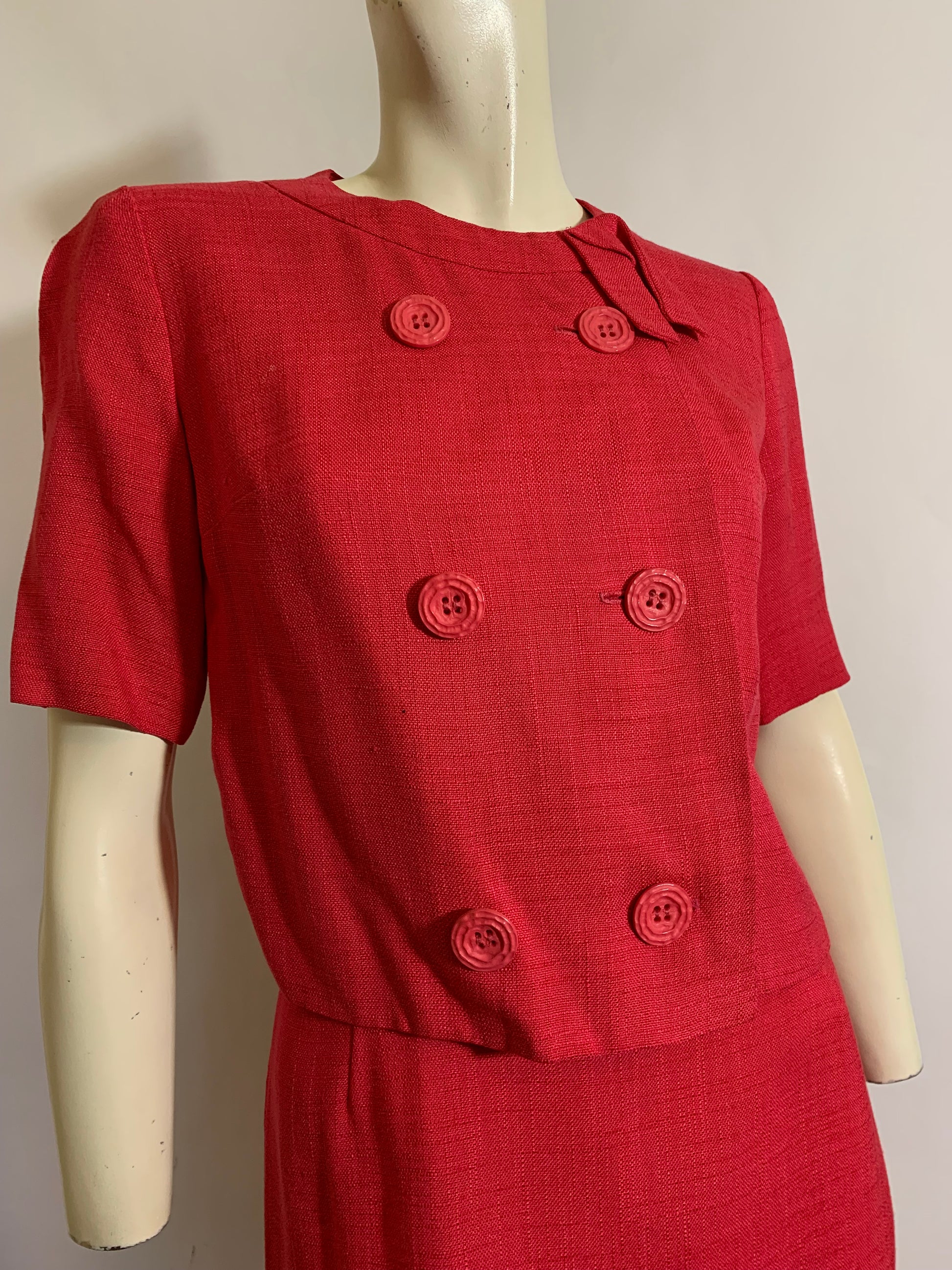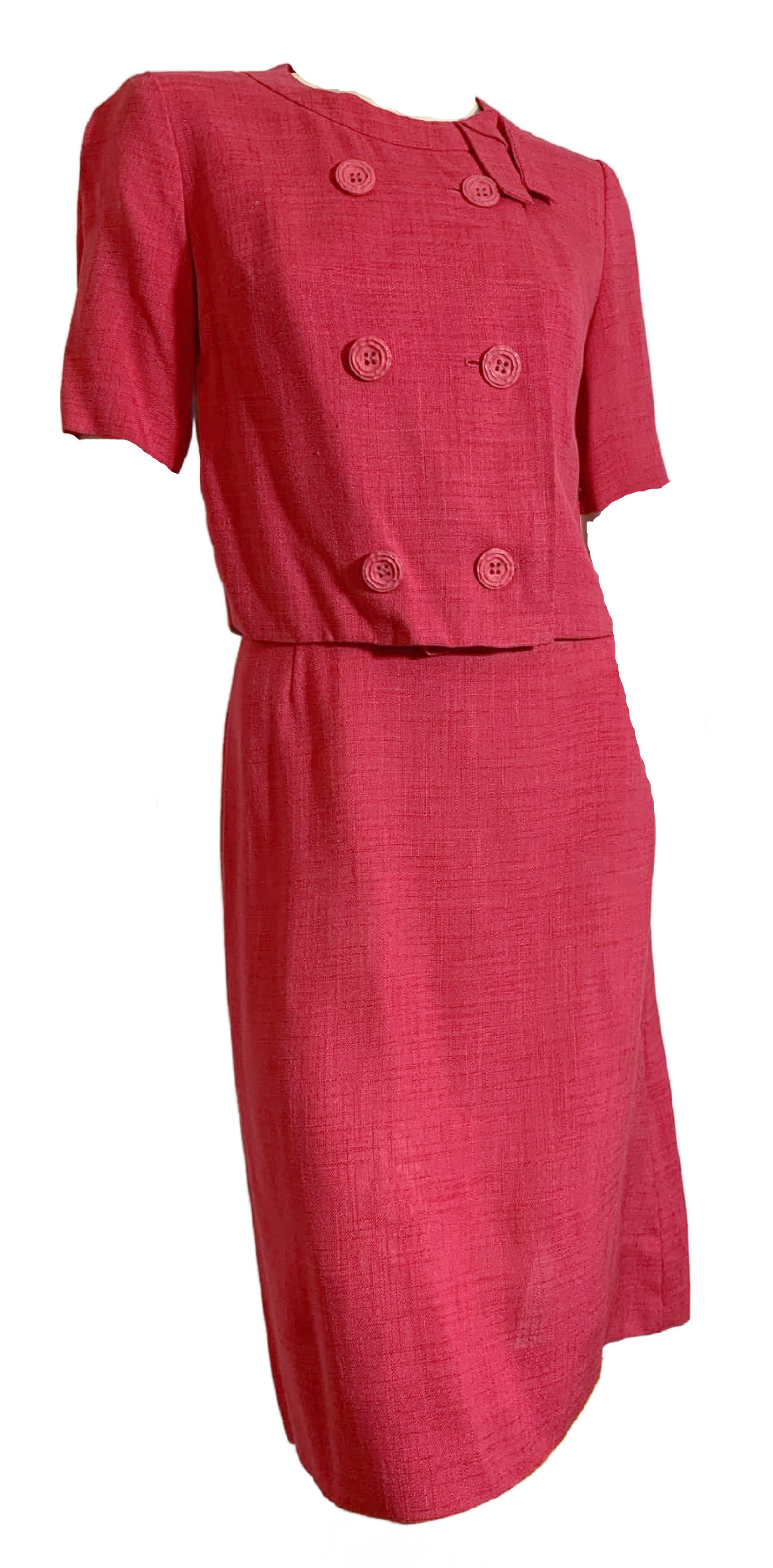 Peony Pink Linen Look 3 Pc Dress Set with Sweater circa 1960s