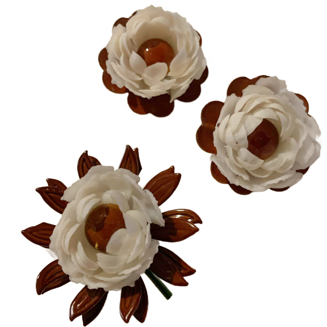 Plastic Brown and White Flower Earrings and Brooch Demi Parure Set circa 1960s