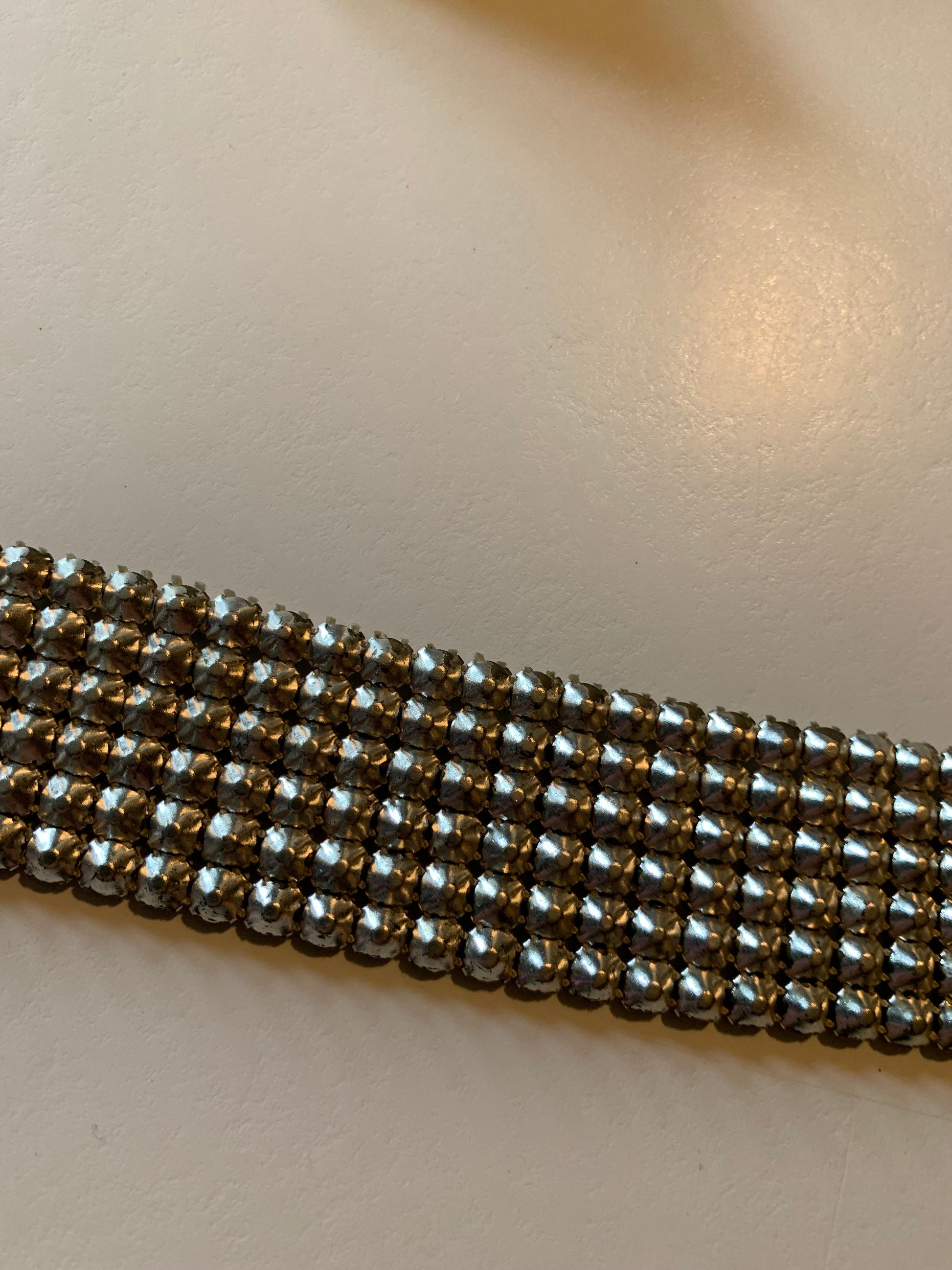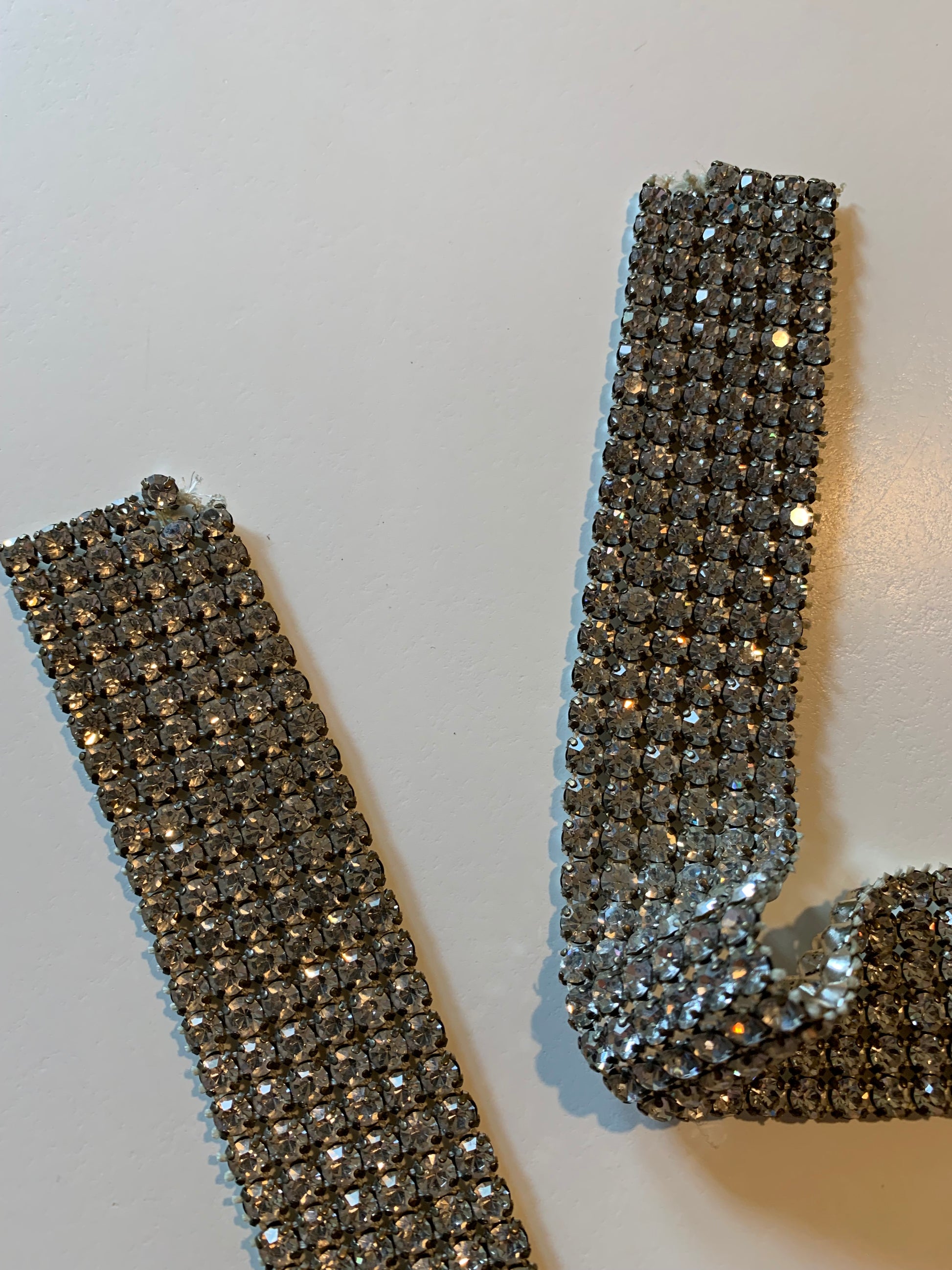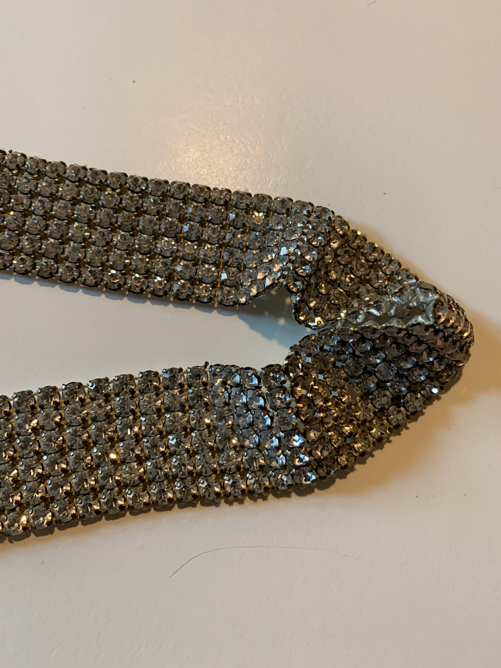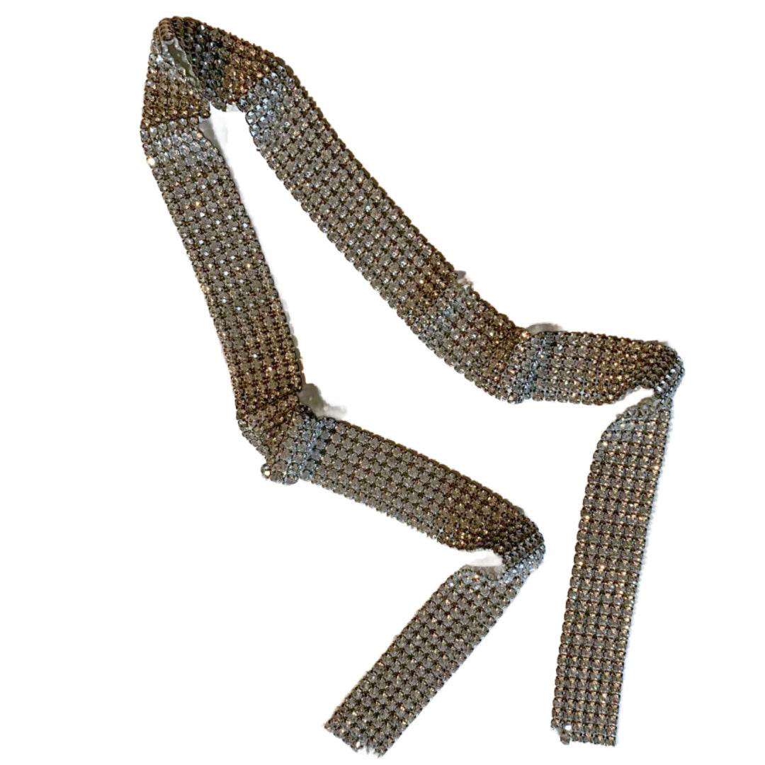 Silver tone mesh metal trimming from the 1950s with bright clear prong set rhonestones. 38" by 1 1/4"- one small tear