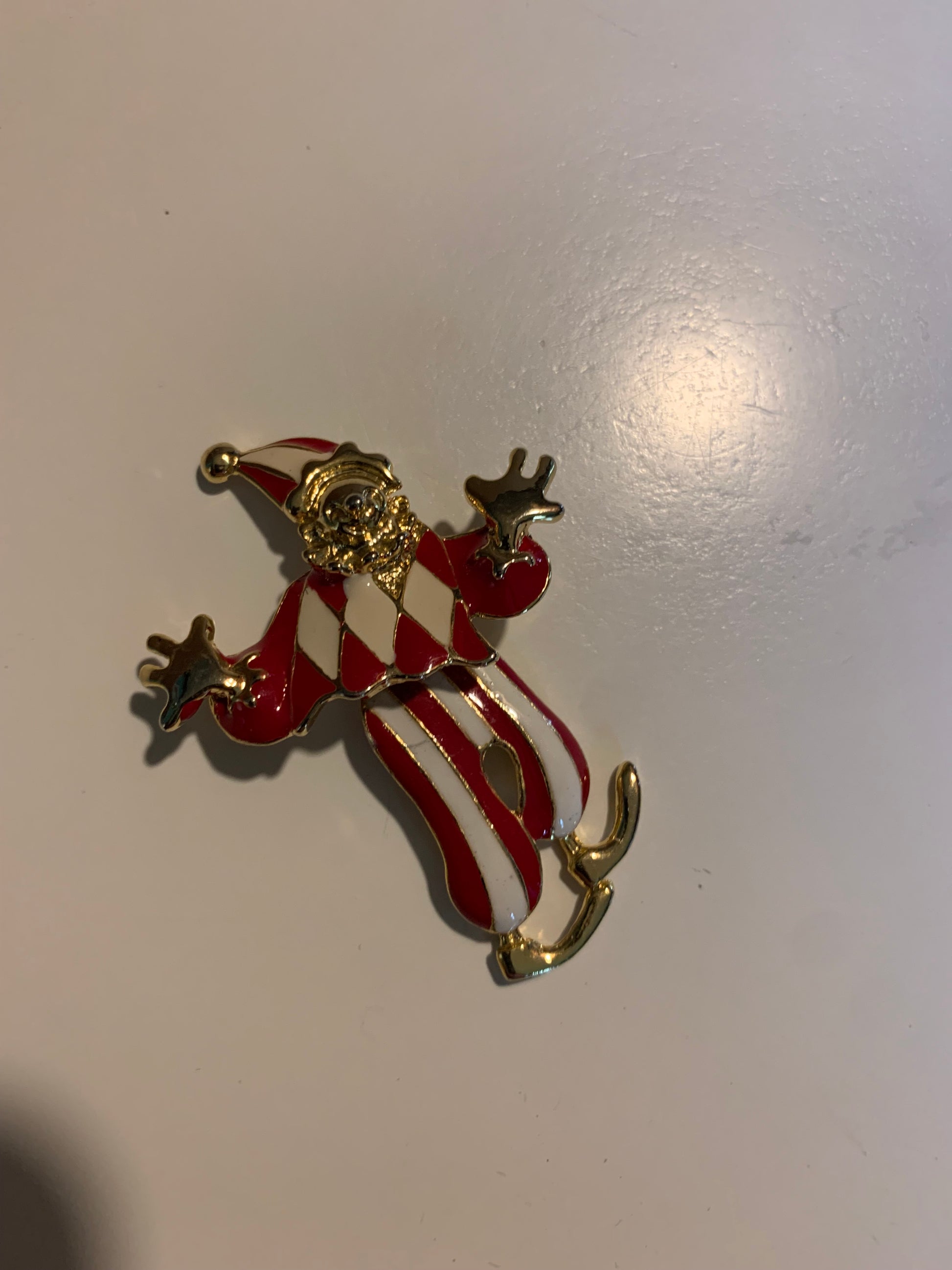 Red and white enameled gold tone metal jester brooch with dangling/dancing legs! 2" long, no markings, no flaws.