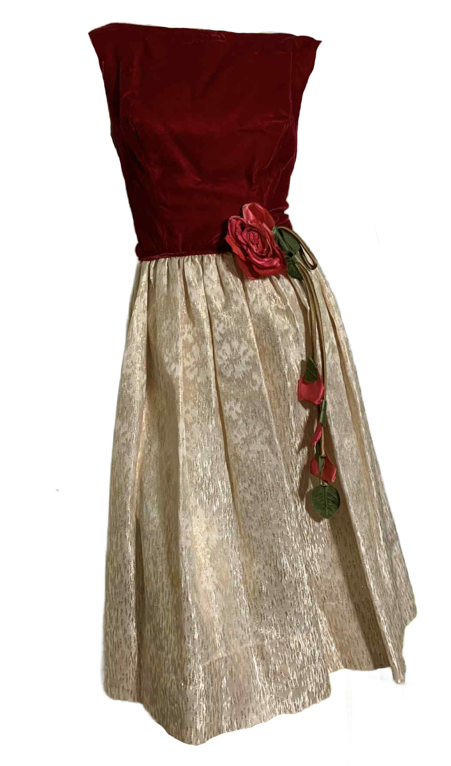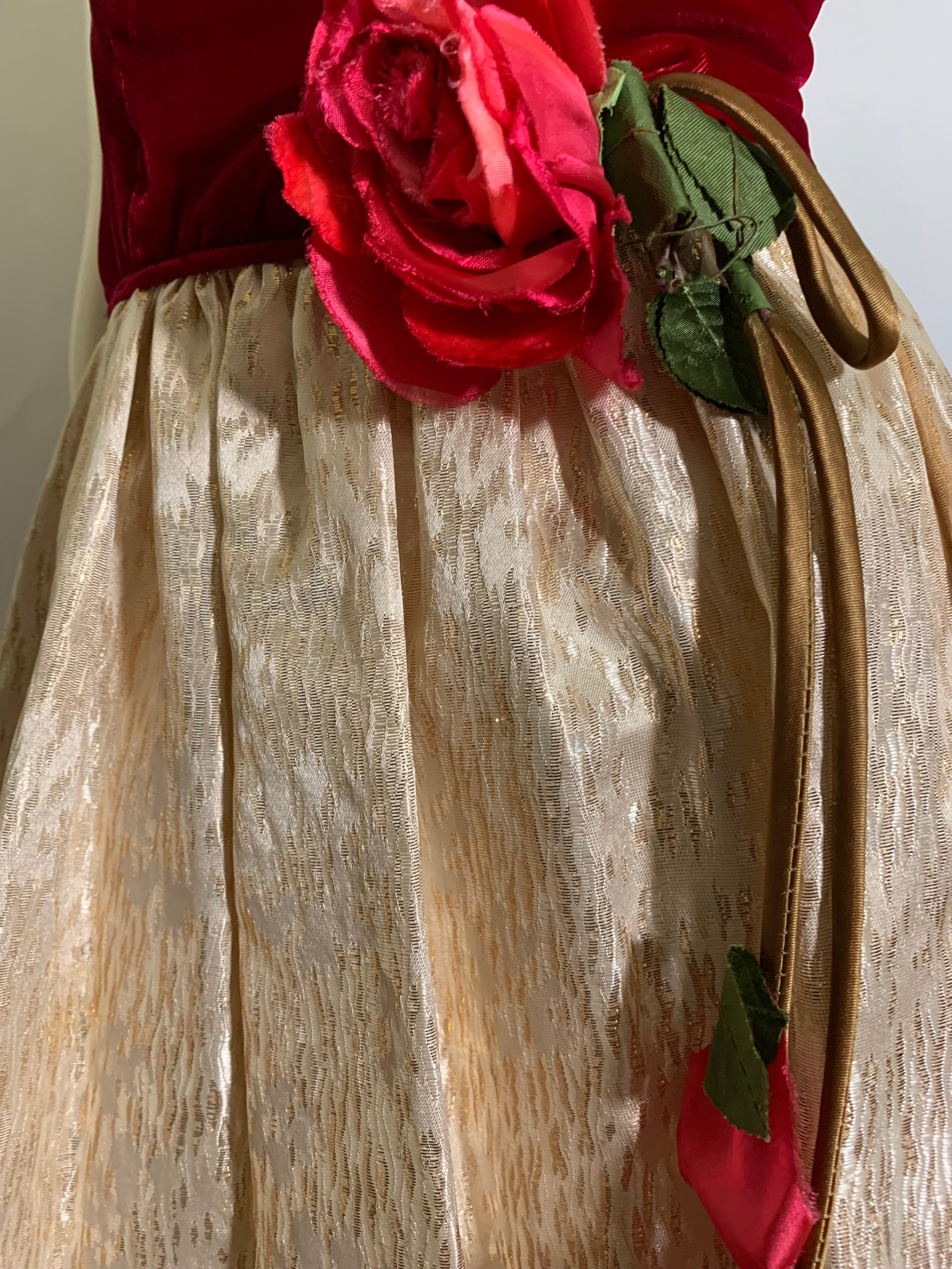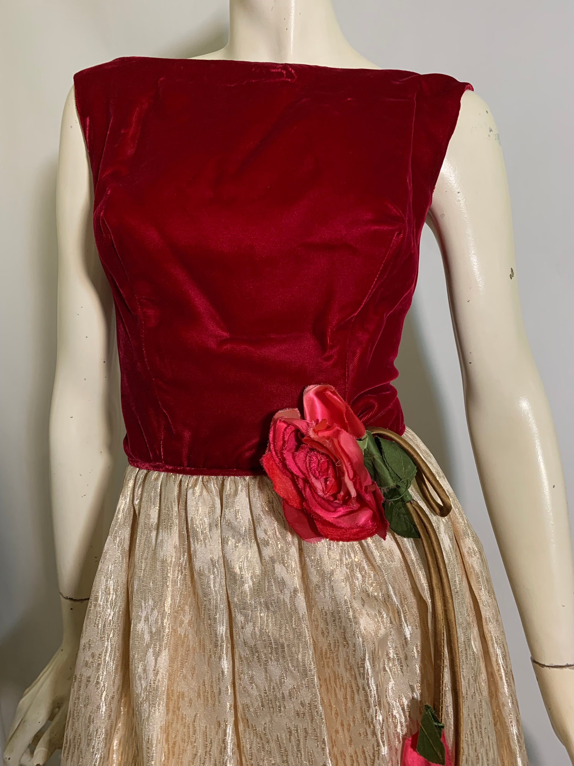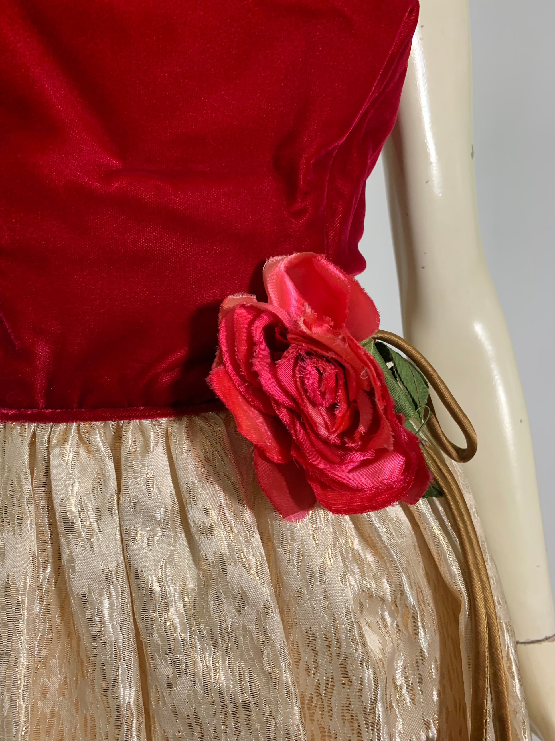 Red Velvet Bodice Dress with Metallic Gold Skirt Pink Rose Accent circa 1960s