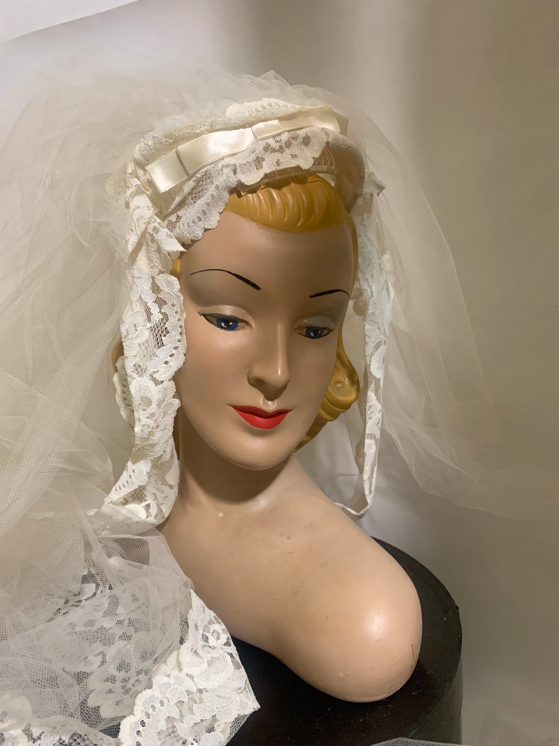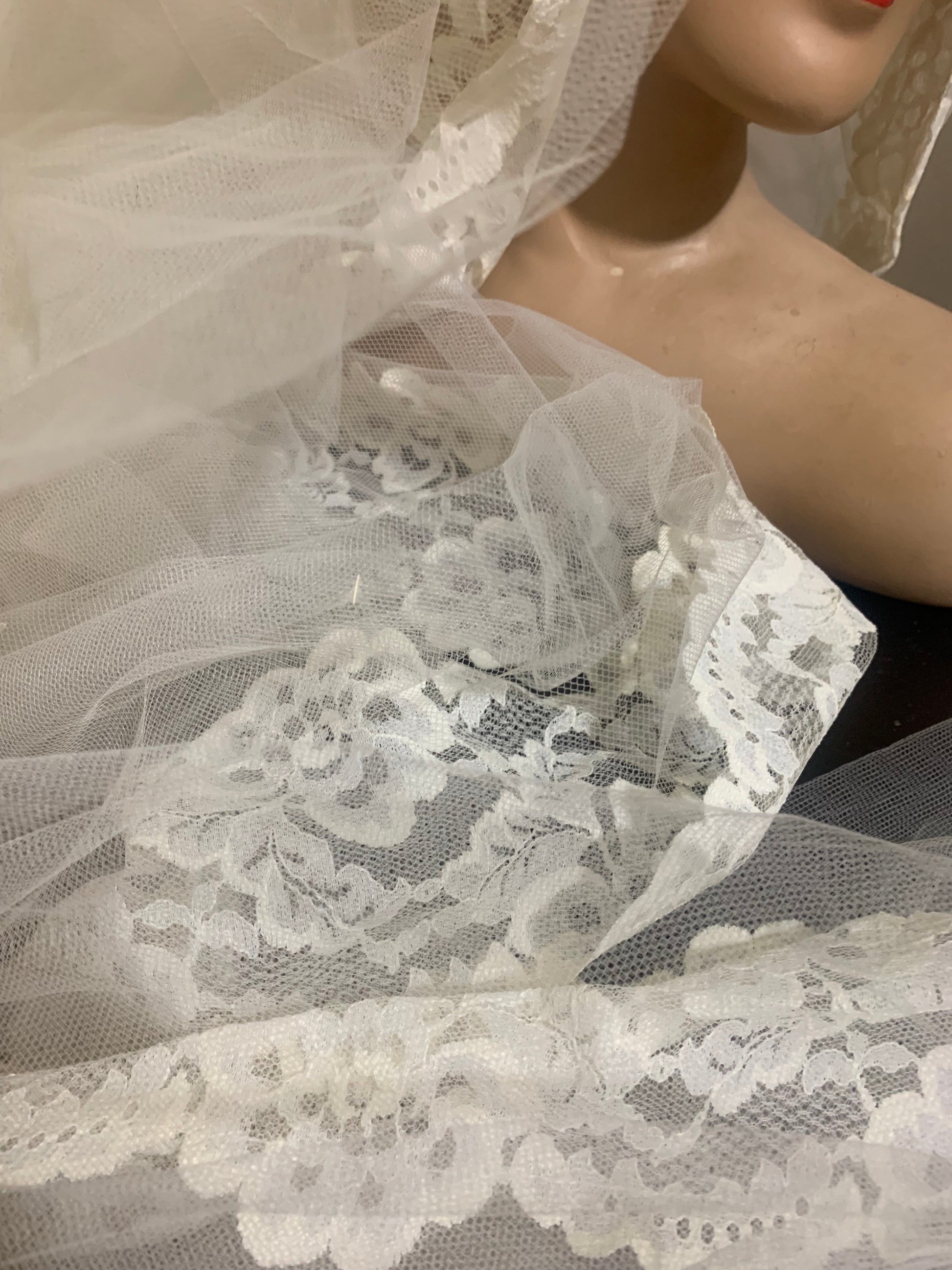 Veil is a wired headpiece with bow in front and comb inside to secure to hair- short veil for face to be folded back- super long lace edged train. No flaws.