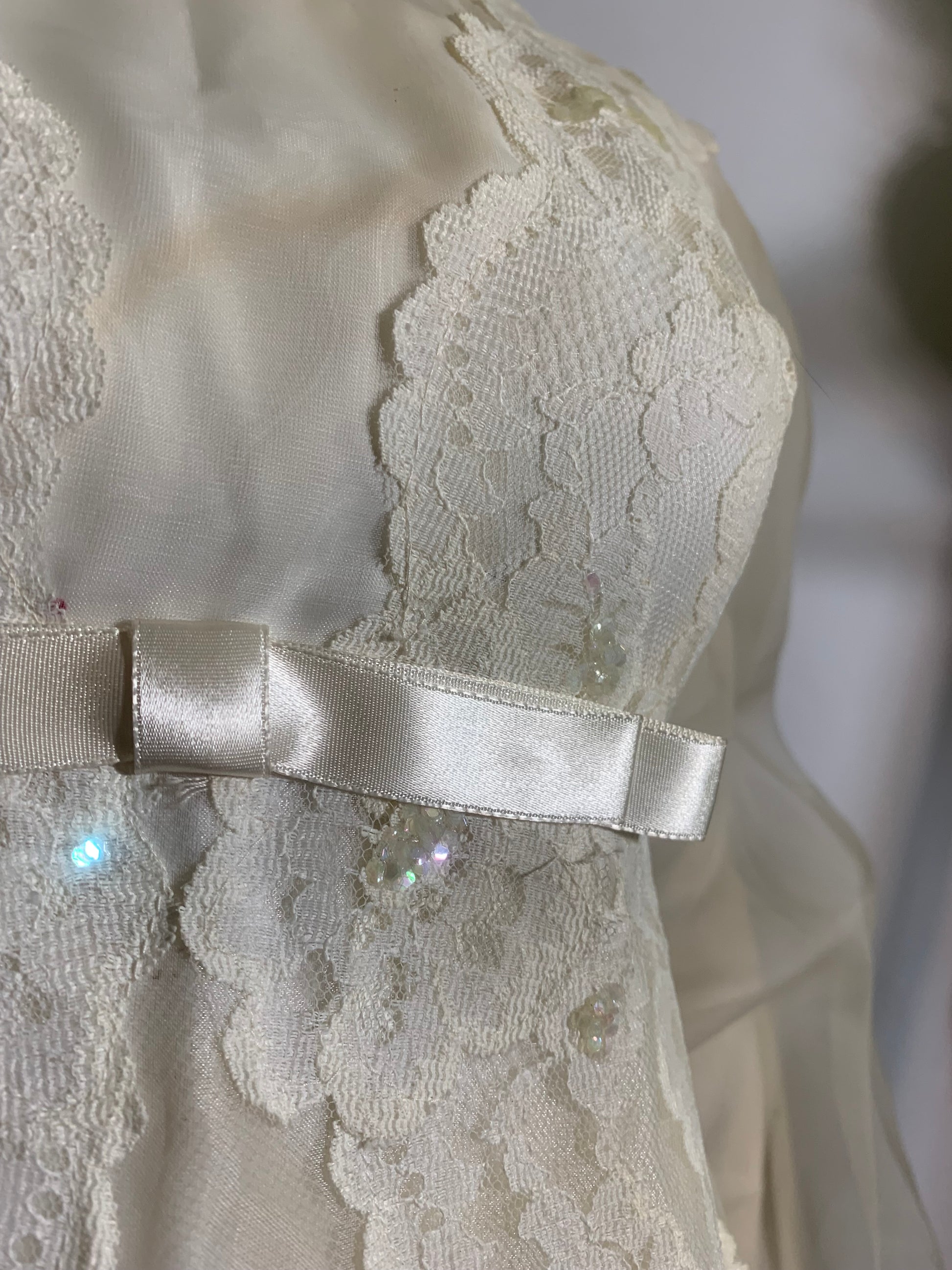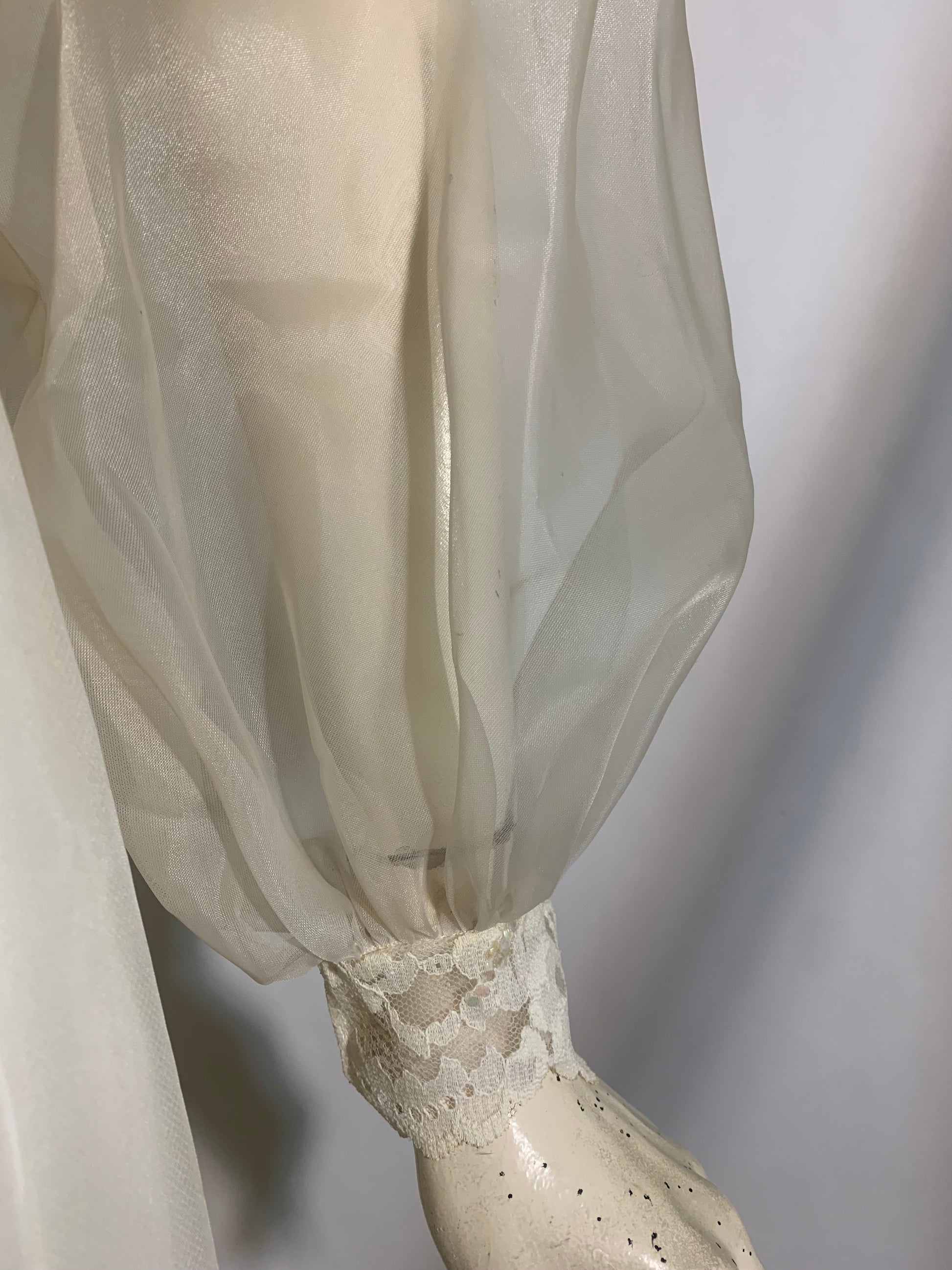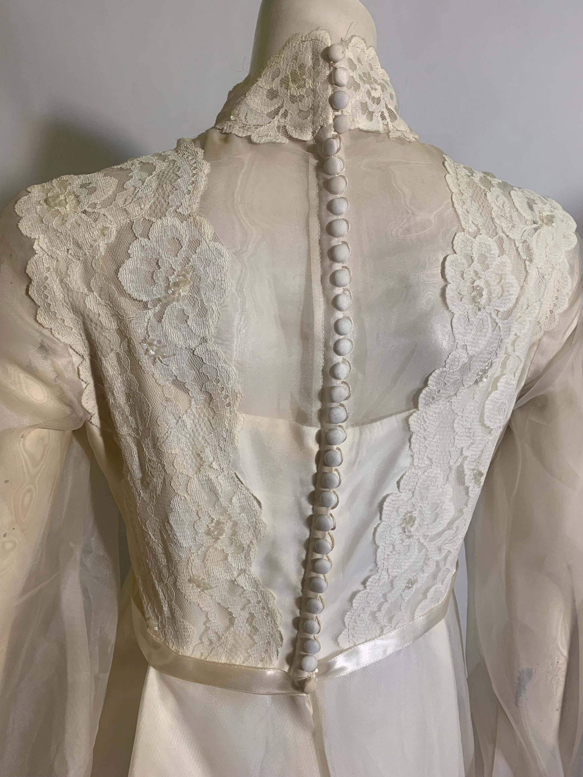 Amazing white acetate 1960s wedding gown with sheer overlay accented in lace with sequins- empire design, high neck, sheer full sleeves that snap at wrist. Bridal buttons up back (zipper inside to close)- only functioning buttons and loops are on back of neck. Has some yellowing as shown, as is.