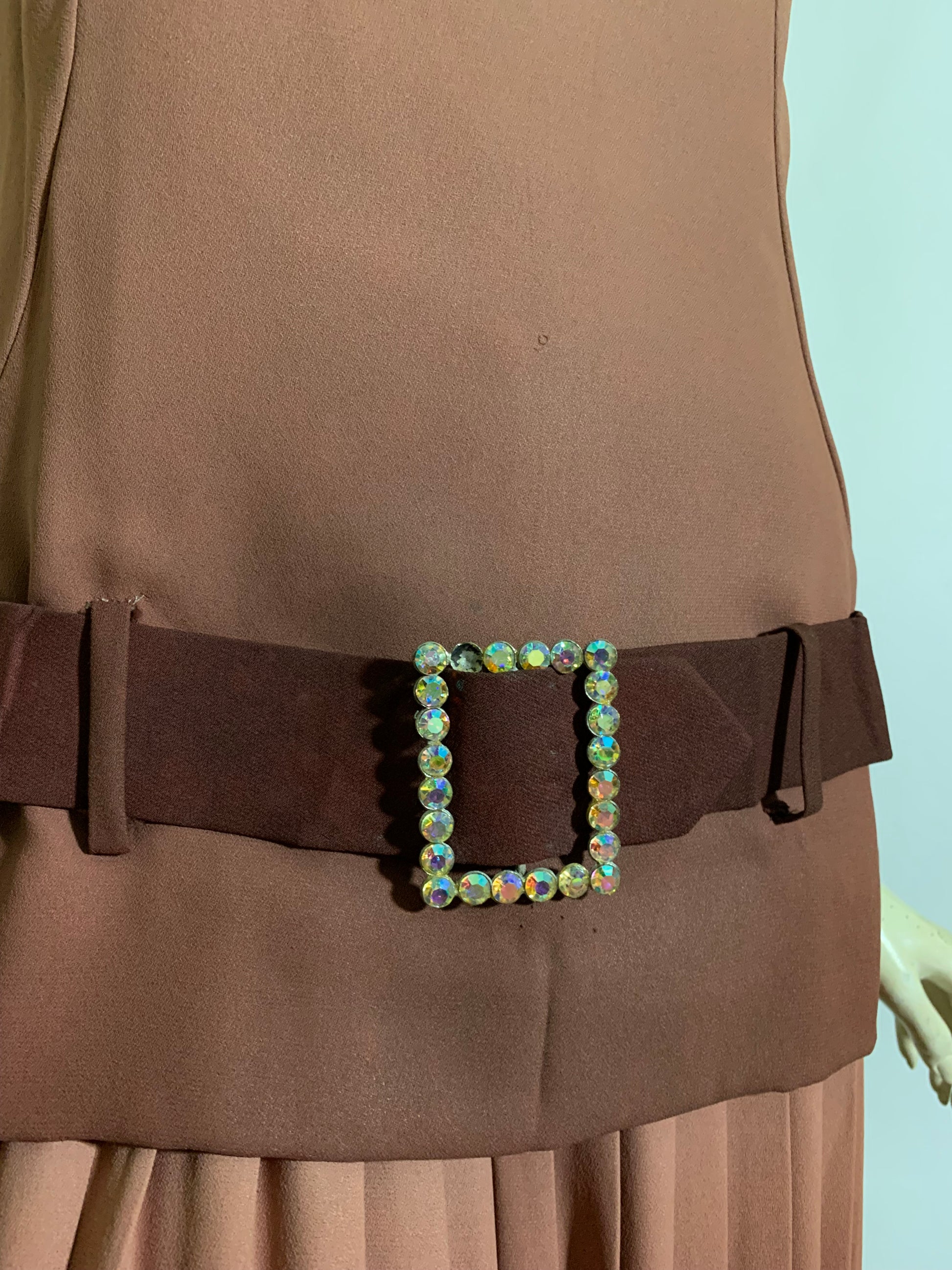 Rosy caramel crepe rayon palazzo pants "dress" with ombré coloring. Sleeveless, rolled neckline. Long "top" over pleated palazzo pants, bodice has 2 layers. Spot on upper right bodice, likely from a brooch- could be covered with another brooch! No label.