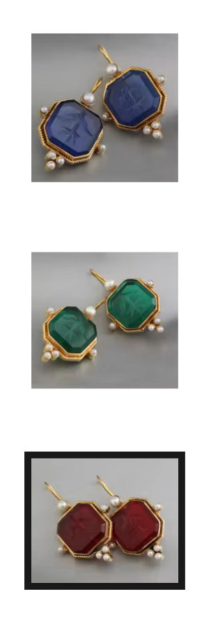 Acrylic and metal dangle earrings with faux pearls, antique style. 1 3/4". Modern, 2-3 week delivery.