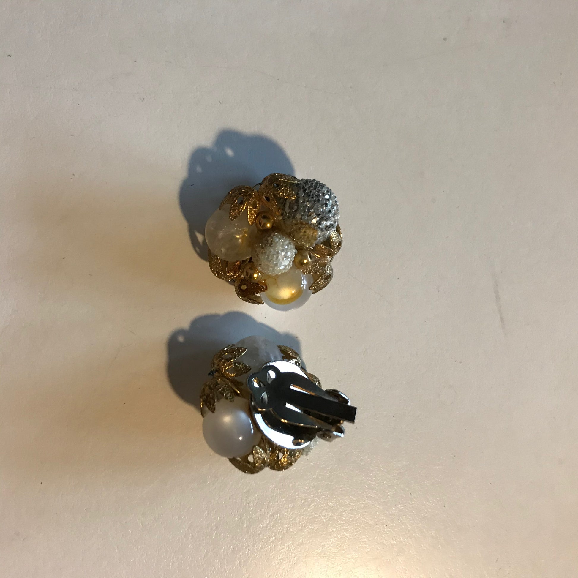 Shimmering Champagne and White Bead Cluster Clip Earrings circa 1960s