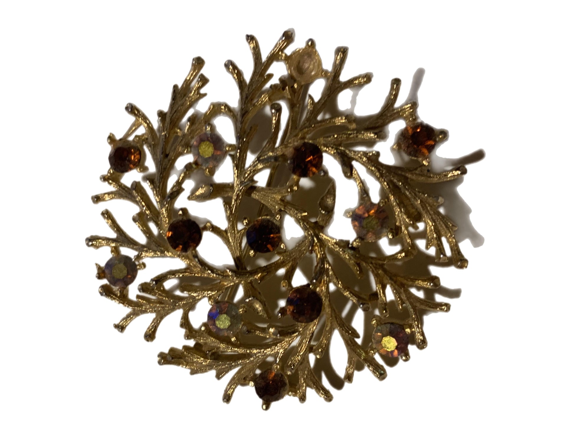 Gold tone metal filigree branching circle brooch with topaz colored rhinestones and aurora borealis rhinestones. Missing one stone. By Lisner. 2 1/8".