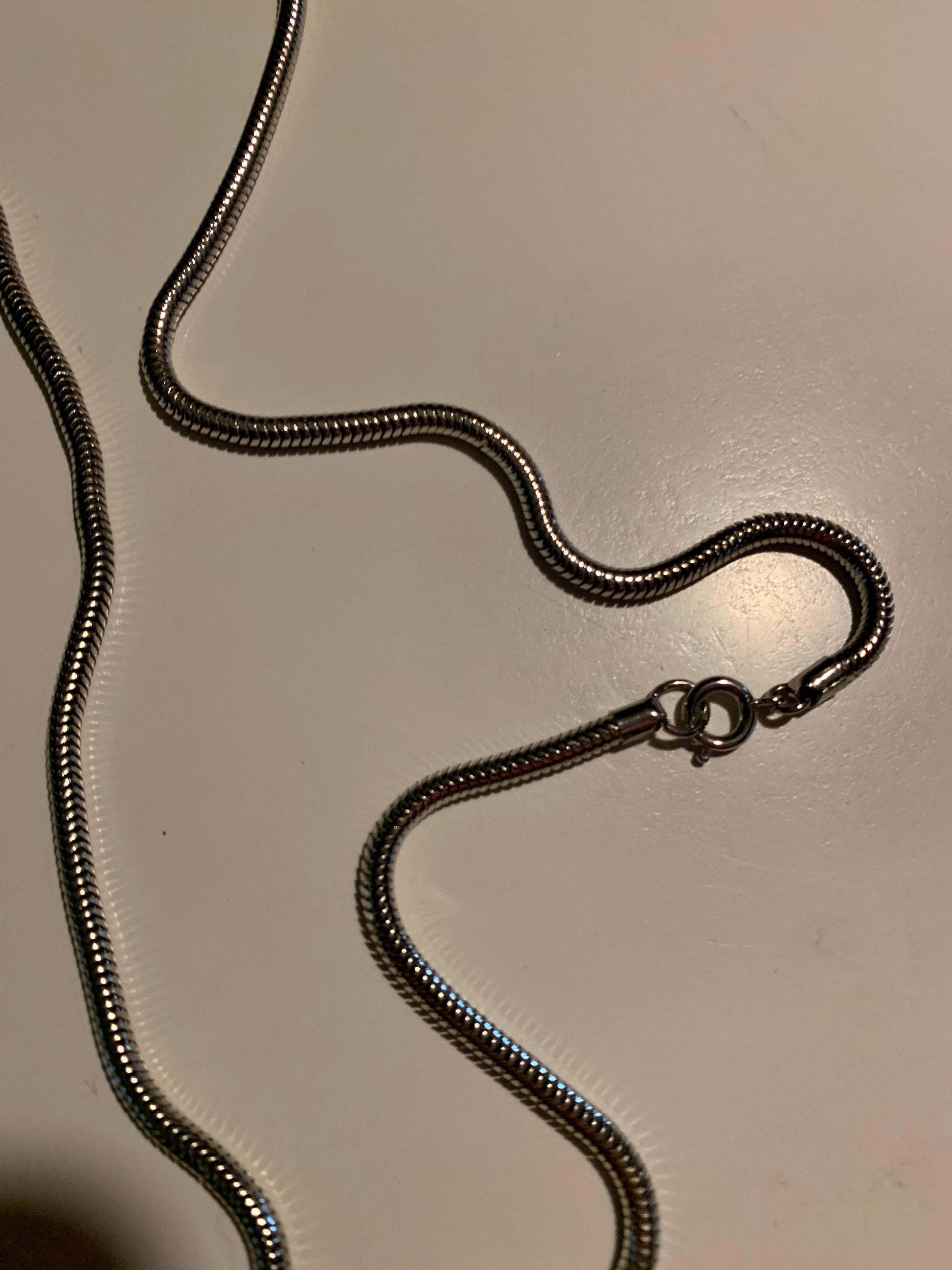 Silver chain 1970s necklace with ribbed barrel and fringe. No markings, no flaws.