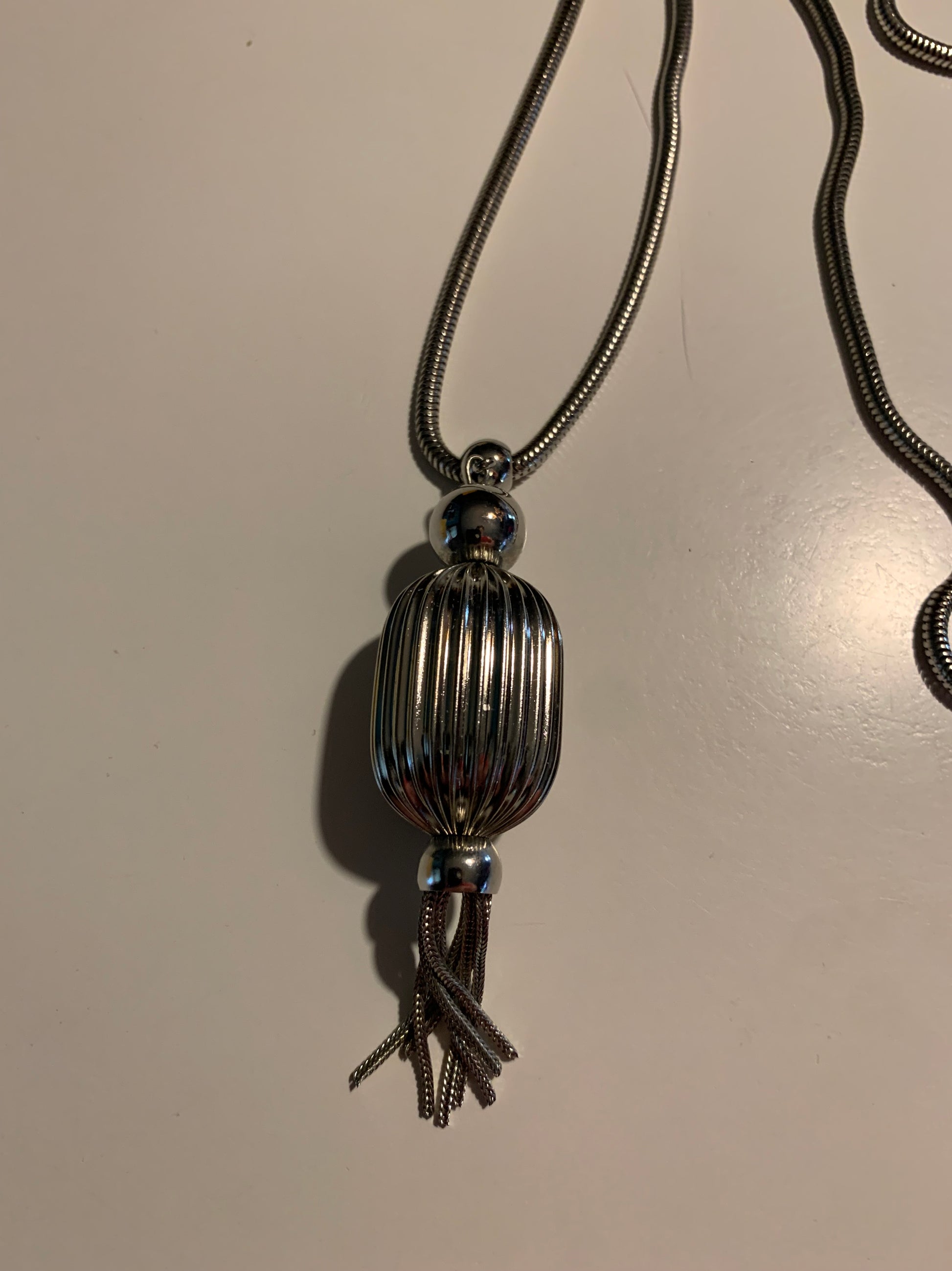 LONG Silver Ribbed Barrel Pendant Necklace with Fringe circa 1970s