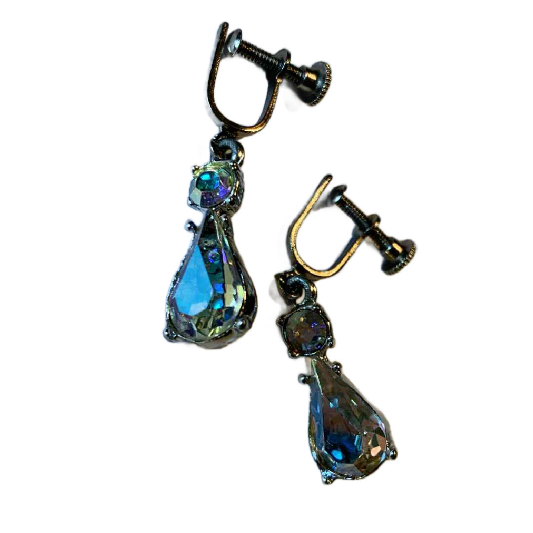 Iridescent Tear Drop Rhinestone Screwback Clip Earrings circa 1940s