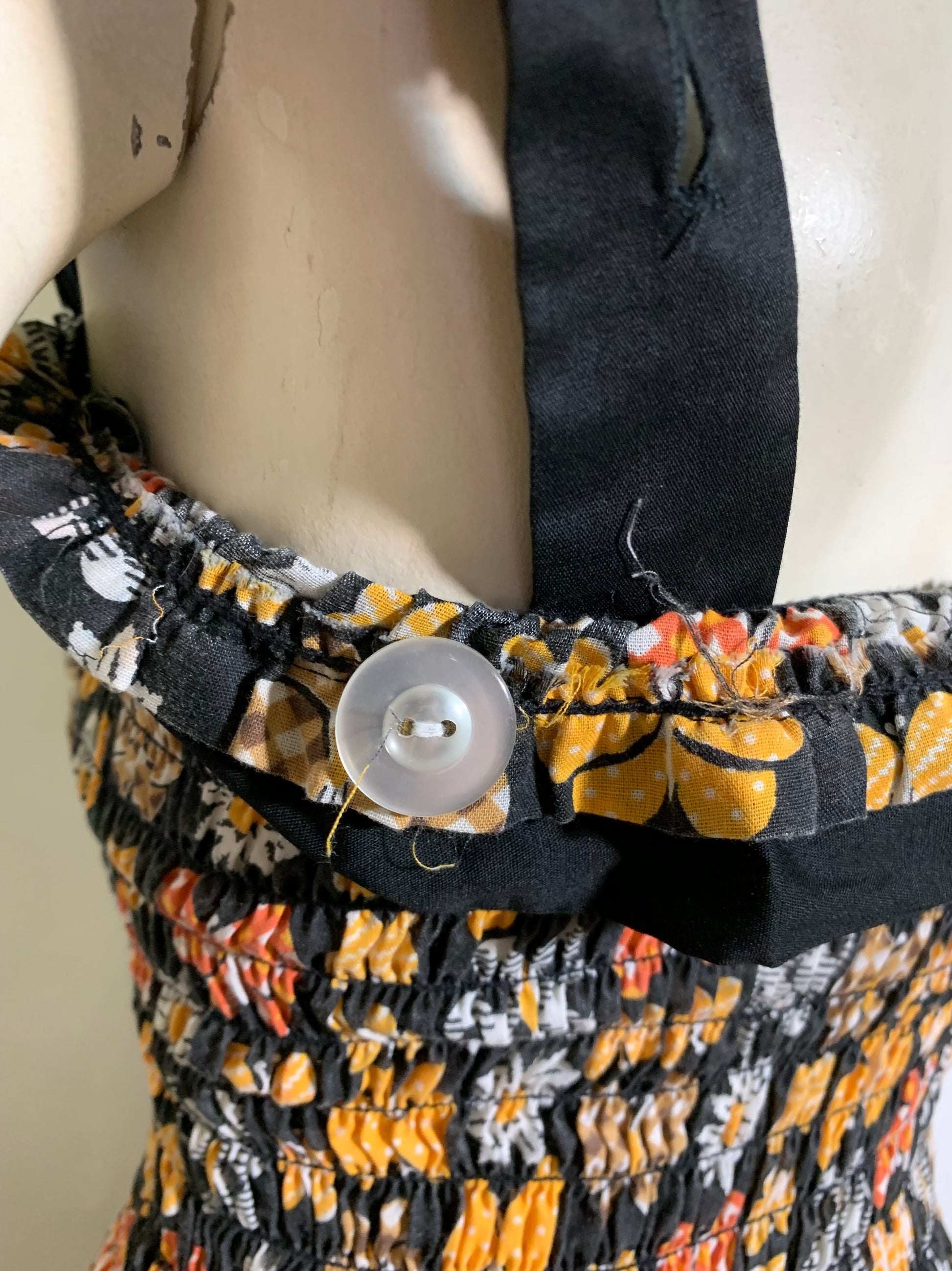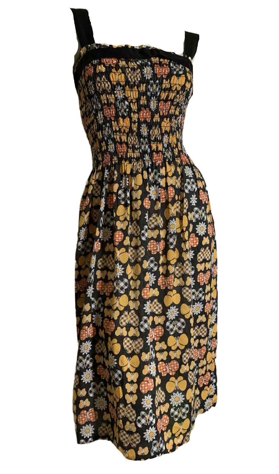 1970s butterfly print cotton sun dress with smocked bodice, straps button inside back. No flaws, no label.