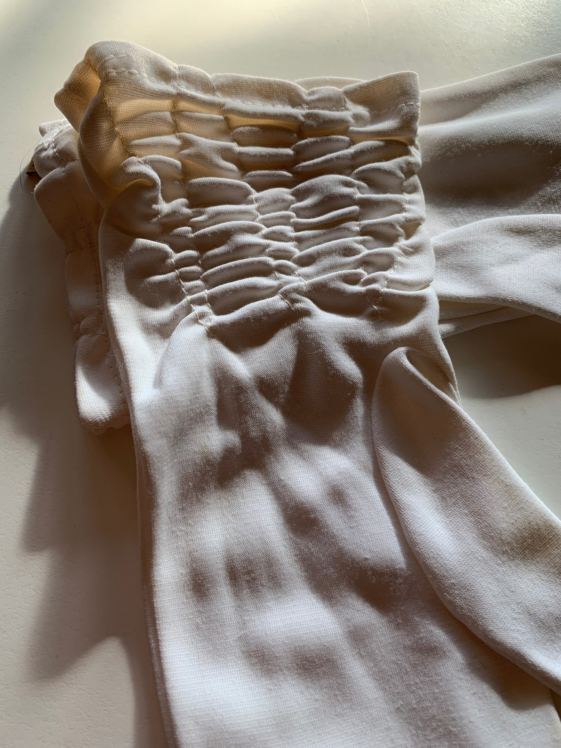 1960s white nylon ruched wrist gloves, made in England, size 7. No flaws.