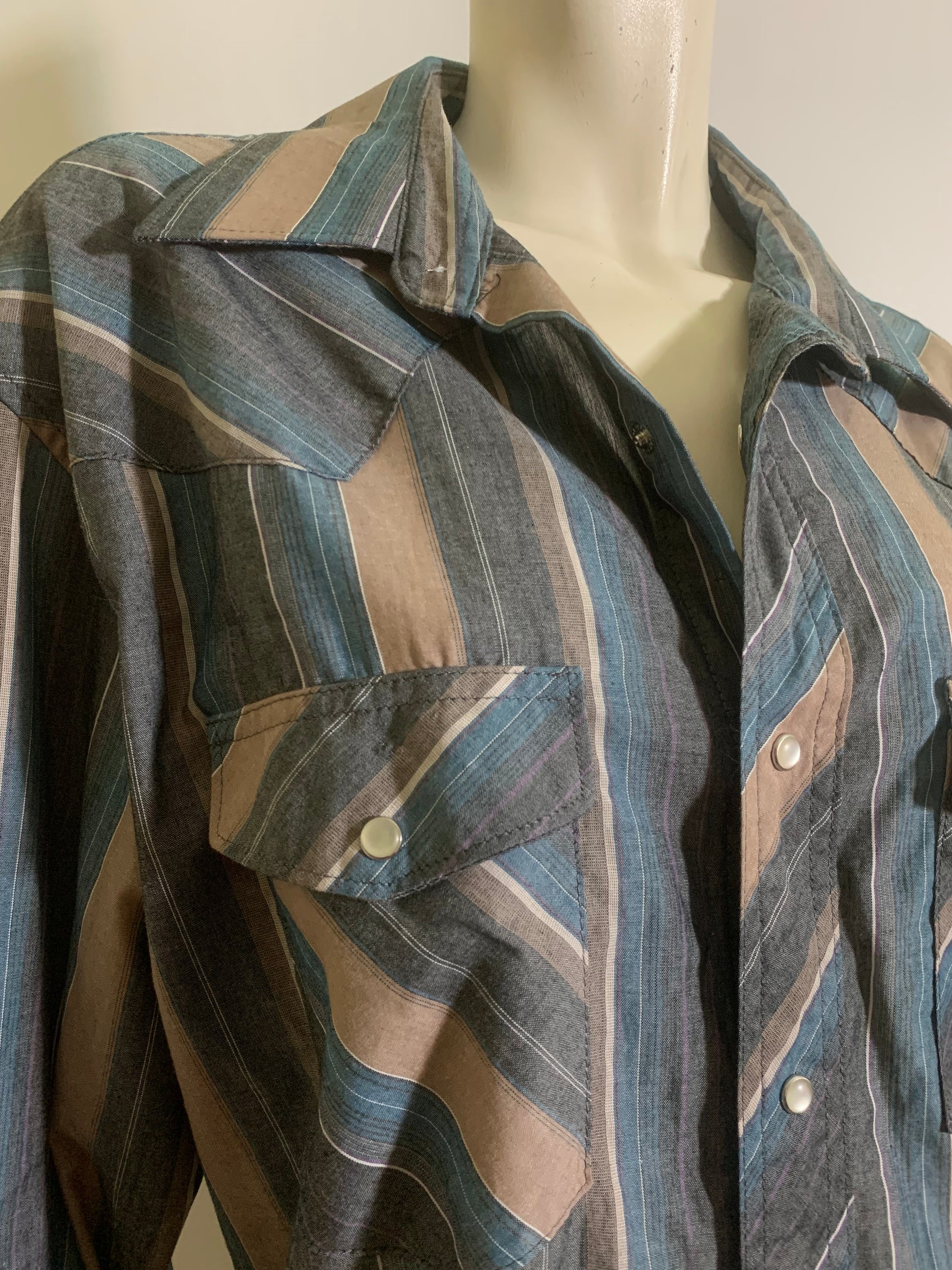 Tan and Blue Snap Front Men's Western Long Sleeved Shirt circa 1980s XL