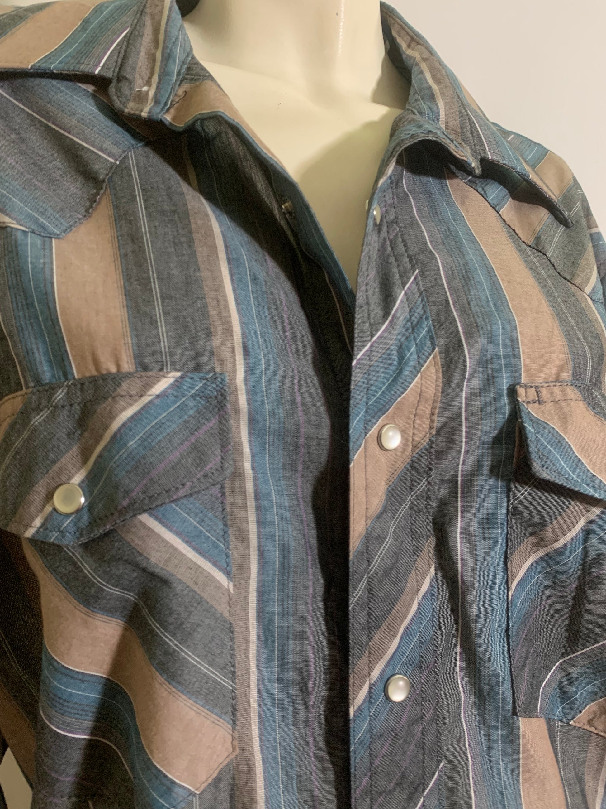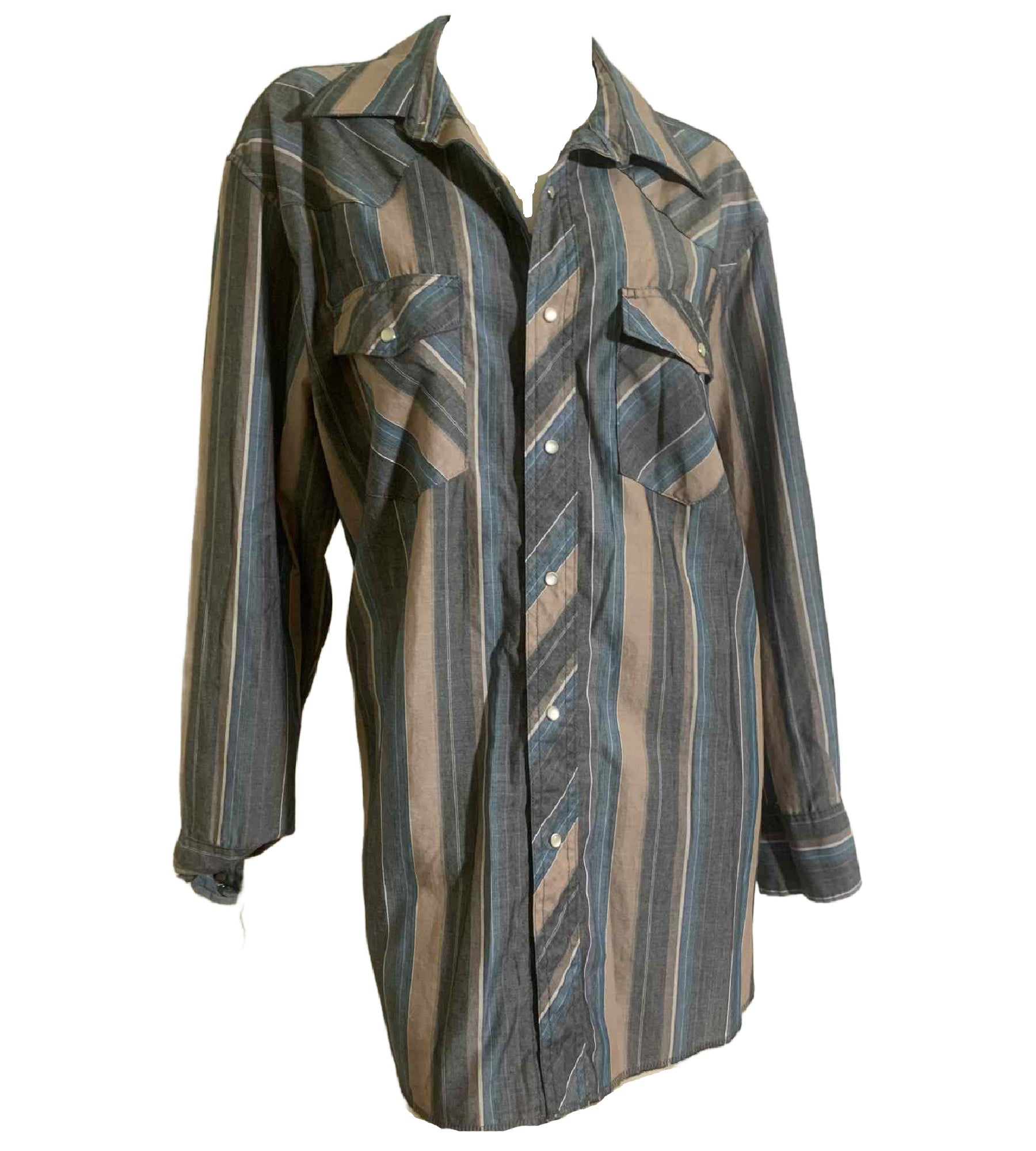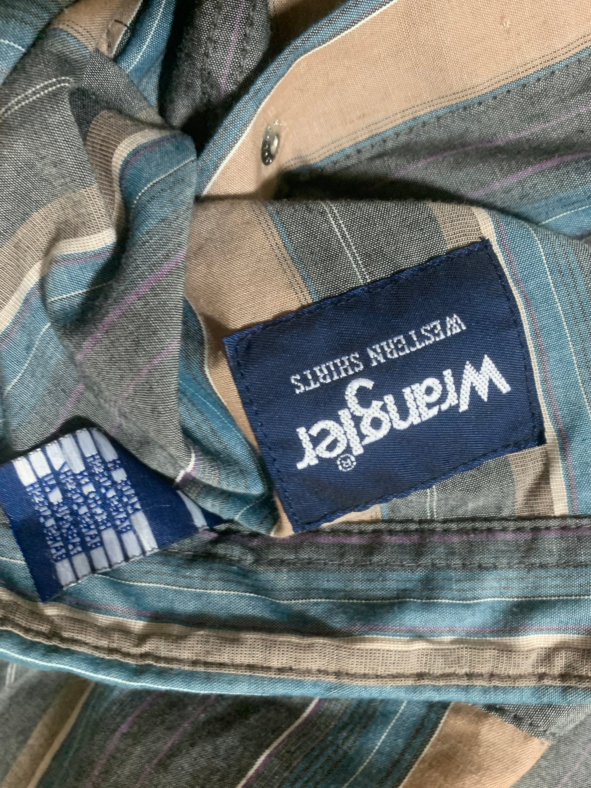 Tan and blue long sleeved snap front western shirt by Wrangler. Cotton. No flaws.