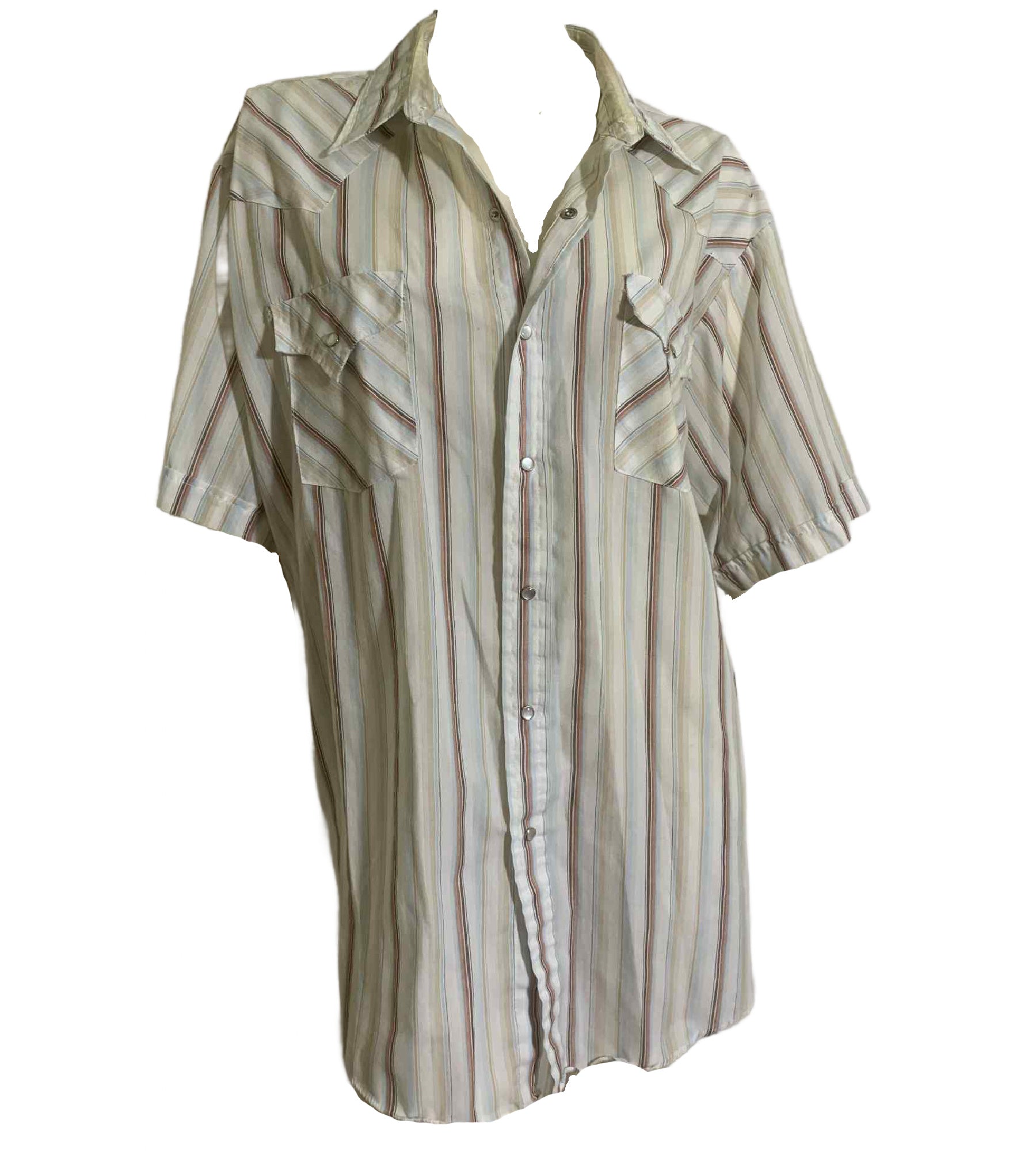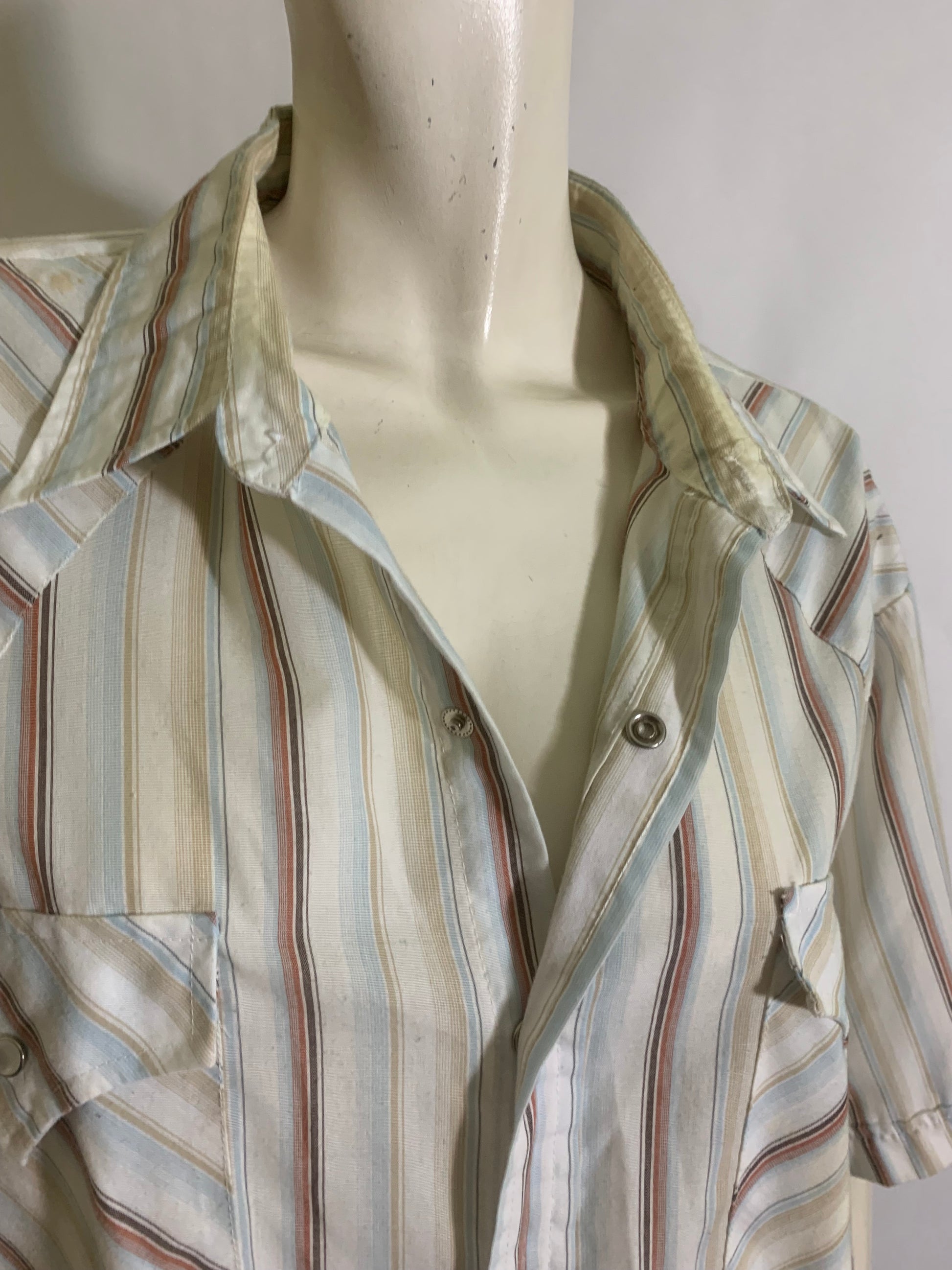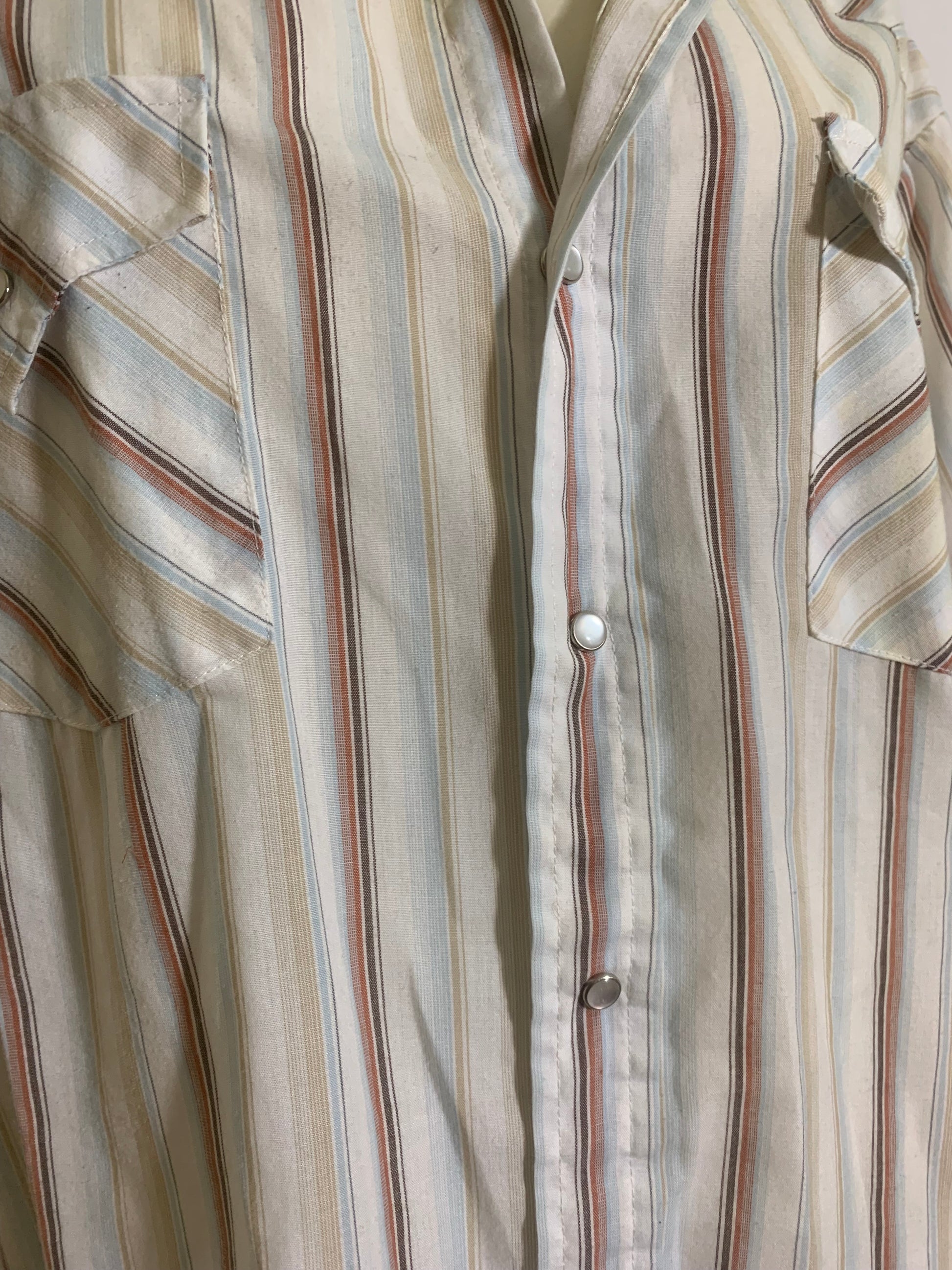 Tan, White and Blue Cotton Snap Front Men's Western Shirt circa 1980s XL