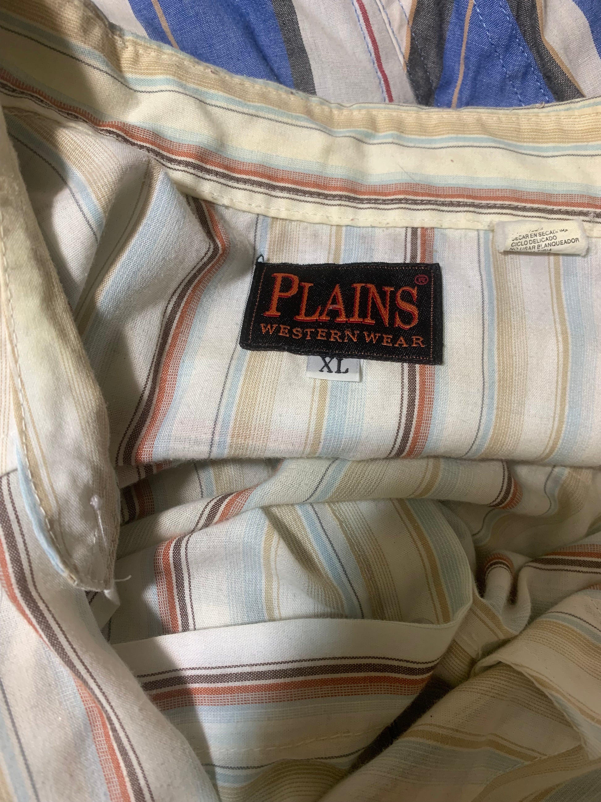 White, blue and tan snap front western shirt by Plains Western Wear. Cotton. No flaws.