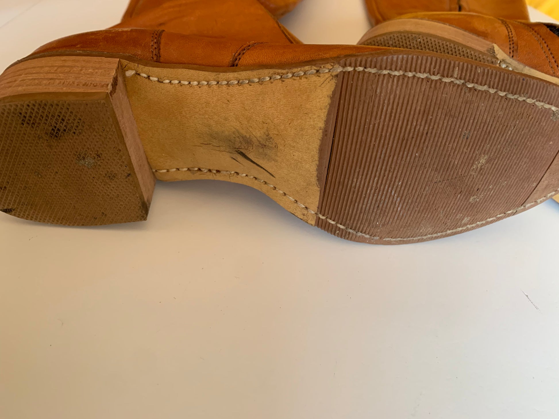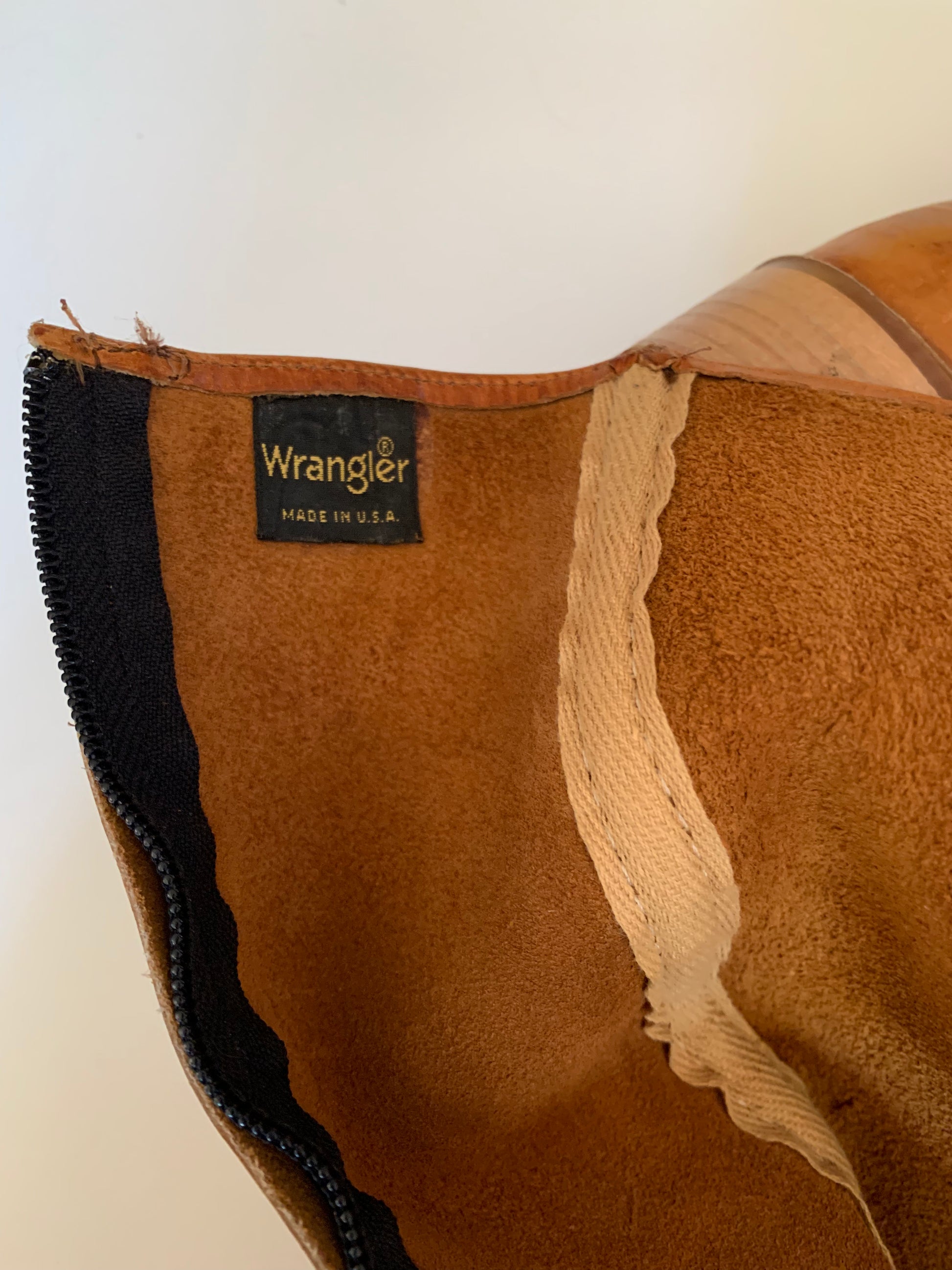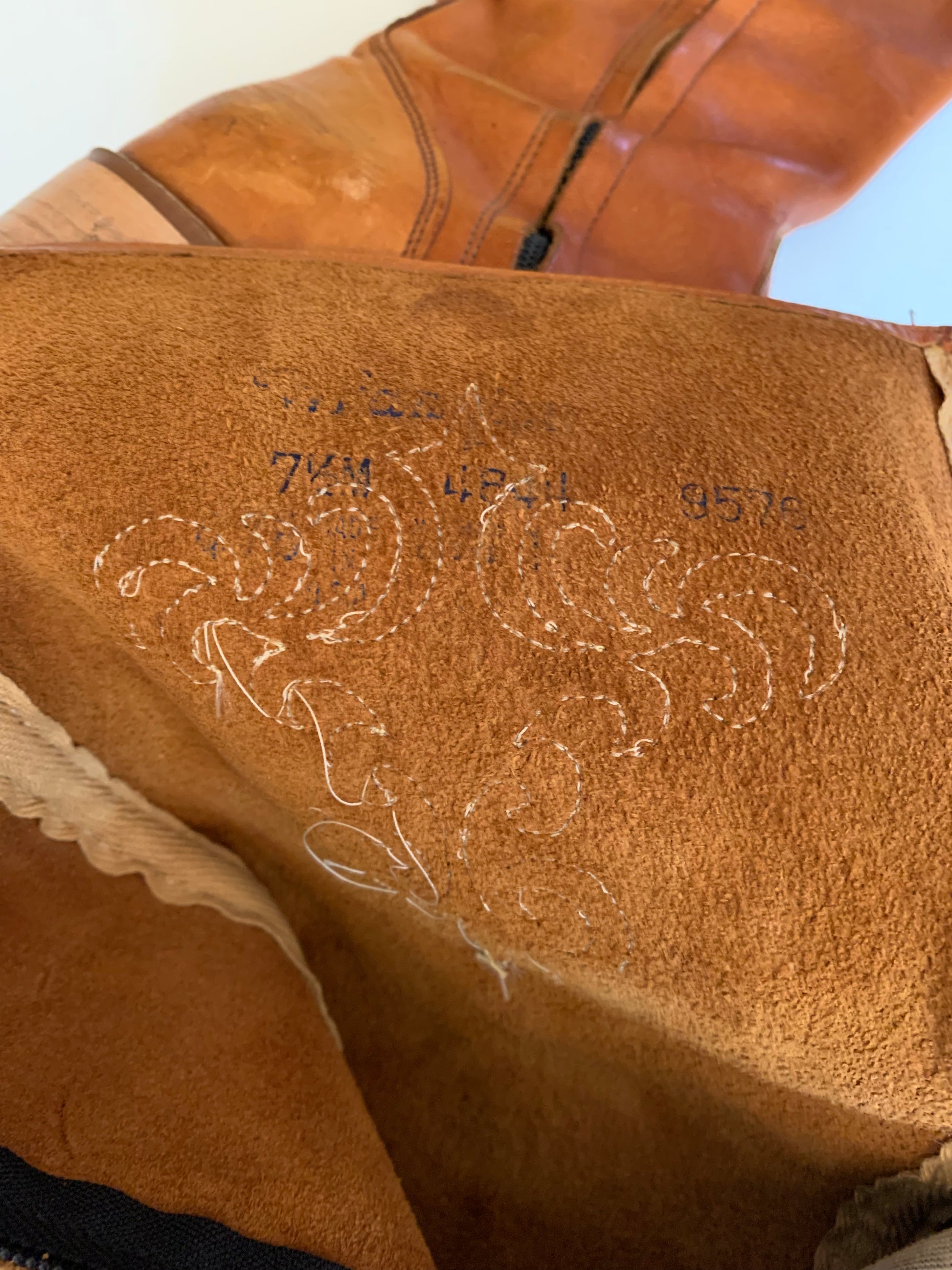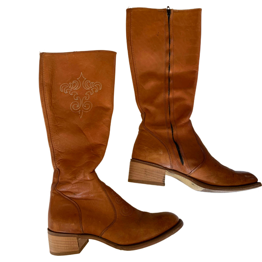 1970s terra cotta leather boots with side zipper. Embroidered on outer calf and on top, stacked wood heel, rubber soles. By Wrangler, size 7 1/2B. 16 1/2" tall, 1 1/2" heel. 9 7/8" long, 3 1/4" wide, 14" around calf. Minor wear. The perfect boots for Fall!