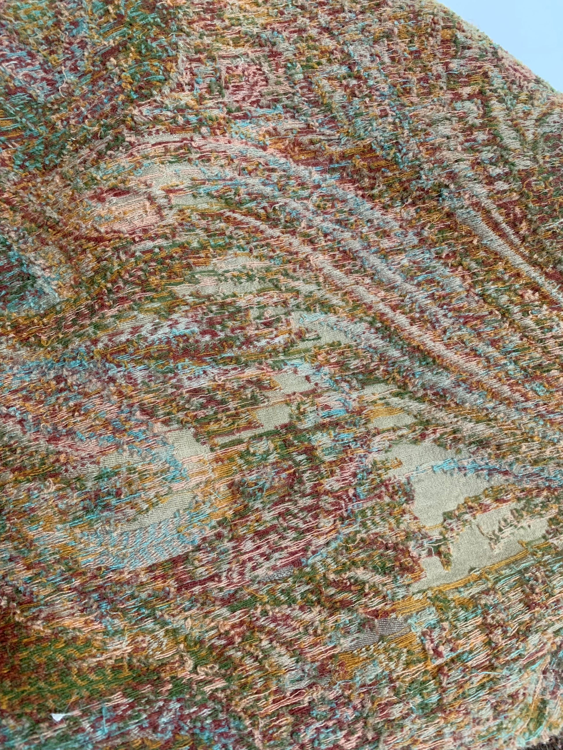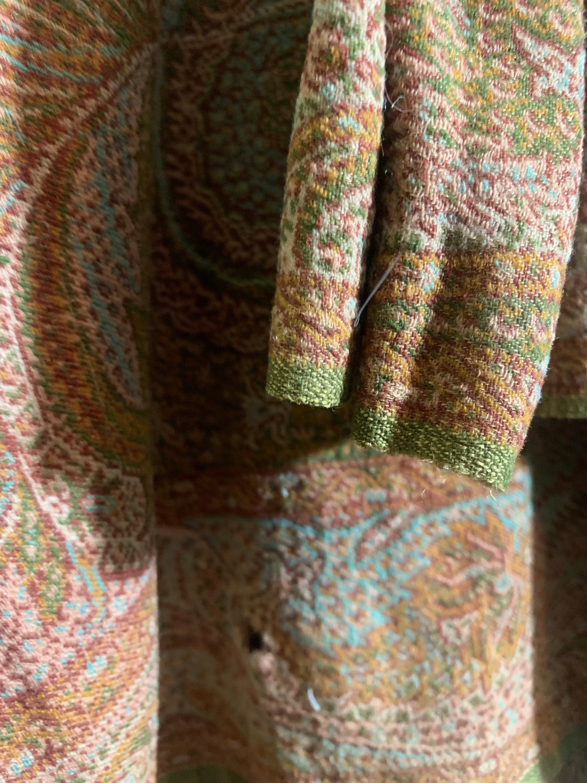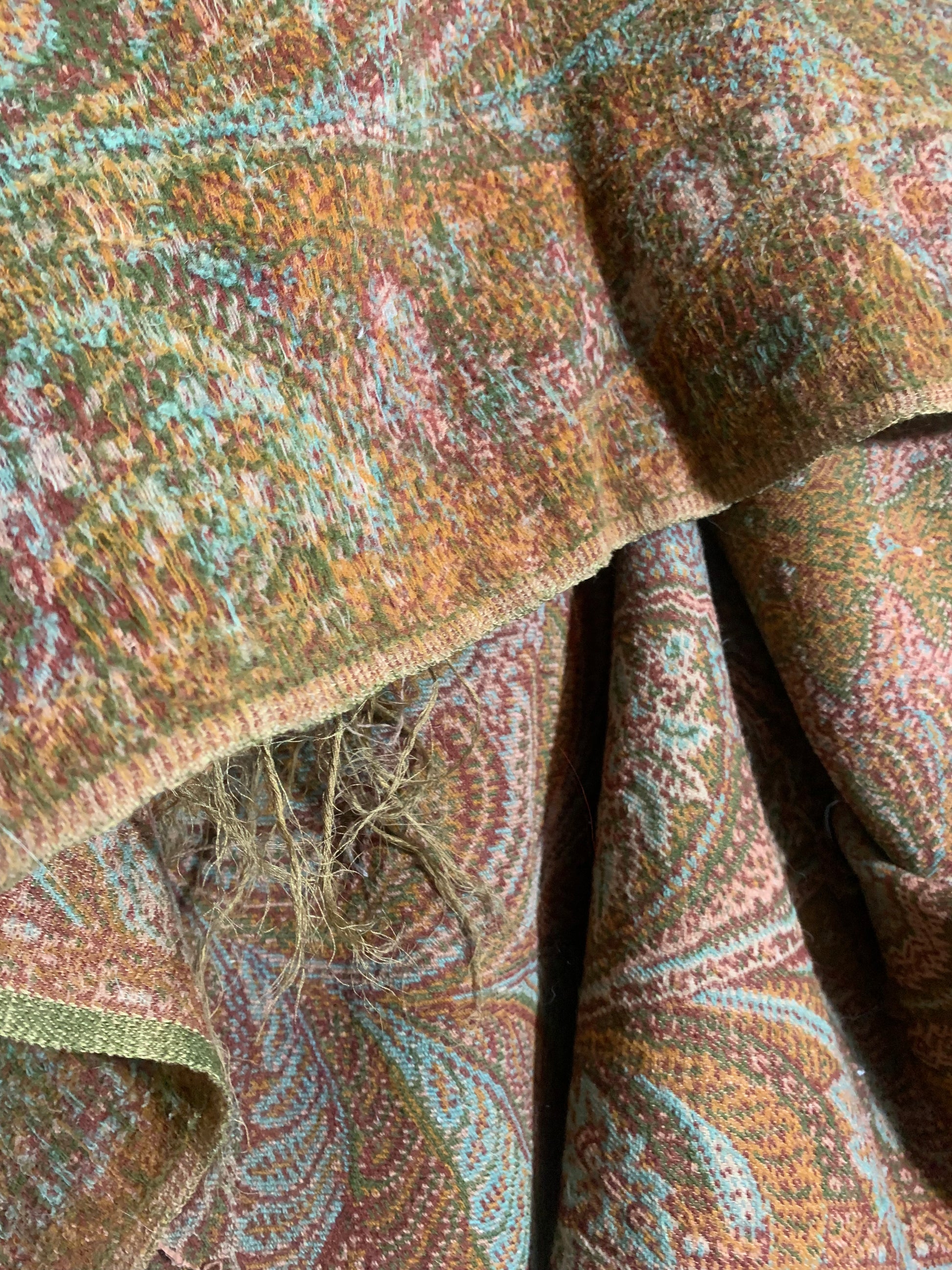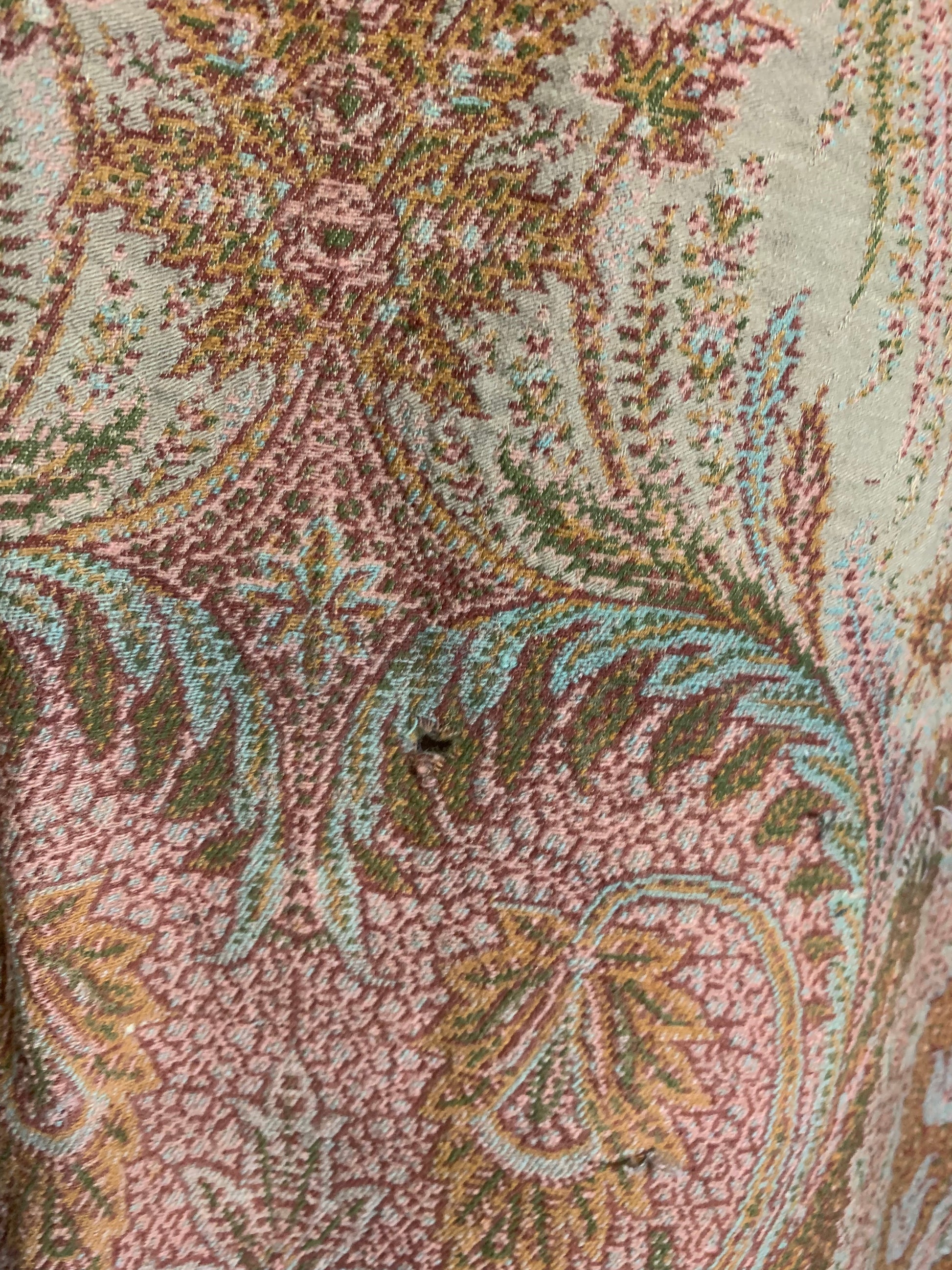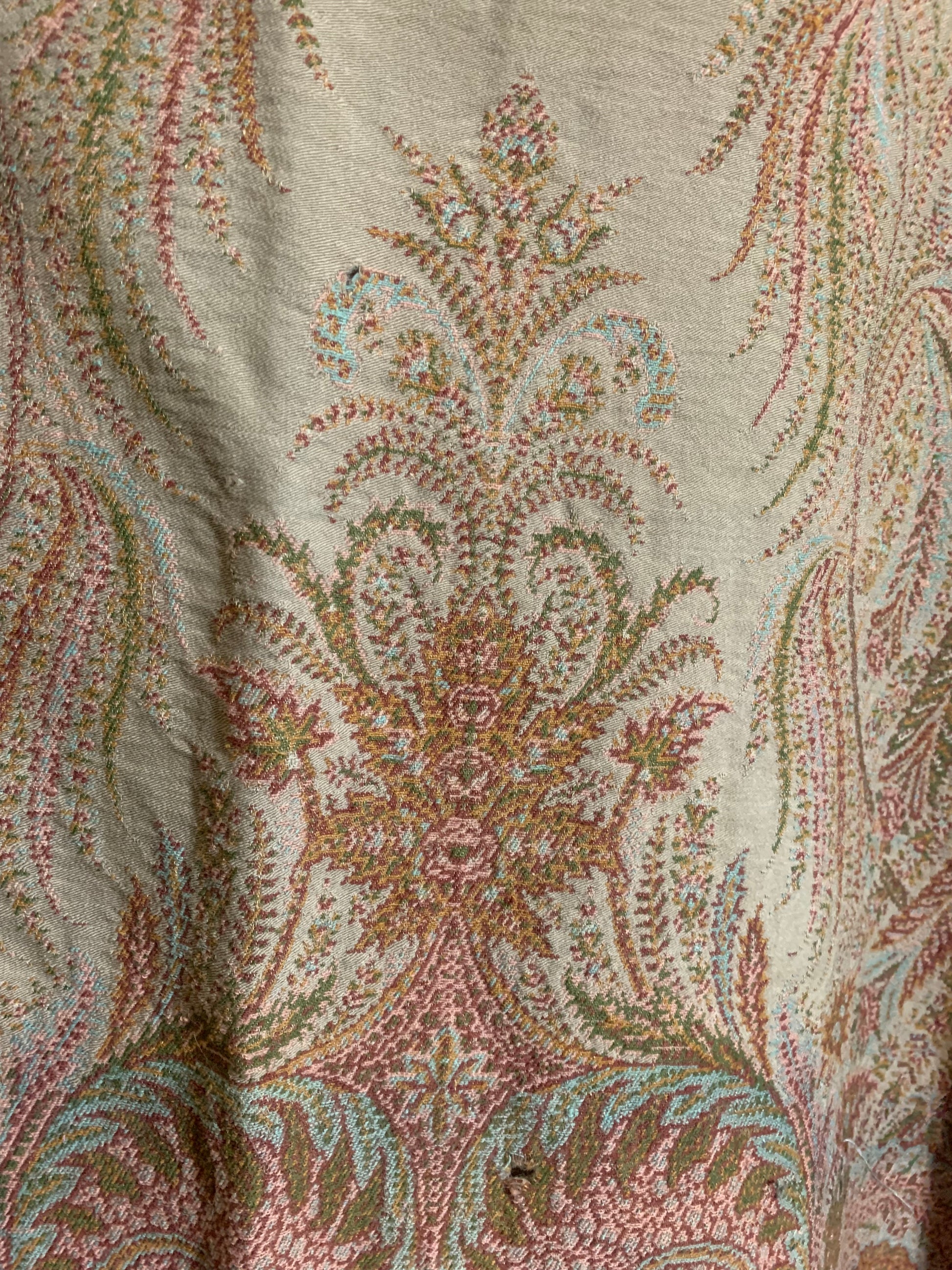 Beautiful turn of the century brocade wool shawl or carriage blanket in shades of sage & fern green, terra cotta, soft aqua, pink and deep copper. A few small holes, raw edges.