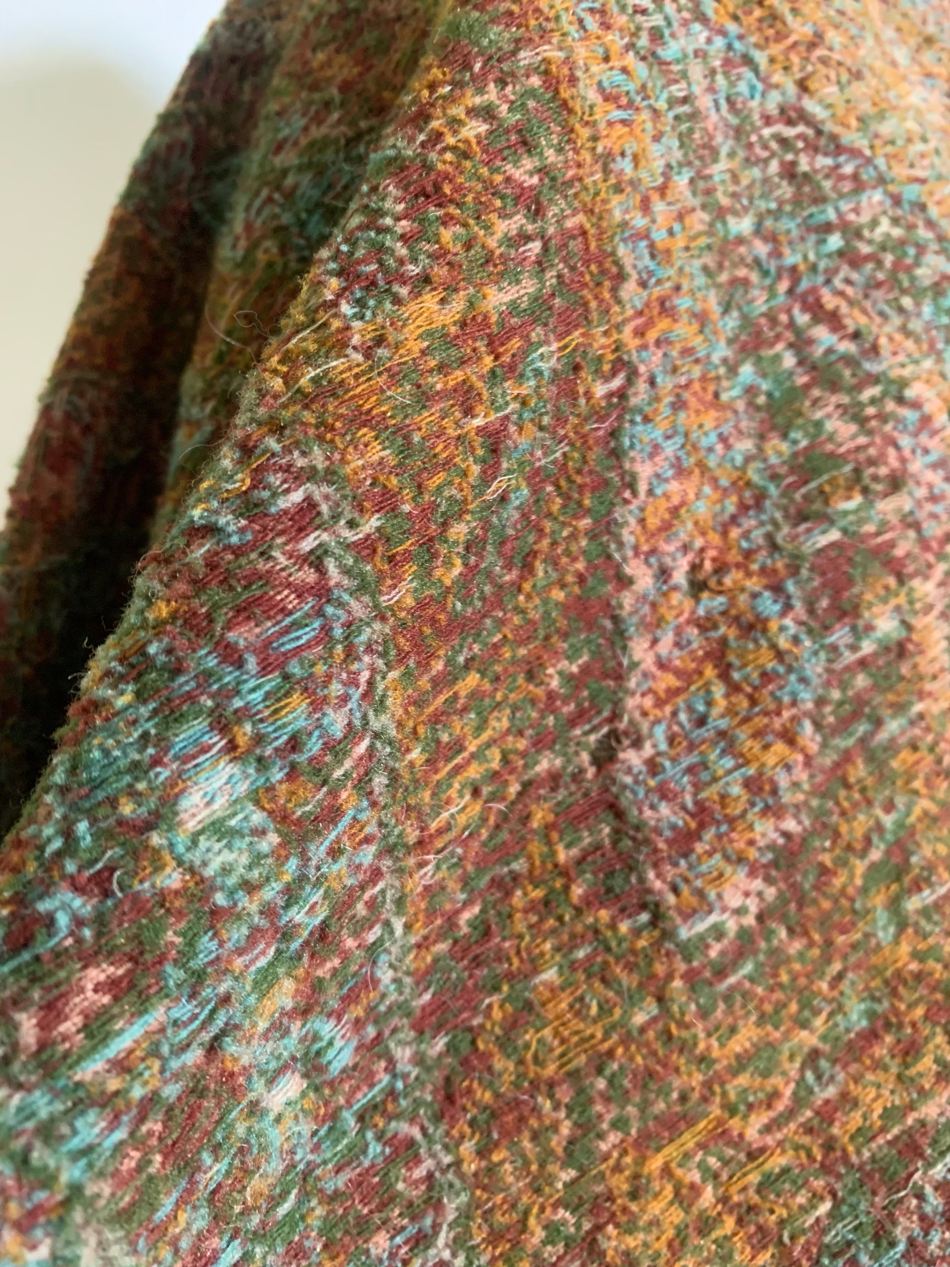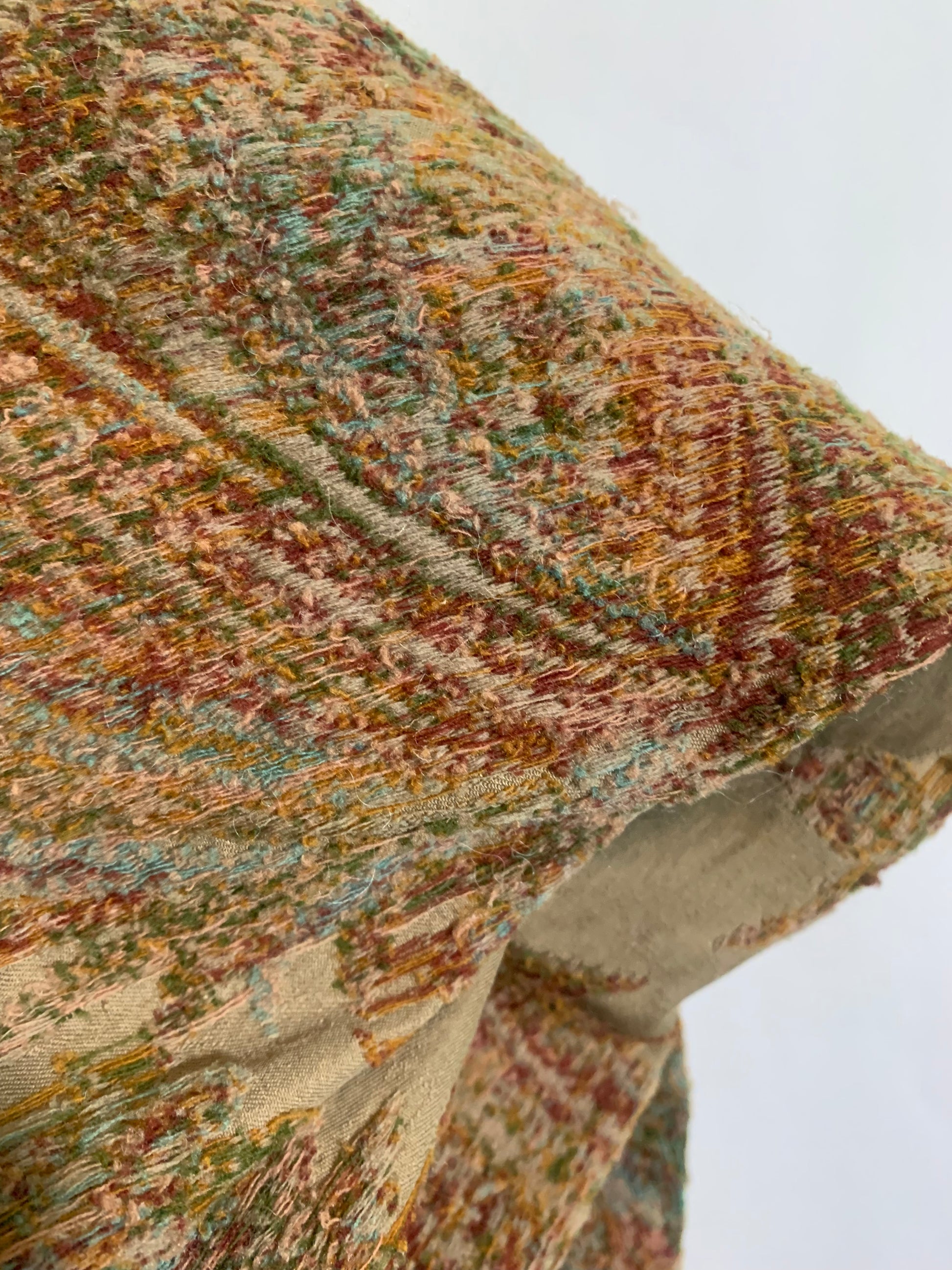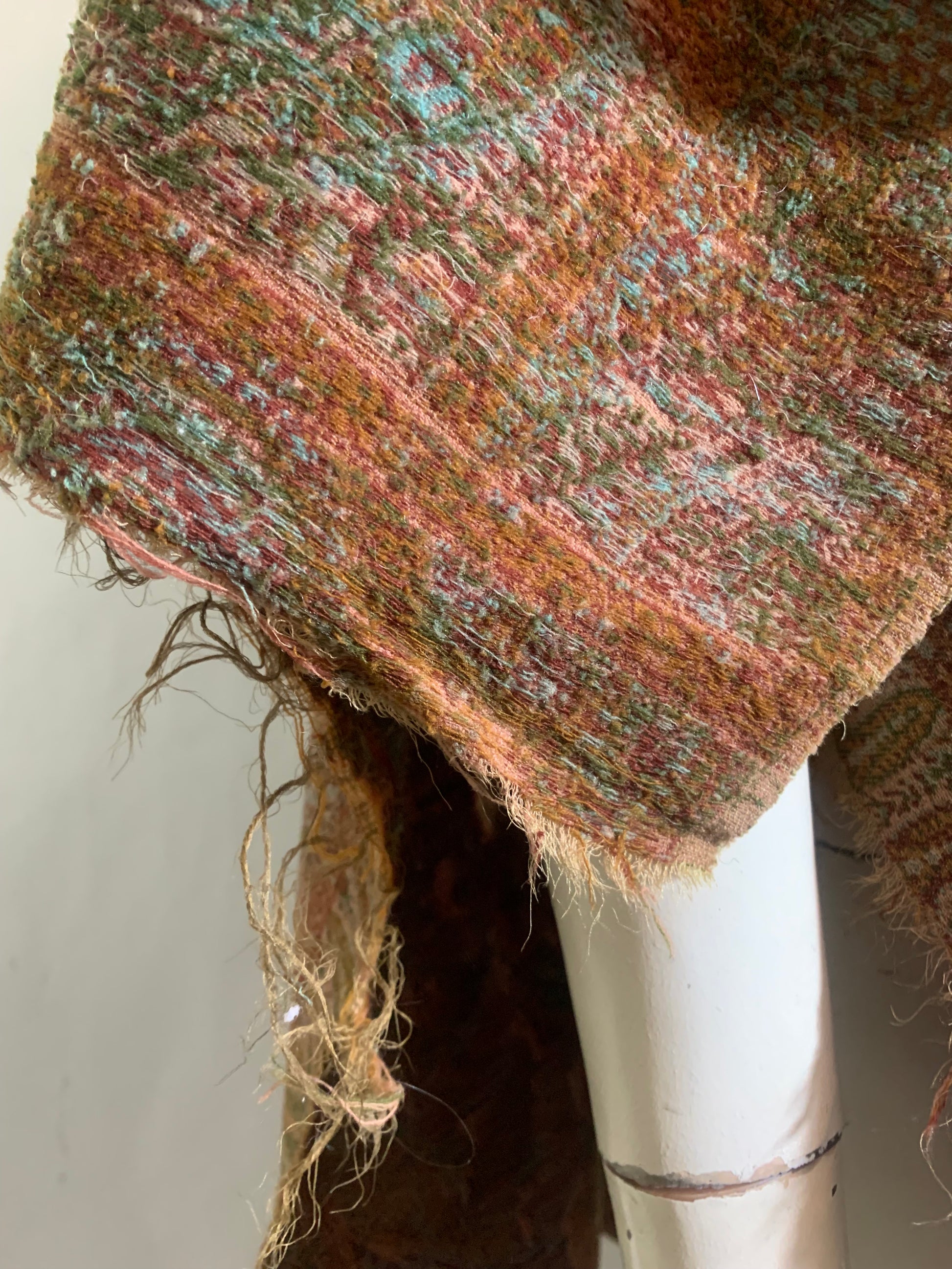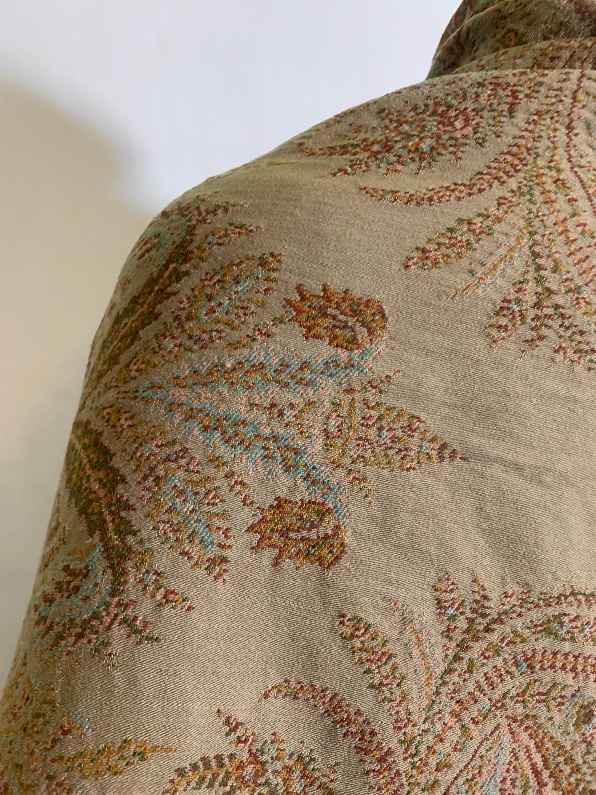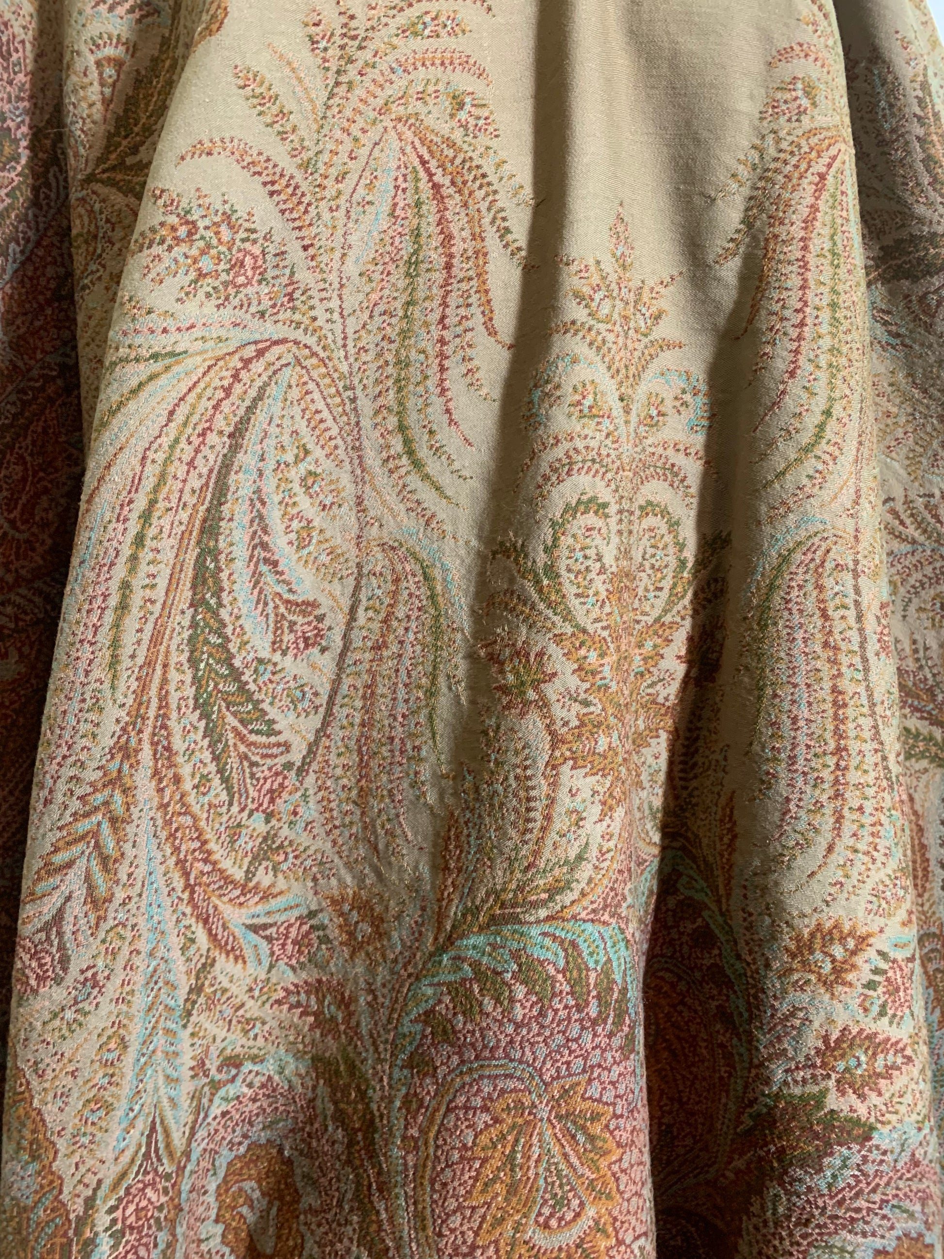 Beautiful turn of the century brocade wool shawl or carriage blanket in shades of sage & fern green, terra cotta, soft aqua, pink and deep copper. A few small holes, raw edges.