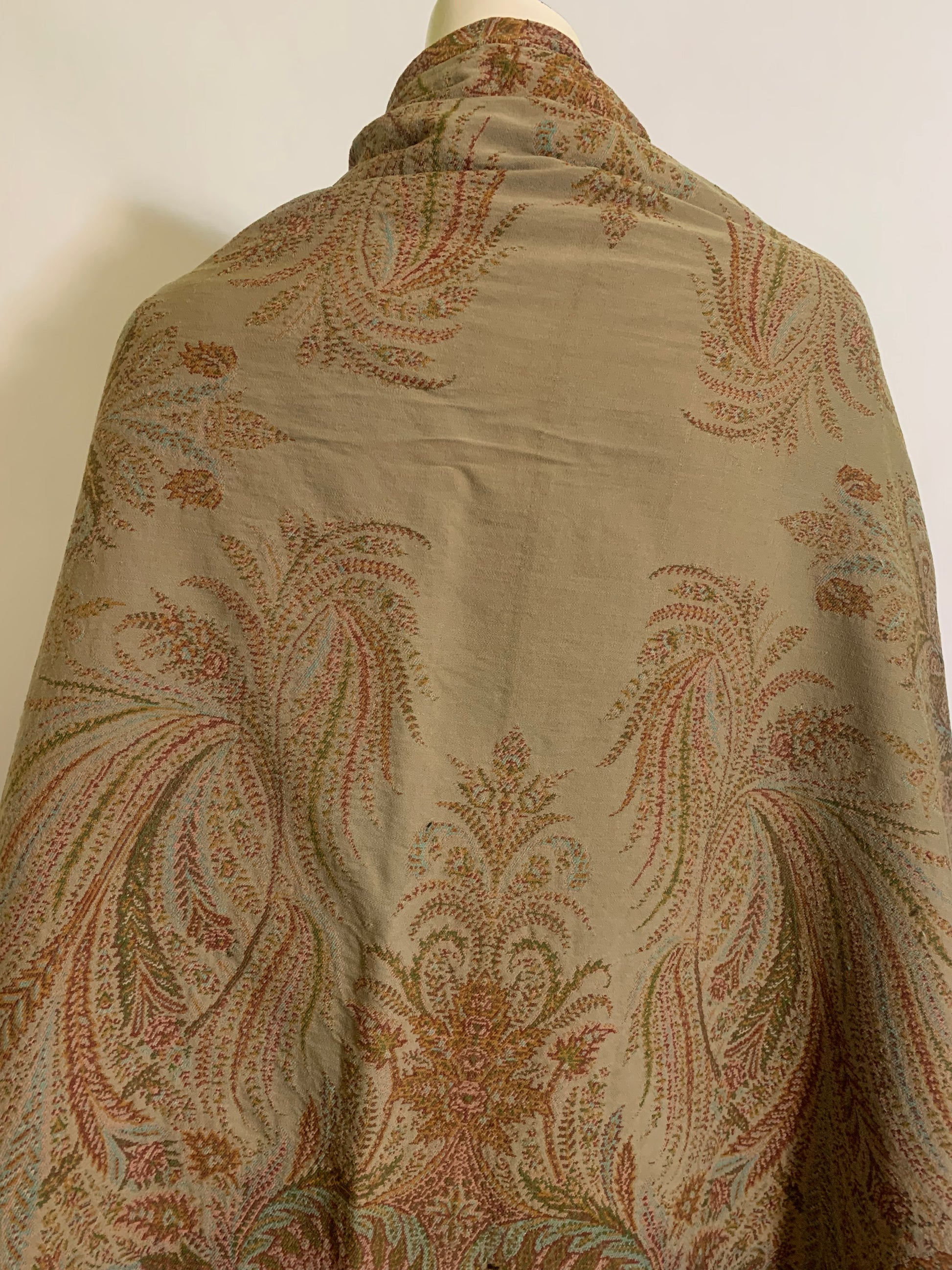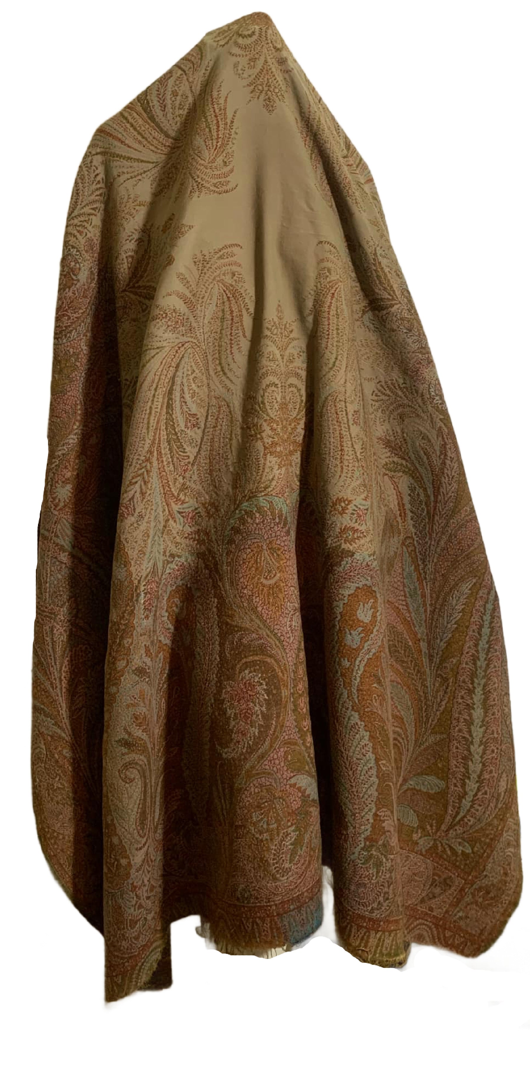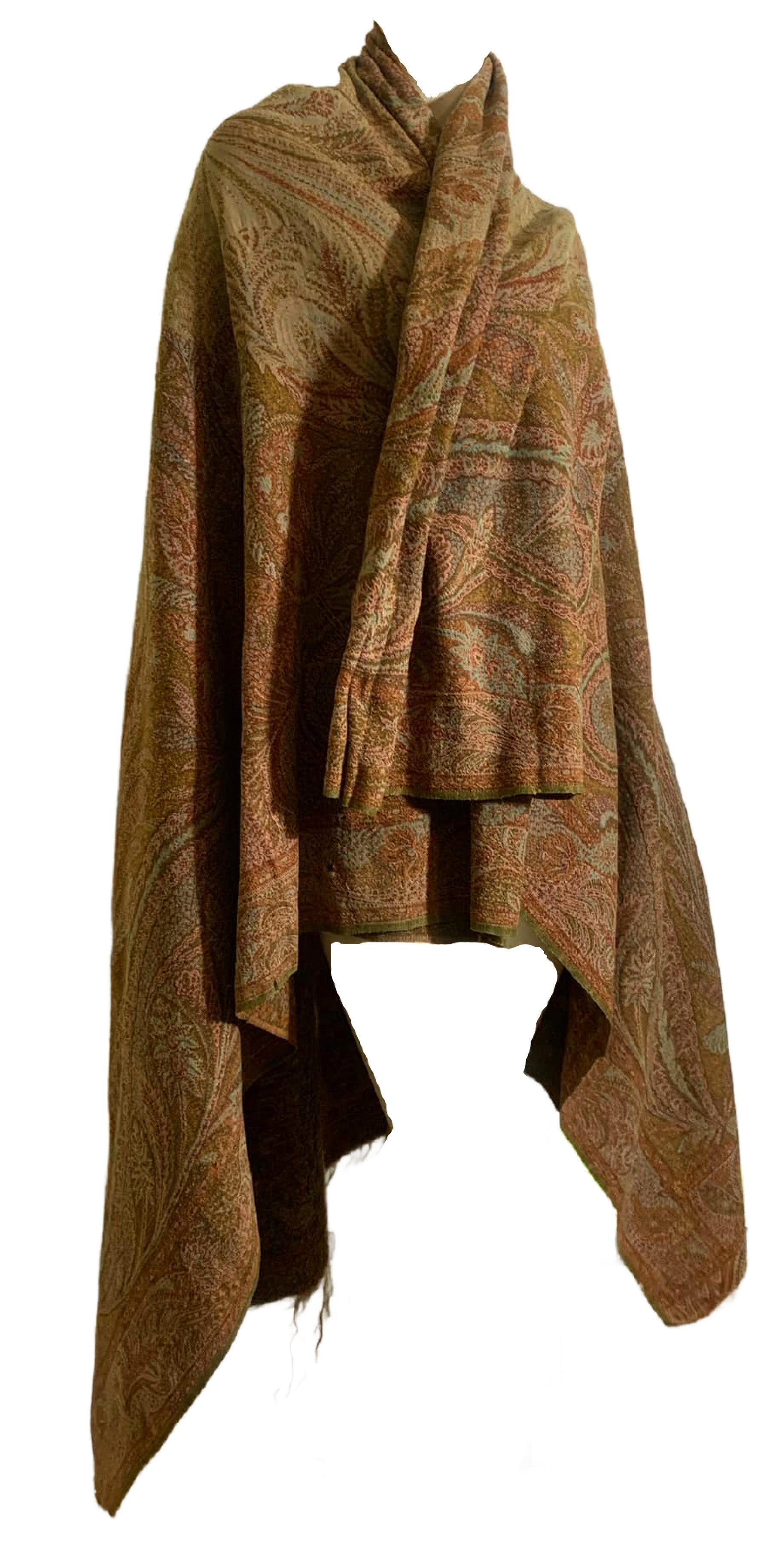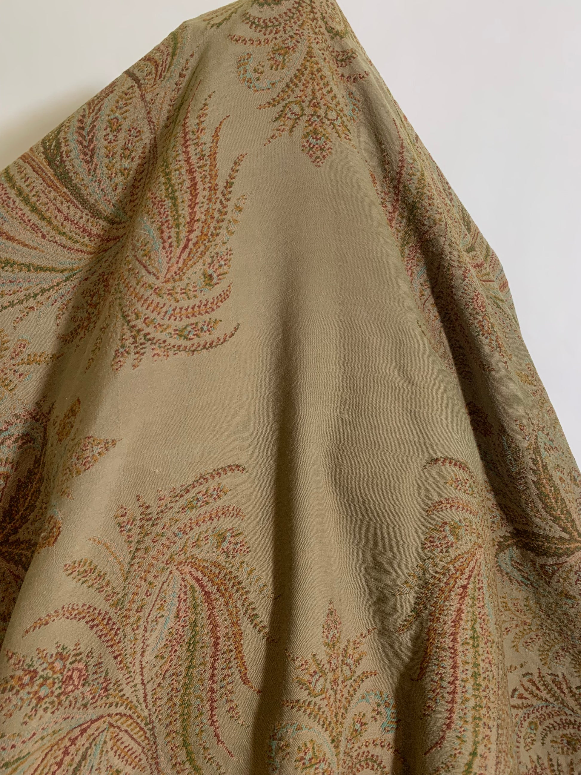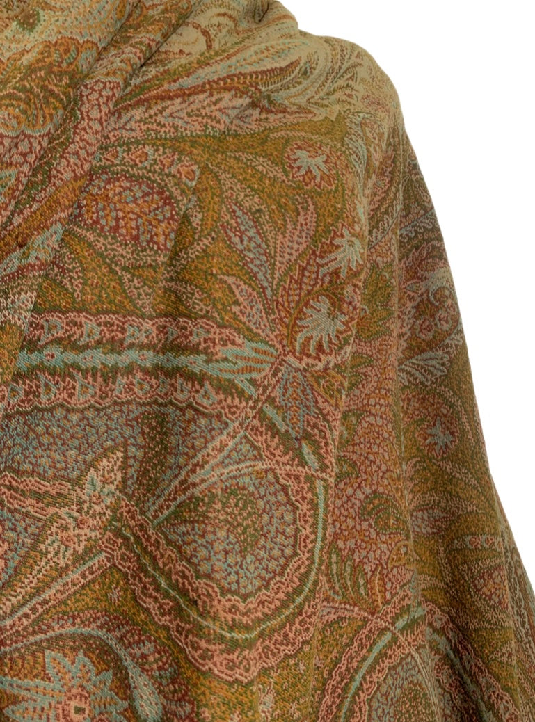 Turn of the Century Sage Green and Terra Cotta Paisley Brocade Wool Shawl circa 1900