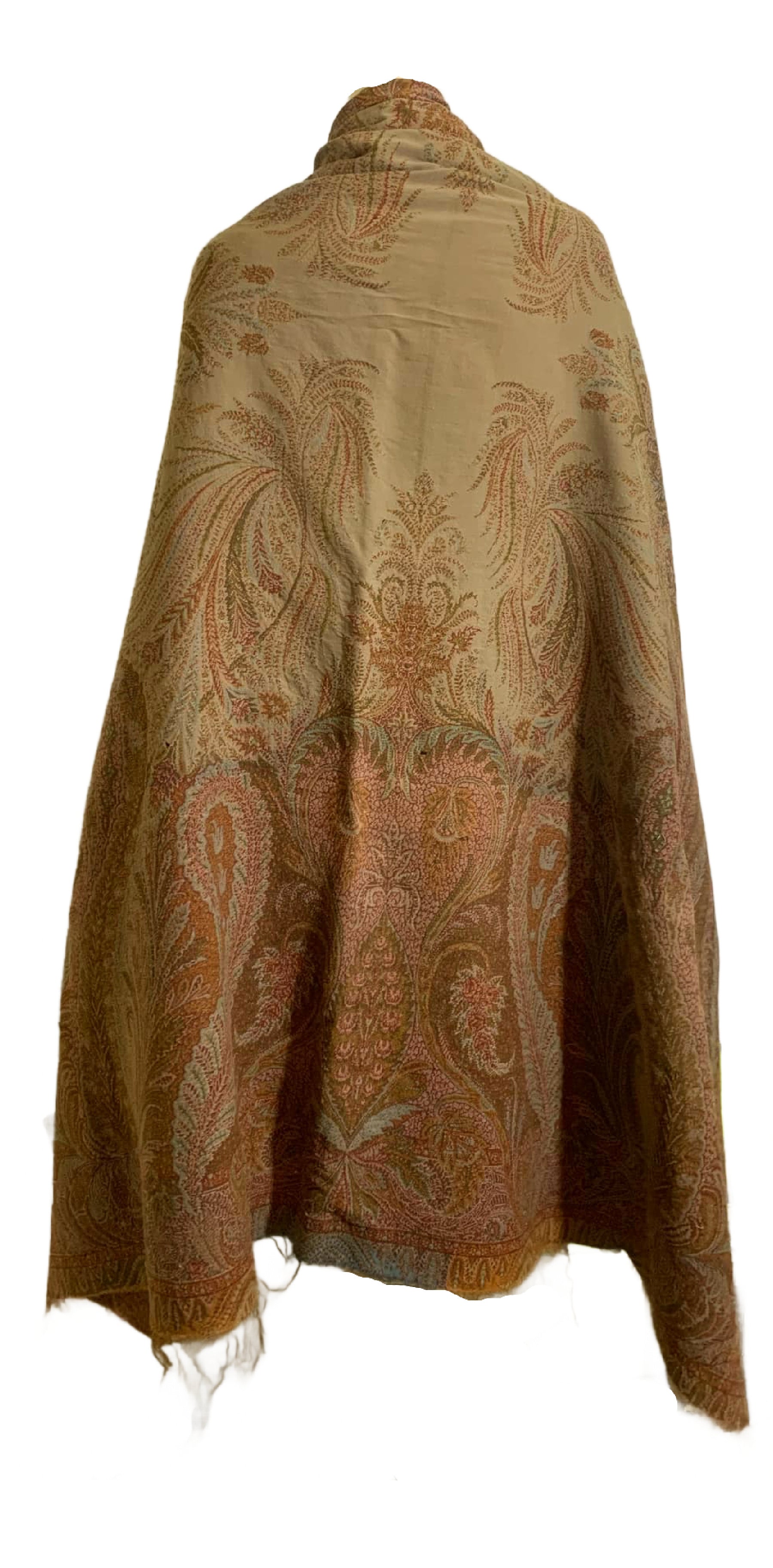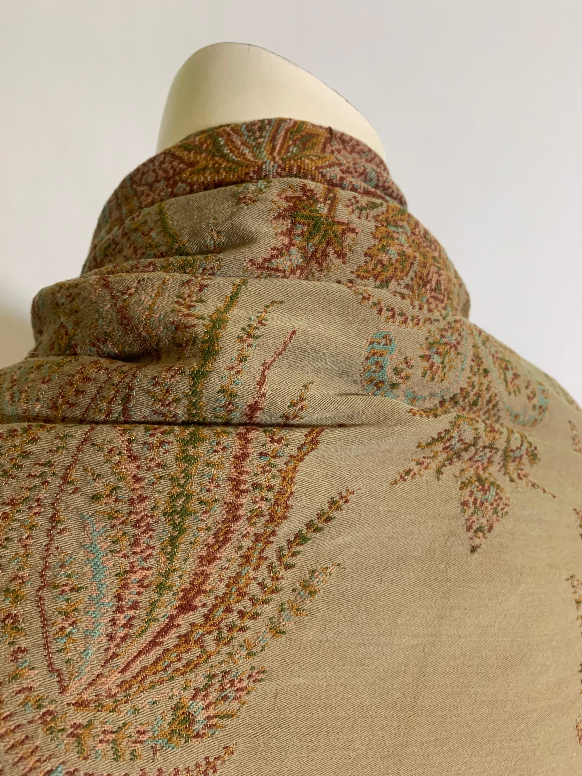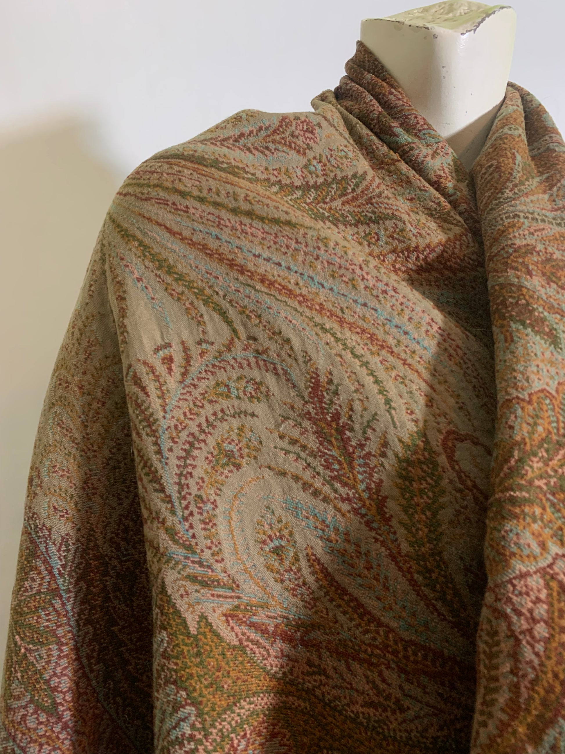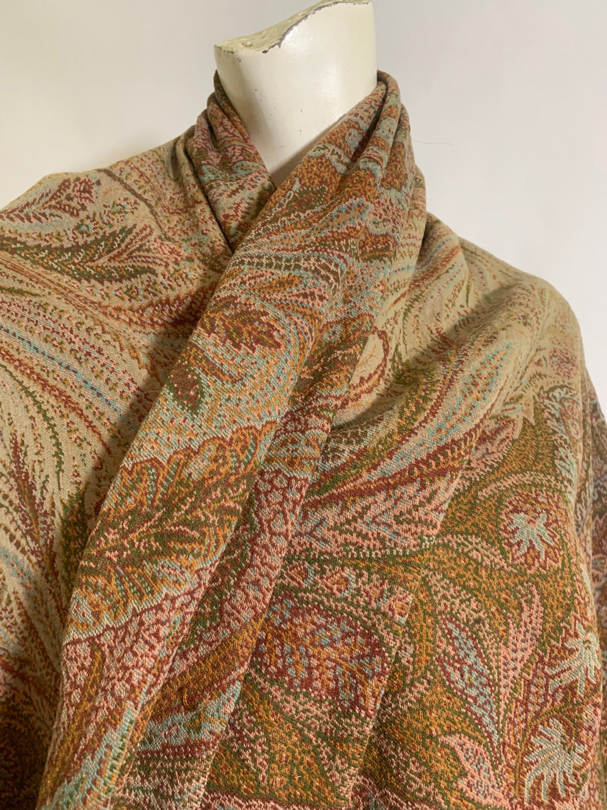 Turn of the Century Sage Green and Terra Cotta Paisley Brocade Wool Shawl circa 1900