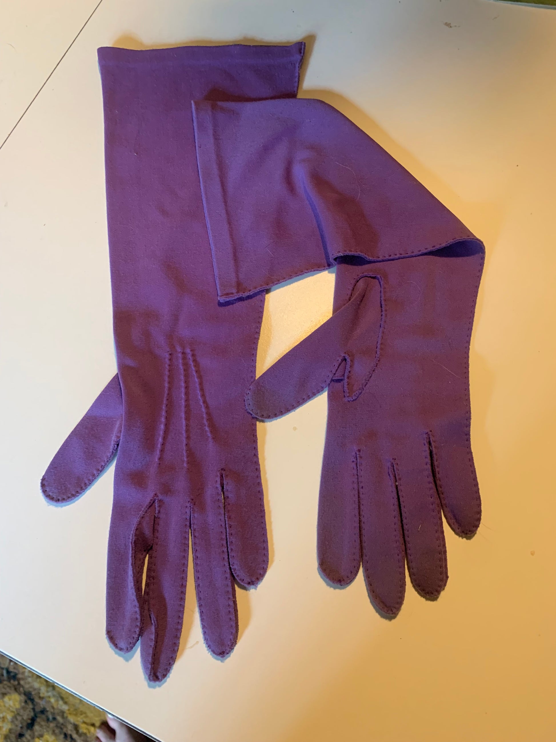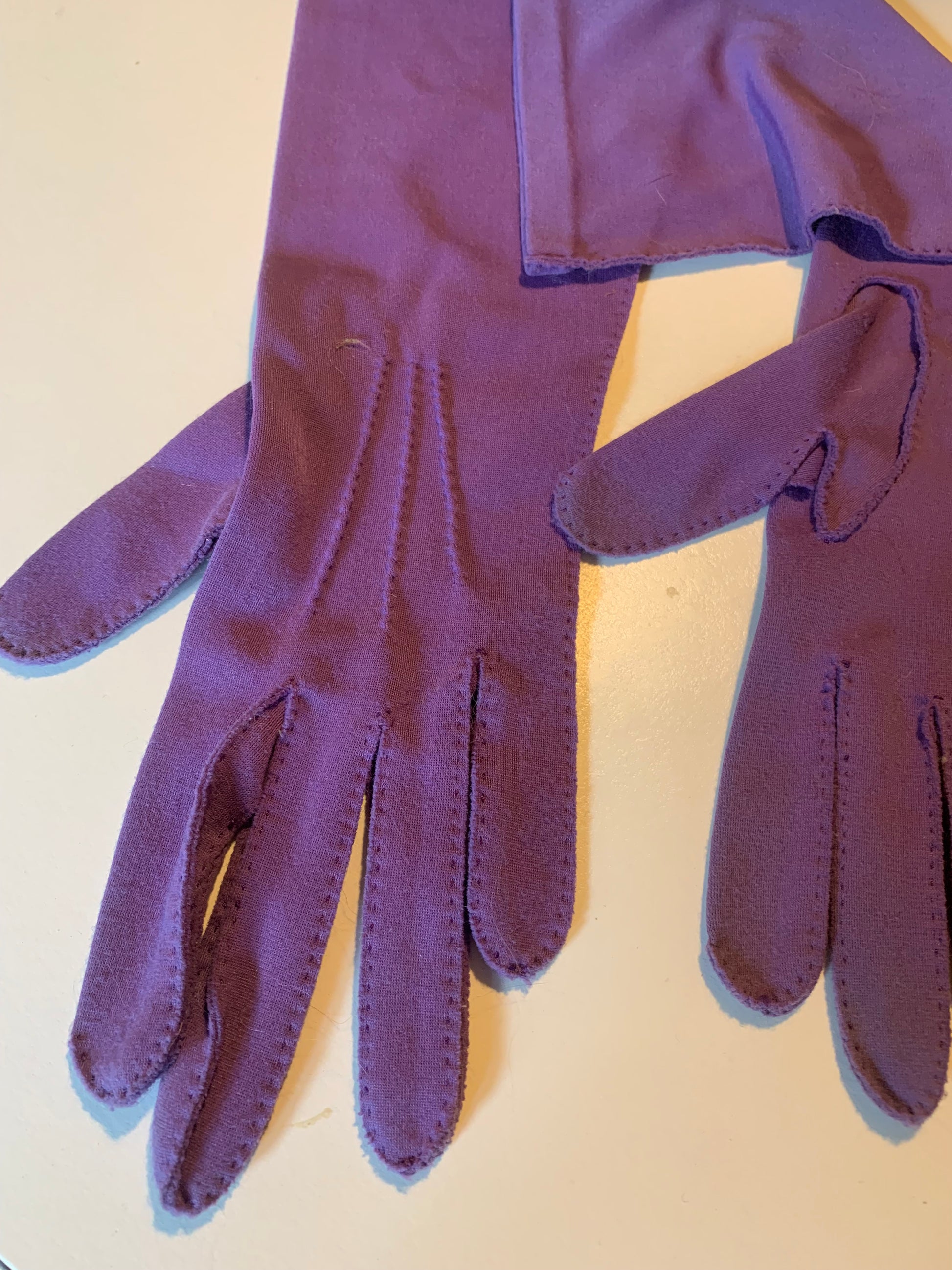 Violet purple brushed nylon 1960s gloves, mid-forearm length. Top stitched detail. No size, no label. Best fit S/M. 15" long