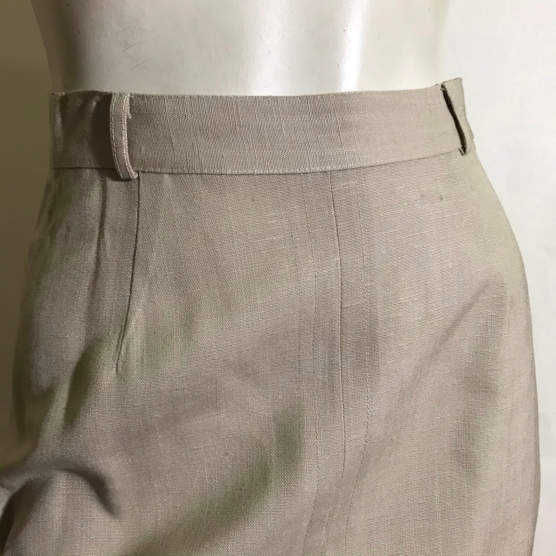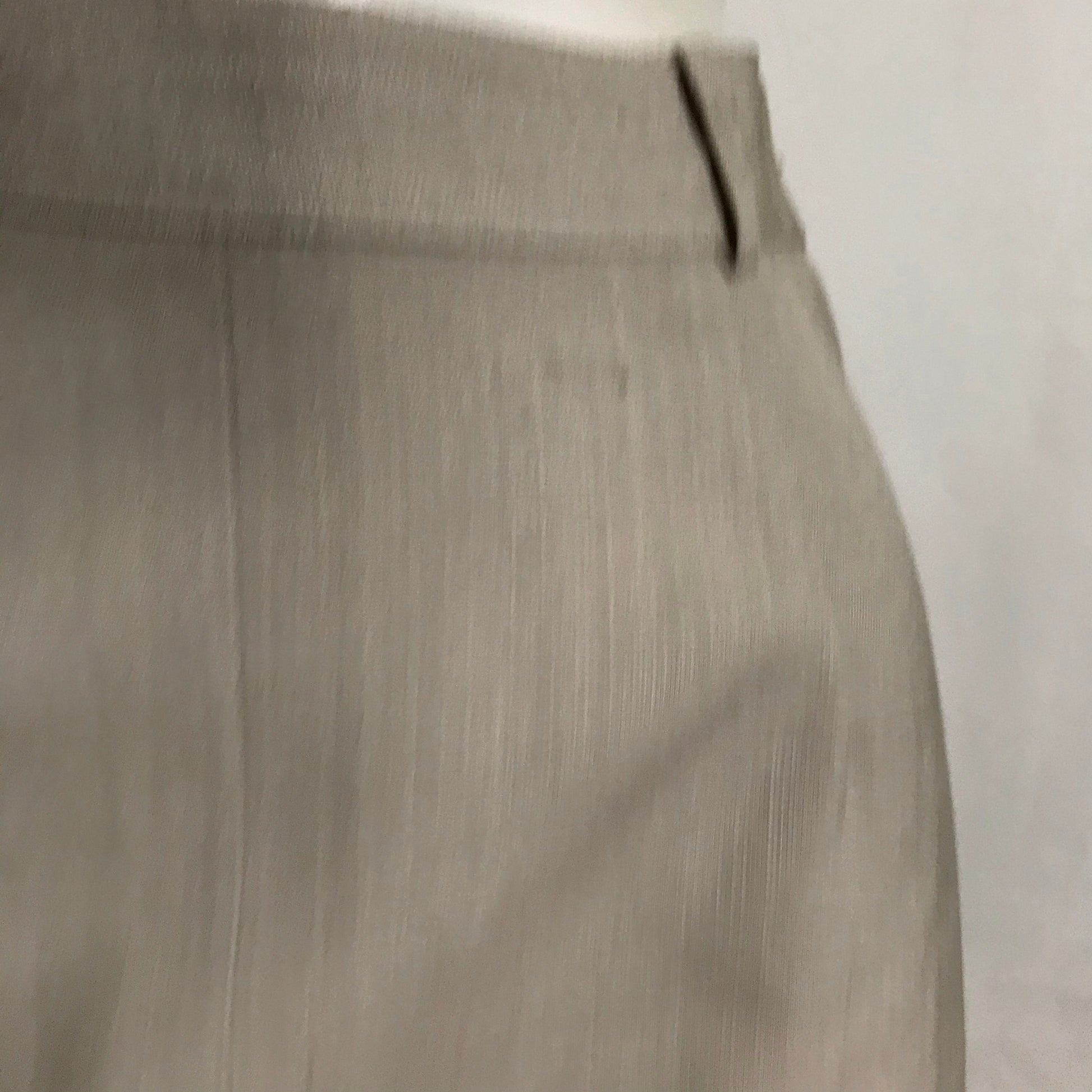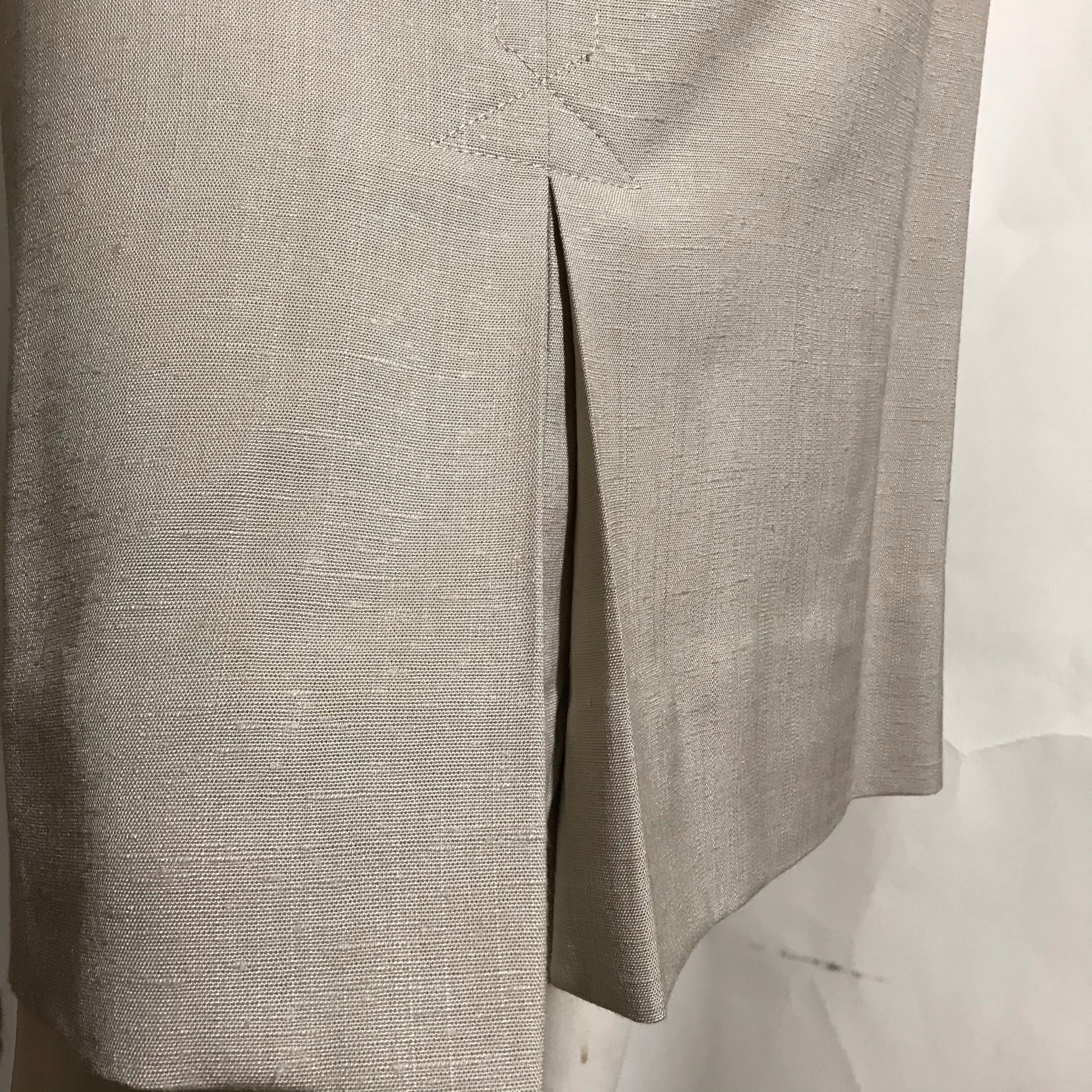 Rayon ivory pencil skirt. Side metal zip and closure, front kick pleat. Lined. Teeny spot as shown.