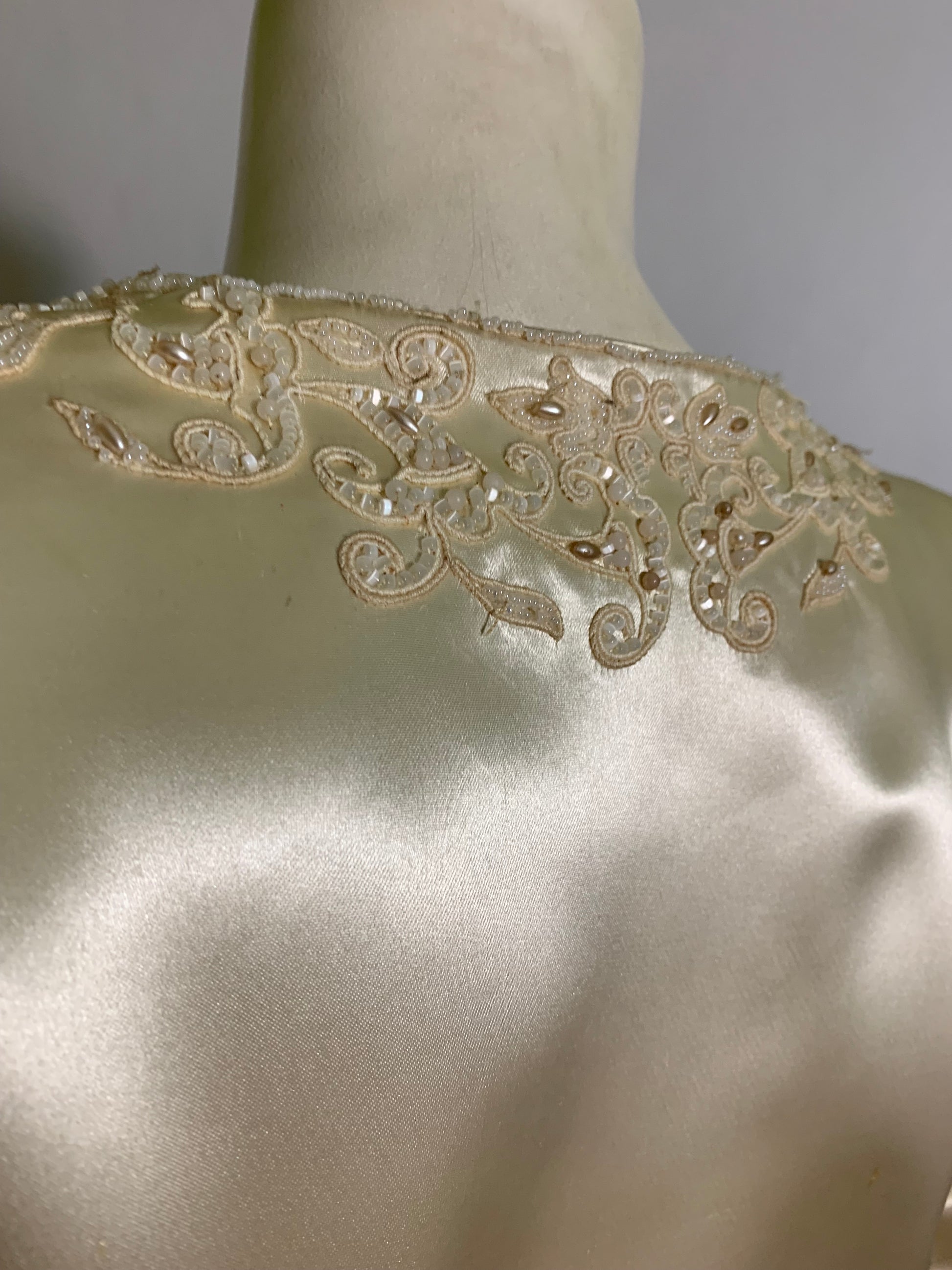 Winter White Slipped Satin Wedding Dress with Beaded Neckline and Hip Accents circa 1940s