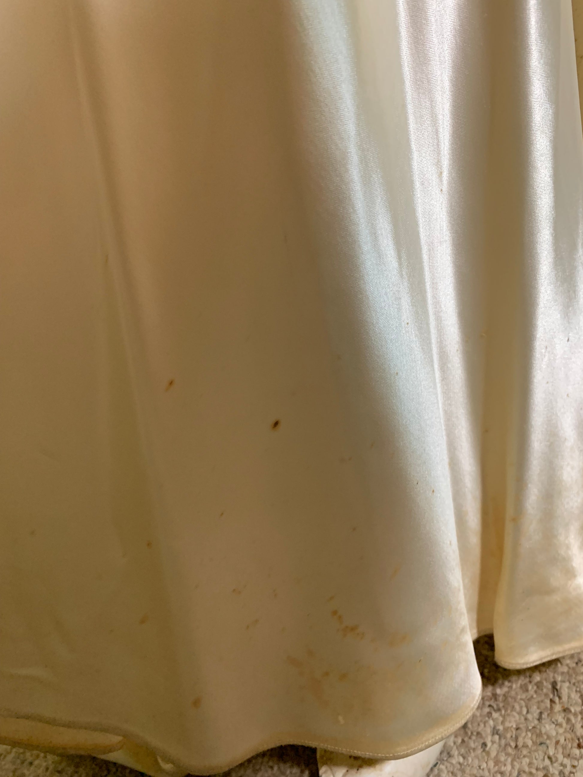 1940s slipper satin wedding dress with padded shoulders, beaded sweetheart neckline and hip ruffles with beading as well. Long sleeves with peaked cuffs and bridal buttons. Side metal zipper. Some spots as shown. no label.